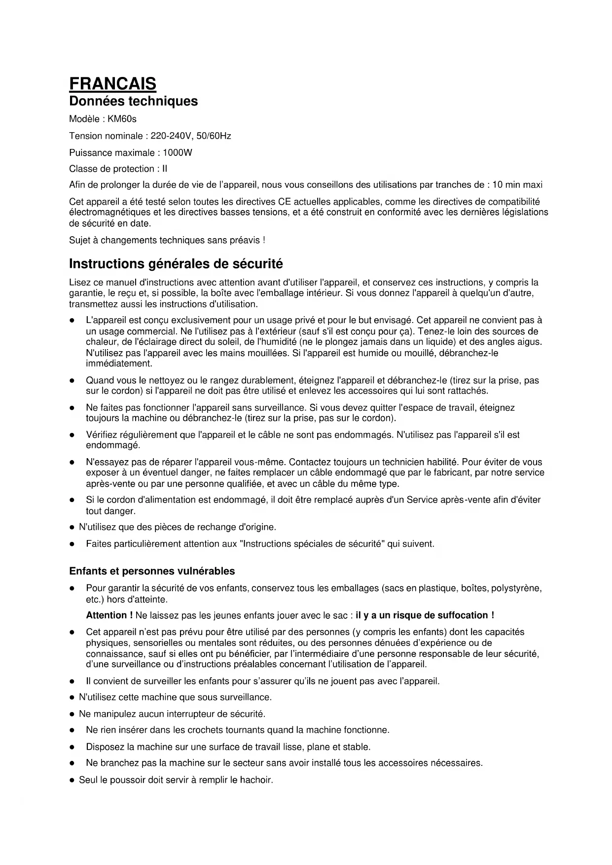The blade of the mincer is very sharp! Danger of injury!FRANCAIS Données techniques Modèle : KM60s Tension nominale : 220-240V, 50/60Hz Puissance maximale : 1000W Classe de protection : II Afin de prolonger la durée de vie de l’appareil, nous vous conseillons des utilisations par tranches de : 10 min maxi Cet appareil a été testé selon toutes les directives CE actuelles applicables, comme les directives de compatibilité électromagnétiques et les directives basses tensions, et a été construit en conformité avec les dernières législations de sécurité en date. Sujet à changements techniques sans préavis ! Instructions générales de sécurité Lisez ce manuel d'instructions avec attention avant d'utiliser l'appareil, et conservez ces instructions, y compris la garantie, le reçu et, si possible, la boîte avec l'emballage intérieur. Si vous donnez l'appareil à quelqu'un d'autre, transmettez aussi les instructions d'utilisation. L'appareil est conçu exclusivement pour un usage privé et pour le but envisagé. Cet appareil ne convient pas à un usage commercial. Ne l'utilisez pas à l'extérieur (sauf s'il est conçu pour ça). Tenez-le loin des sources de chaleur, de l'éclairage direct du soleil, de l'humidité (ne le plongez jamais dans un liquide) et des angles aigus. N'utilisez pas l'appareil avec les mains mouillées. Si l'appareil est humide ou mouillé, débranchez-le immédiatement. Quand vous le nettoyez ou le rangez durablement, éteignez l'appareil et débranchez-le (tirez sur la prise, pas sur le cordon) si l'appareil ne doit pas être utilisé et enlevez les accessoires qui lui sont rattachés. Ne faites pas fonctionner l'appareil sans surveillance. Si vous devez quitter l'espace de travail, éteignez toujours la machine ou débranchez-le (tirez sur la prise, pas sur le cordon). Vérifiez régulièrement que l'appareil et le câble ne sont pas endommagés. N'utilisez pas l'appareil s'il est endommagé. N'essayez pas de réparer l'appareil vous-même. Contactez toujours un technicien habilité. Pour éviter de vous exposer à un éventuel danger, ne faites remplacer un câble endommagé que par le fabricant, par notre service après-vente ou par une personne qualifiée, et avec un câble du même type. Si le cordon d'alimentation est endommagé, il doit être remplacé auprès d'un Service après-vente afin d'éviter tout danger. N'utilisez que des pièces de rechange d'origine. Faites particulièrement attention aux "Instructions spéciales de sécurité" qui suivent. Enfants et personnes vulnérables Pour garantir la sécurité de vos enfants, conservez tous les emballages (sacs en plastique, boîtes, polystyrène, etc.) hors d'atteinte. Attention ! Ne laissez pas les jeunes enfants jouer avec le sac : il y a un risque de suffocation ! Cet appareil n’est pas prévu pour être utilisé par des personnes (y compris les enfants) dont les capacités physiques, sensorielles ou mentales sont réduites, ou des personnes dénuées d’expérience ou de connaissance, sauf si elles ont pu bénéficier, par l’intermédiaire d’une personne responsable de leur sécurité, d’une surveillance ou d’instructions préalables concernant l’utilisation de l’appareil. Il convient de surveiller les enfants pour s’assurer qu’ils ne jouent pas avec l’appareil. N'utilisez cette machine que sous surveillance. Ne manipulez aucun interrupteur de sécurité. Ne rien insérer dans les crochets tournants quand la machine fonctionne. Disposez la machine sur une surface de travail lisse, plane et stable. Ne branchez pas la machine sur le secteur sans avoir installé tous les accessoires nécessaires. Seul le poussoir doit servir à remplir le hachoir. Risque de surcharge ! Utilisez l'appareil comme un hachoir ou un mixer, mais jamais les deux à la fois. Aperçu des composants