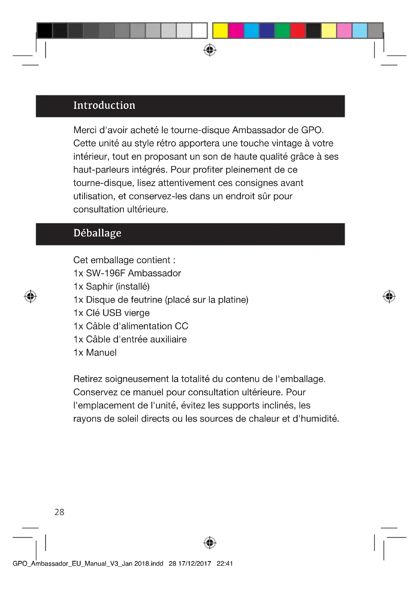 GPO_Ambassador_EU_Manual_V3_Jan 2018.indd 27 17/12/2017 22:4128 Introduction Merci d'avoir acheté le tourne-disque Ambassador de GPO. Cette unité au style rétro apportera une touche vintage à votre intérieur, tout en proposant un son de haute qualité grâce à ses haut-parleurs intégrés. Pour profiter pleinement de ce tourne-disque, lisez attentivement ces consignes avant utilisation, et conservez-les dans un endroit sûr pour consultation ultérieure. Cet emballage contient : 1x SW-196F Ambassador 1x Saphir (installé) 1x Disque de feutrine (placé sur la platine) 1x Clé USB vierge 1x Câble d'alimentation CC 1x Câble d'entrée auxiliaire 1x Manuel Retirez soigneusement la totalité du contenu de l'emballage. Conservez ce manuel pour consultation ultérieure. Pour l'emplacement de l'unité, évitez les supports inclinés, les rayons de soleil directs ou les sources de chaleur et d'humidité. Déballage GPO_Ambassador_EU_Manual_V3_Jan 2018.indd 28 17/12/2017 22:4129 Options Votre Ambassador est doté des options suivantes :