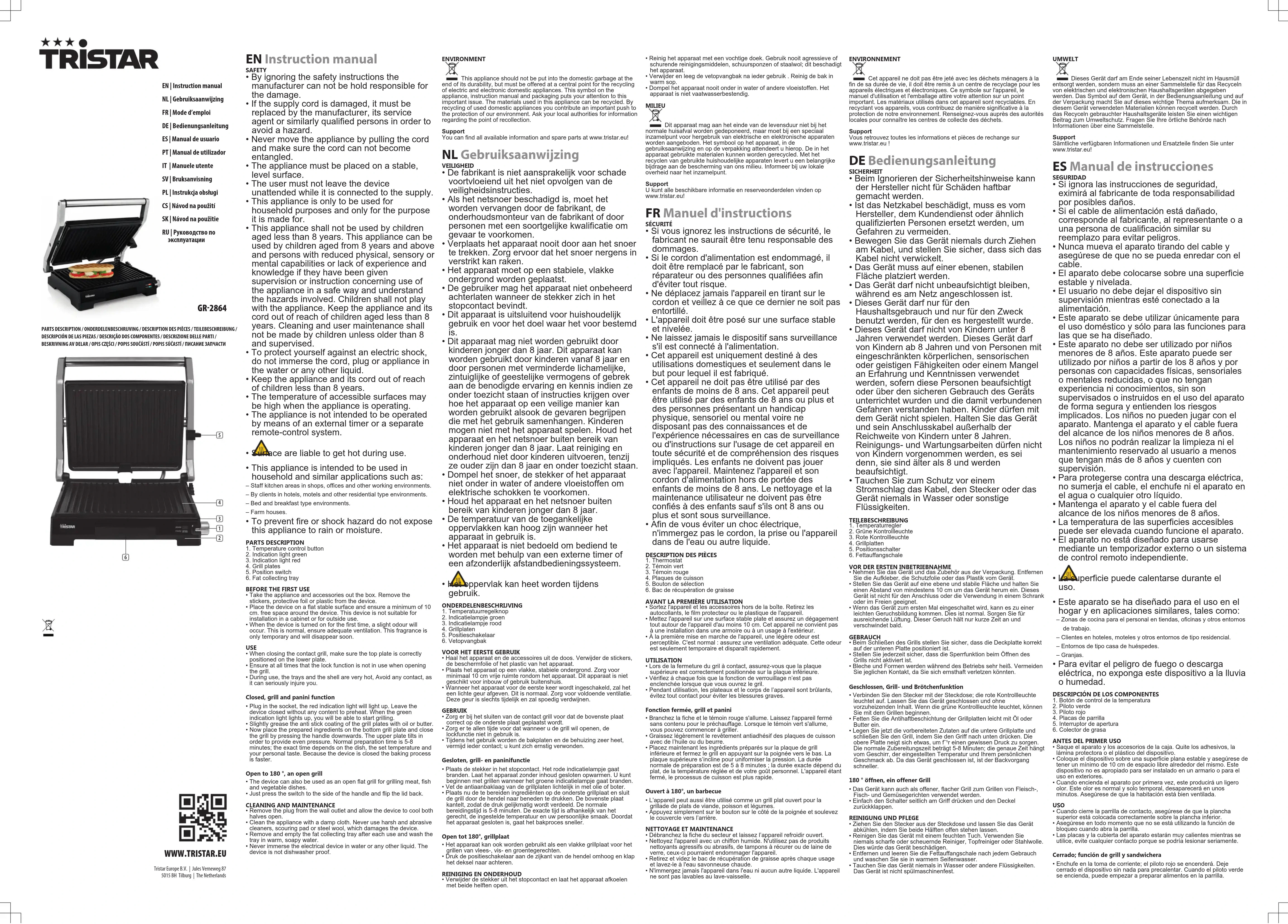 - Afin de vous éviter un choc électrique, n'immergez pas le cordon, la prise ou l'appareil dans de l'eau ou autre liquide. DESCRIPTION DES PIÈCES1. Thermostat2. Témoin vert3. Témoin rouge4. Plaques de cuisson5. Bouton de sélection6. Bac de récupération de graisseAVANT LA PREMIÈRE UTILISATION• Sortez l'appareil et les accessoires hors de la boîte.Retirez lesautocollants, le film protecteur ou le plastique de l'appareil.• Mettez l'appareil sur une surface stable plate et assurez un dégagementtout autour de l'appareil d'au moins 10 cm. Cet appareil ne convient pasà une installation dans une armoire ou à un usage à l'extérieur.• À la première mise en marche de l'appareil, une légère odeur estperceptible. C'est normal : assurez une ventilation adéquate. Cette odeurest seulement temporaire et disparaît rapidement.UTILISATION• Lors de la fermeture du gril à contact, assurez-vous que la plaquesupérieure est correctement positionnée sur la plaque inférieure.• Vérifiez à chaque fois que la fonction de verrouillage n’est pasenclenchée lorsque que vous ouvrez le gril.• Pendant utilisation, les plateaux et le corps de l’appareil sont brûlants,évitez tout contact pour éviter les blessures graves.Fonction fermée, grill et panini• Branchez la fiche et le témoin rouge s'allume. Laissez l'appareil fermésans contenu pour le préchauffage. Lorsque le témoin vert s'allume,vous pouvez commencer à griller.• Graissez légèrement le revêtement antiadhésif des plaques de cuissonavec de l’huile ou du beurre.• Placez maintenant les ingrédients préparés sur la plaque de grillinférieure et fermez le grill en appuyant sur la poignée vers le bas. Laplaque supérieure s’incline pour uniformiser la pression. La duréenormale de préparation est de 5 à 8minutes; la durée exacte dépend duplat, de la température réglée et de votre goût personnel. L'appareil étantfermé, le processus de cuisson est plus rapide.Ouvert à 180°, un barbecue• L’appareil peut aussi être utilisé comme un grill plat ouvert pour lagrillade de plats de viande, poisson et légumes.• Appuyez simplement sur le bouton sur le côté de la poignée et soulevezle couvercle vers l’arrière.NETTOYAGE ET MAINTENANCE• Débranchez la fiche du secteur et laissez l’appareil refroidir ouvert.• Nettoyez l'appareil avec un chiffon humide. N'utilisez pas de produitsnettoyants agressifs ou abrasifs, de tampons à récurer ou de laine deverre, ceux-ci pourraient endommager l'appareil.• Retirez et videz le bac de récupération de graisse après chaque usageet lavez-le à l'eau savonneuse chaude.• N'immergez jamais l'appareil dans l'eau ni aucun autre liquide. L'appareilne sont pas lavables au lave-vaisselle.ENVIRONNEMENTCet appareil ne doit pas être jeté avec les déchets ménagers à lafin de sa durée de vie, il doit être remis à un centre de recyclage pour lesappareils électriques et électroniques. Ce symbole sur l'appareil, lemanuel d'utilisation et l'emballage attire votre attention sur un pointimportant. Les matériaux utilisés dans cet appareil sont recyclables. Enrecyclant vos appareils, vous contribuez de manière significative à laprotection de notre environnement. Renseignez-vous auprès des autoritéslocales pour connaître les centres de collecte des déchets.SupportVous retrouvez toutes les informations et pièces de rechange surwww.tristar.eu! DEBedienungsanleitung SICHERHEIT