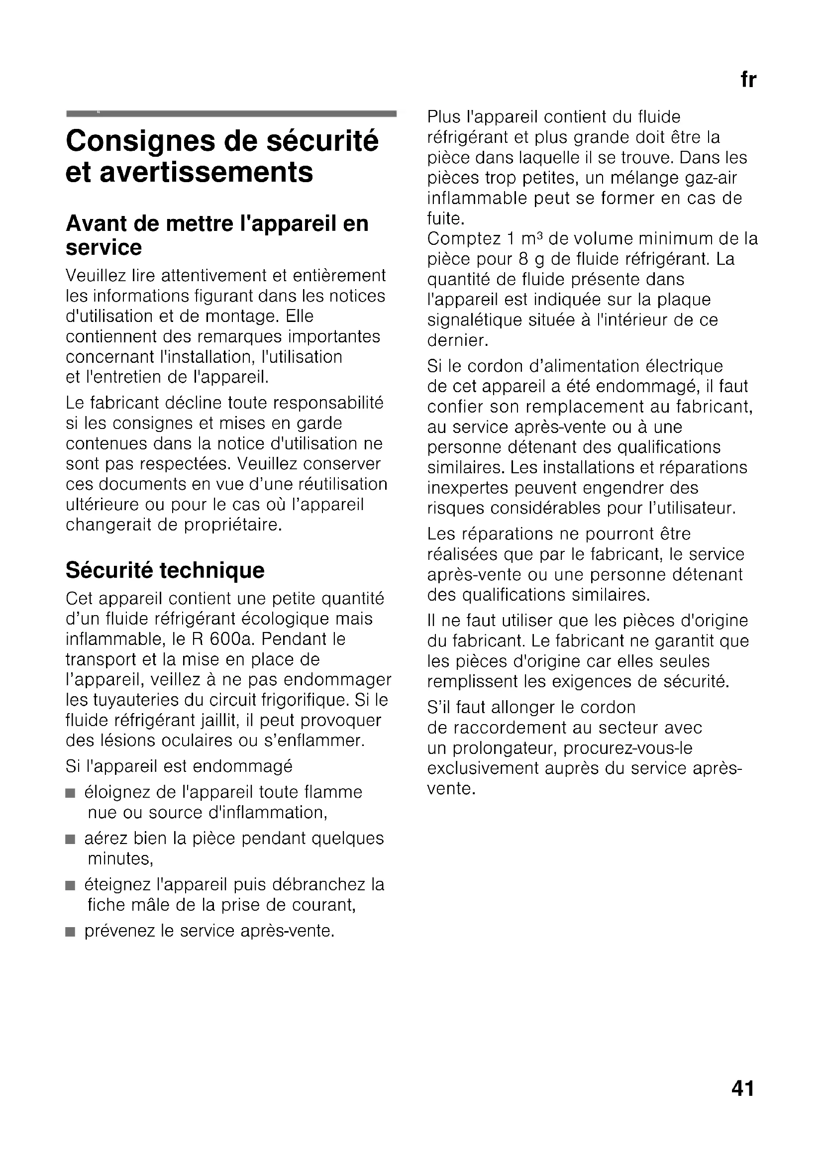 fr Table d es mat ières frMode d’emploi Consignes de sécurité et avertissements Avant de mettre l'appareil en service Veuillez lire attentivement et entièrement les informations figurant dans les notices d'utilisation et de montage. Elle contiennent des remarques importantes concernant l'installation, l'utilisation et l'entretien de l'appareil. Le fabricant décline toute responsabilité si les consignes et mises en garde contenues dans la notice d'utilisation ne sont pas respectées. Veuillez conserver ces documents en vue d’une réutilisation ultérieure ou pour le cas où l’appareil changerait de propriétaire. Sécurité technique Cet appareil contient une petite quantité d’un fluide réfrigérant écologique mais inflammable, le R 600a. Pendant le transport et la mise en place de l’appareil, veillez à ne pas endommager les tuyauteries du circuit frigorifique. Si le fluide réfrigérant jaillit, il peut provoquer des lésions oculaires ou s’enflammer. Si l'appareil est endommagé ■ éloignez de l'appareil toute flamme nue ou source d'inflammation, ■ aérez bien la pièce pendant quelques minutes, ■ éteignez l'appareil puis débranchez la fiche mâle de la prise de courant, ■ prévenez le service après-vente. Plus l'appareil contient du fluide réfrigérant et plus grande doit être la pièce dans laquelle il se trouve. Dans les pièces trop petites, un mélange gaz-air inflammable peut se former en cas de fuite. Comptez 1 m³ de volume minimum de la pièce pour 8 g de fluide réfrigérant. La quantité de fluide présente dans l'appareil est indiquée sur la plaque signalétique située à l'intérieur de ce dernier. Si le cordon d’alimentation électrique de cet appareil a été endommagé, il faut confier son remplacement au fabricant, au service après-vente ou à une personne détenant des qualifications similaires. Les installations et réparations inexpertes peuvent engendrer des risques considérables pour l’utilisateur. Les réparations ne pourront être réalisées que par le fabricant, le service après-vente ou une personne détenant des qualifications similaires. Il ne faut utiliser que les pièces d'origine du fabricant. Le fabricant ne garantit que les pièces d'origine car elles seules remplissent les exigences de sécurité. S’il faut allonger le cordon de raccordement au secteur avec un prolongateur, procurez-vous-le exclusivement auprès du service après- vente.fr
