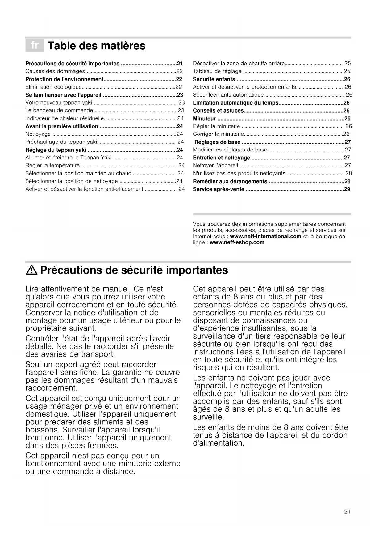 - Service après-vente Produktinfo Vous trouverez des informations supplementaires concernant les produits, accessoires, pièces de rechange et services sur Internet sous : www.neff-international.com et la boutique en ligne : www.neff-eshop.com : Précautions de sécurité importantes Lire attentivement ce manuel. Ce n'est qu'alors que vous pourrez utiliser votre appareil correctement et en toute sécurité. Conserver la notice d'utilisation et de montage pour un usage ultérieur ou pour le propriétaire suivant. Contrôler l'état de l'appareil après l'avoir déballé. Ne pas le raccorder s'il présente des avaries de transport. Seul un expert agréé peut raccorder l'appareil sans fiche. La garantie ne couvre pas les dommages résultant d'un mauvais raccordement. Cet appareil est conçu uniquement pour un usage ménager privé et un environnement domestique. Utiliser l'appareil uniquement pour préparer des aliments et des boissons. Surveiller l'appareil lorsqu'il fonctionne. Utiliser l'appareil uniquement dans des pièces fermées. Cet appareil n'est pas conçu pour un fonctionnement avec une minuterie externe ou une commande à distance. Cet appareil peut être utilisé par des enfants de 8 ans ou plus et par des personnes dotées de capacités physiques, sensorielles ou mentales réduites ou disposant de connaissances ou d’expérience insuffisantes, sous la surveillance d'un tiers responsable de leur sécurité ou bien lorsqu'ils ont reçu des instructions liées à l'utilisation de l'appareil en toute sécurité et qu'ils ont intégré les risques qui en résultent. Les enfants ne doivent pas jouer avec l'appareil. Le nettoyage et l'entretien effectué par l'utilisateur ne doivent pas être accomplis par des enfants, sauf s'ils sont âgés de 8 ans et plus et qu'un adulte les surveille. Les enfants de moins de 8 ans doivent être tenus à distance de l'appareil et du cordon d'alimentation.22 Risque d'incendie ! p. 29