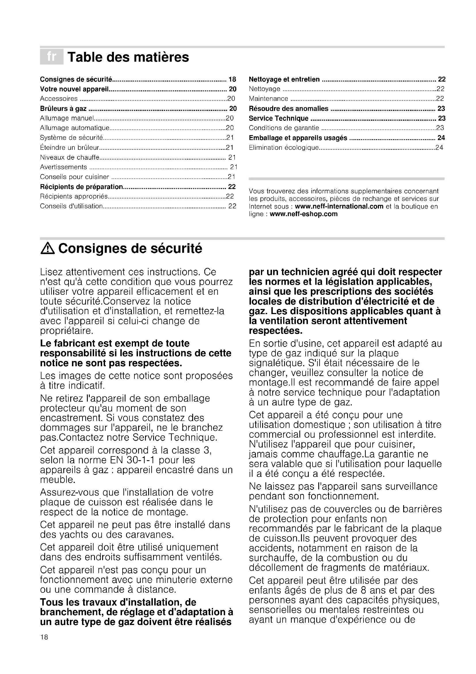 - Elimination écologique Produktinfo Vous trouverez des informations supplementaires concernant les produits, accessoires, pièces de rechange et services sur Internet sous : www.neff-international.com et la boutique en ligne : www.neff-eshop.com : Consignes de sécurité Lisez attentivement ces instructions. Ce n'est qu'à cette condition que vous pourrez utiliser votre appareil efficacement et en toute sécurité.Conservez la notice d'utilisation et d'installation, et remettez-la avec l'appareil si celui-ci change de propriétaire. Le fabricant est exempt de toute responsabilité si les instructions de cette notice ne sont pas respectées. Les images de cette notice sont proposées à titre indicatif. Ne retirez l'appareil de son emballage protecteur qu'au moment de son encastrement. Si vous constatez des dommages sur l'appareil, ne le branchez pas.Contactez notre Service Technique. Cet appareil correspond à la classe 3, selon la norme EN 30-1-1 pour les appareils à gaz : appareil encastré dans un meuble. Assurez-vous que l'installation de votre plaque de cuisson est réalisée dans le respect de la notice de montage. Cet appareil ne peut pas être installé dans des yachts ou des caravanes. Cet appareil doit être utilisé uniquement dans des endroits suffisamment ventilés. Cet appareil n'est pas conçu pour un fonctionnement avec une minuterie externe ou une commande à distance. Tous les travaux d'installation, de branchement, de réglage et d'adaptation à un autre type de gaz doivent être réalisés par un technicien agréé qui doit respecter les normes et la législation applicables, ainsi que les prescriptions des sociétés locales de distribution d'électricité et de gaz. Les dispositions applicables quant à la ventilation seront attentivement respectées. En sortie d'usine, cet appareil est adapté au type de gaz indiqué sur la plaque signalétique. S'il était nécessaire de le changer, veuillez consulter la notice de montage.Il est recommandé de faire appel à notre service technique pour l'adaptation à un autre type de gaz. Cet appareil a été conçu pour une utilisation domestique ; son utilisation à titre commercial ou professionnel est interdite. N'utilisez l'appareil que pour cuisiner, jamais comme chauffage.La garantie ne sera valable que si l'utilisation pour laquelle il a été conçu a été respectée. Ne laissez pas l'appareil sans surveillance pendant son fonctionnement. N'utilisez pas de couvercles ou de barrières de protection pour enfants non recommandés par le fabricant de la plaque de cuisson.Ils peuvent provoquer des accidents, notamment en raison de la surchauffe, de la combustion ou du décollement de fragments de matériaux. Cet appareil peut être utilisée par des enfants âgés de plus de 8 ans et par des personnes ayant des capacités physiques, sensorielles ou mentales restreintes ou ayant un manque d'expérience ou de19 connaissances, s'ils sont surveillés ou si une personne les a instruits de la manipulation de l'appareil en toute sécurité et s'ils ont compris les dangers qui en résultent. Les enfants ne doivent pas jouer avec l'appareil. Le nettoyage et l'entretien incombant à l'utilisateur ne doivent pas être effectués par des enfants sans surveillance. Risque de déflagration ! L'accumulation de gaz non brûlés dans un lieu fermé pourrait comporter un risque de déflagration. Ne placez pas l'appareil dans des courants d'air. Les brûleurs pourraient s'éteindre. Lisez attentivement les instructions et les avertissements concernant le fonctionnement des brûleurs à gaz. Risque d'intoxication ! L'utilisation d'un appareil de cuisson à gaz produit de la chaleur, de l'humidité et émet des produits de combustion dans la pièce où il est installé. Assurez-vous que la cuisine soit bien ventilée, en particulier lorsque la plaque de cuisson est en fonctionnement: laissez les orifices de ventilation naturelle ouverts ou installez un dispositif de ventilation mécanique (hotte aspirante).Lorsque l'utilisation de l'appareil est intense et prolongée, une ventilation complémentaire ou plus efficace peut être nécessaire: ouvrez une fenêtre ou augmentez la puissance de la ventilation mécanique. Risque de brûlures ! Les zones de cuisson et les zones adjacentes chauffent fortement.Ne touchez pas les surfaces chaudes. Ne laissez pas les enfants de moins de 8 ans s'approcher. Risque d'incendie ! p. 24