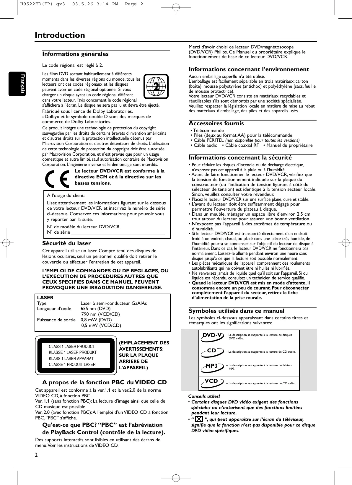 Page 2 Introduction Merci d’avoir choisi ce lecteur DVD/magnétosocope (DVD/VCR) Philips. Ce Manuel du propriétaire explique le fonctionnement de base de ce lecteur DVD/VCR. Informations générales Le code régional est réglé à 2. Français Les films DVD sortant habituellement à différents moments dans les diverses régions du monde, tous les lecteurs ont des codes régionaux et les disques peuvent avoir un code régional optionnel. Si vous chargez un disque ayant un code régional différent dans votre lecteur, l’avis concernant le code régional s’affichera à l’écran. Le disque ne sera pas lu et devra être éjecté. Fabriqué sous licence de Dolby Laboratories. «Dolby» et le symbole double D sont des marques de commerce de Dolby Laboratories. Ce produit intègre une technologie de protection du copyright sauvegardée par les droits de certains brevets d’invention américains et d’autres droits sur la protection intellectuelle détenus par Macrovision Corporation et d’autres détenteurs de droits. L’utilisation de cette technologie de protection du copyright doit être autorisée par Macrovision Corporation, et n’est prévue que pour un usage domestique et autre limité, sauf autorisation contraire de Macrovision Corporation. L’ingénierie inverse et le démontage sont interdits. Le lecteur DVD/VCR est conforme à la directive ECM et à la directive sur les basses tensions.