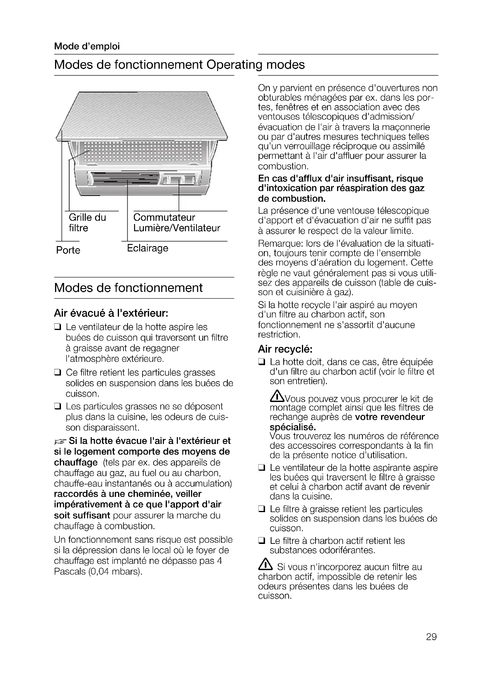 InbouwenOn y parvient en présence d'ouvertures nonobturables ménagées par ex. dans les por-tes, fenêtres et en association avec desventouses télescopiques d'admission/évacuation de l'air à travers la maçonnerieou par d'autres mesures techniques tellesqu'un verrouillage réciproque ou assimilépermettant à l'air d'affluer pour assurer lacombustion.En cas d'afflux d'air insuffisant, risqued'intoxication par réaspiration des gazde combustion.La présence d'une ventouse télescopiqued'apport et d'évacuation d'air ne suffit pasà assurer le respect de la valeur limite.Remarque: lors de l'évaluation de la situati-on, toujours tenir compte de l'ensembledes moyens d'aération du logement. Cetterègle ne vaut généralement pas si vous utili-sez des appareils de cuisson (table de cuis-son et cuisinière à gaz).Si la hotte recycle l'air aspiré au moyend'un filtre au charbon actif, sonfonctionnement ne s'assortit d'aucunerestriction. Air recyclé: K La hotte doit, dans ce cas, être équipéed'un filtre au charbon actif (voir le filtre etson entretien). Vous pouvez vous procurer le kit de montage complet ainsi que les filtres de rechange auprès de votre revendeur spécialisé.Vous trouverez les numéros de référencedes accessoires correspondants à la fin de la présente notice d'utilisation.K Le ventilateur de la hotte aspirante aspireles buées qui traversent le filtre à graisseet celui à charbon actif avant de revenirdans la cuisine.K Le filtre à graisse retient les particulessolides en suspension dans les buées decuisson.K Le filtre à charbon actif retient les substances odoriférantes. Si vous n'incorporez aucun filtre au charbon actif, impossible de retenir lesodeurs présentes dans les buées de cuisson. Modes de fonctionnement Air évacué à l'extérieur: K Le ventilateur de la hotte aspire lesbuées de cuisson qui traversent un filtreà graisse avant de regagner l'atmosphère extérieure.K Ce filtre retient les particules grassessolides en suspension dans les buées decuisson.K Les particules grasses ne se déposentplus dans la cuisine, les odeurs de cuis-son disparaissent. Si la hotte évacue l'air à l'extérieur etsi le logement comporte des moyens dechauffage (tels par ex. des appareils dechauffage au gaz, au fuel ou au charbon,chauffe-eau instantanés ou à accumulation)raccordés à une cheminée, veillerimpérativement à ce que l'apport d'airsoit suffisant pour assurer la marche duchauffage à combustion.Un fonctionnement sans risque est possiblesi la dépression dans le local où le foyer dechauffage est implanté ne dépasse pas 4Pascals (0,04 mbars). Porte Grille du filtre Eclairage Commutateur Lumière/Ventilateur