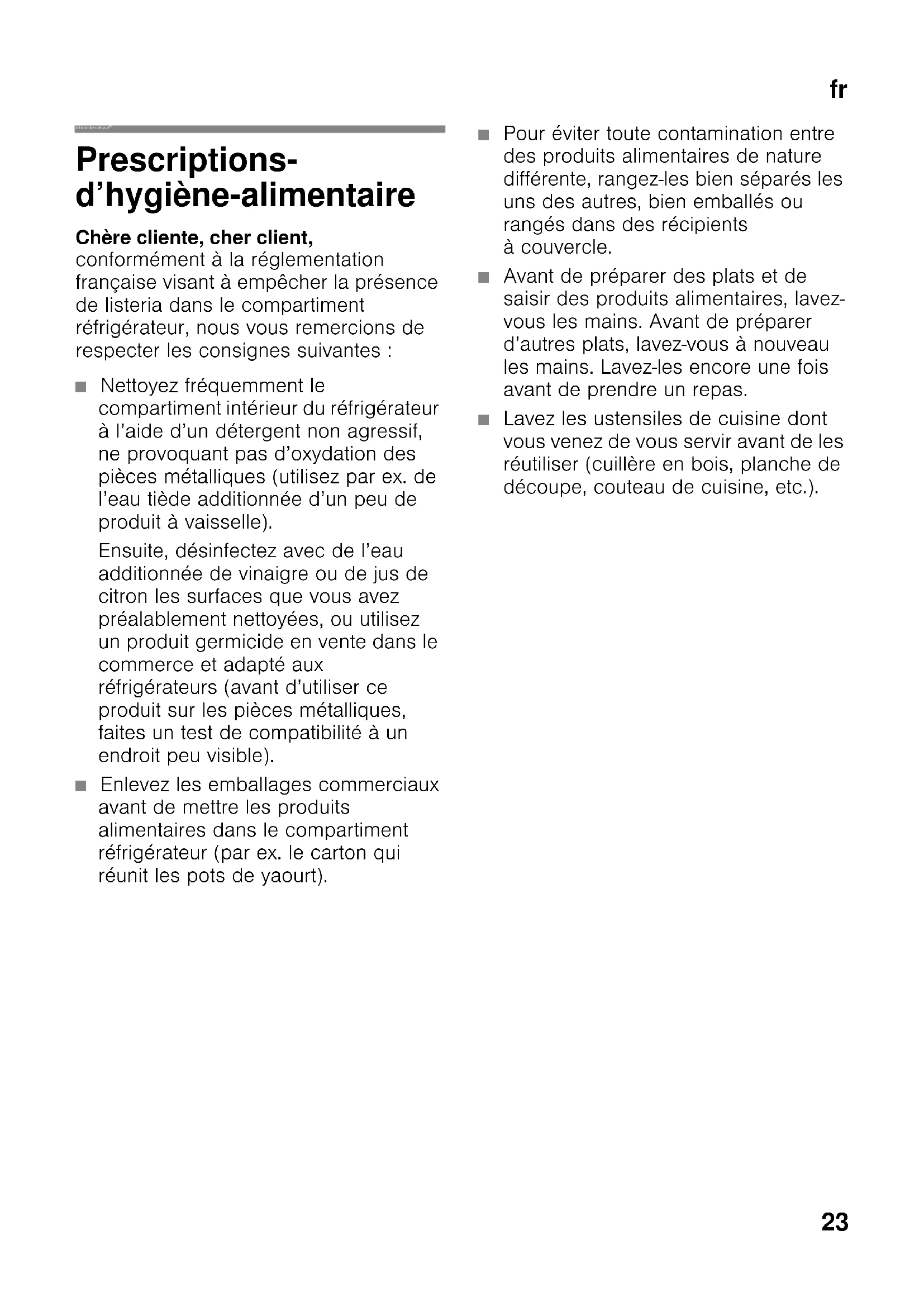 frTable des matières frMode d’emploi Prescriptions- d’hygiène-alimentaire Chère cliente, cher client, conformément à la réglementation française visant à empêcher la présence de listeria dans le compartiment réfrigérateur, nous vous remercions de respecter les consignes suivantes : ■ Nettoyez fréquemment le compartiment intérieur du réfrigérateur à l’aide d’un détergent non agressif, ne provoquant pas d’oxydation des pièces métalliques (utilisez par ex. de l’eau tiède additionnée d’un peu de produit à vaisselle). Ensuite, désinfectez avec de l’eau additionnée de vinaigre ou de jus de citron les surfaces que vous avez préalablement nettoyées, ou utilisez un produit germicide en vente dans le commerce et adapté aux réfrigérateurs (avant d’utiliser ce produit sur les pièces métalliques, faites un test de compatibilité à un endroit peu visible). ■ Enlevez les emballages commerciaux avant de mettre les produits alimentaires dans le compartiment réfrigérateur (par ex. le carton qui réunit les pots de yaourt). ■ Pour éviter toute contamination entre des produits alimentaires de nature différente, rangez-les bien séparés les uns des autres, bien emballés ou rangés dans des récipients à couvercle. ■ Avant de préparer des plats et de saisir des produits alimentaires, lavez- vous les mains. Avant de préparer d’autres plats, lavez-vous à nouveau les mains. Lavez-les encore une fois avant de prendre un repas. ■ Lavez les ustensiles de cuisine dont vous venez de vous servir avant de les réutiliser (cuillère en bois, planche de découpe, couteau de cuisine, etc.).fr