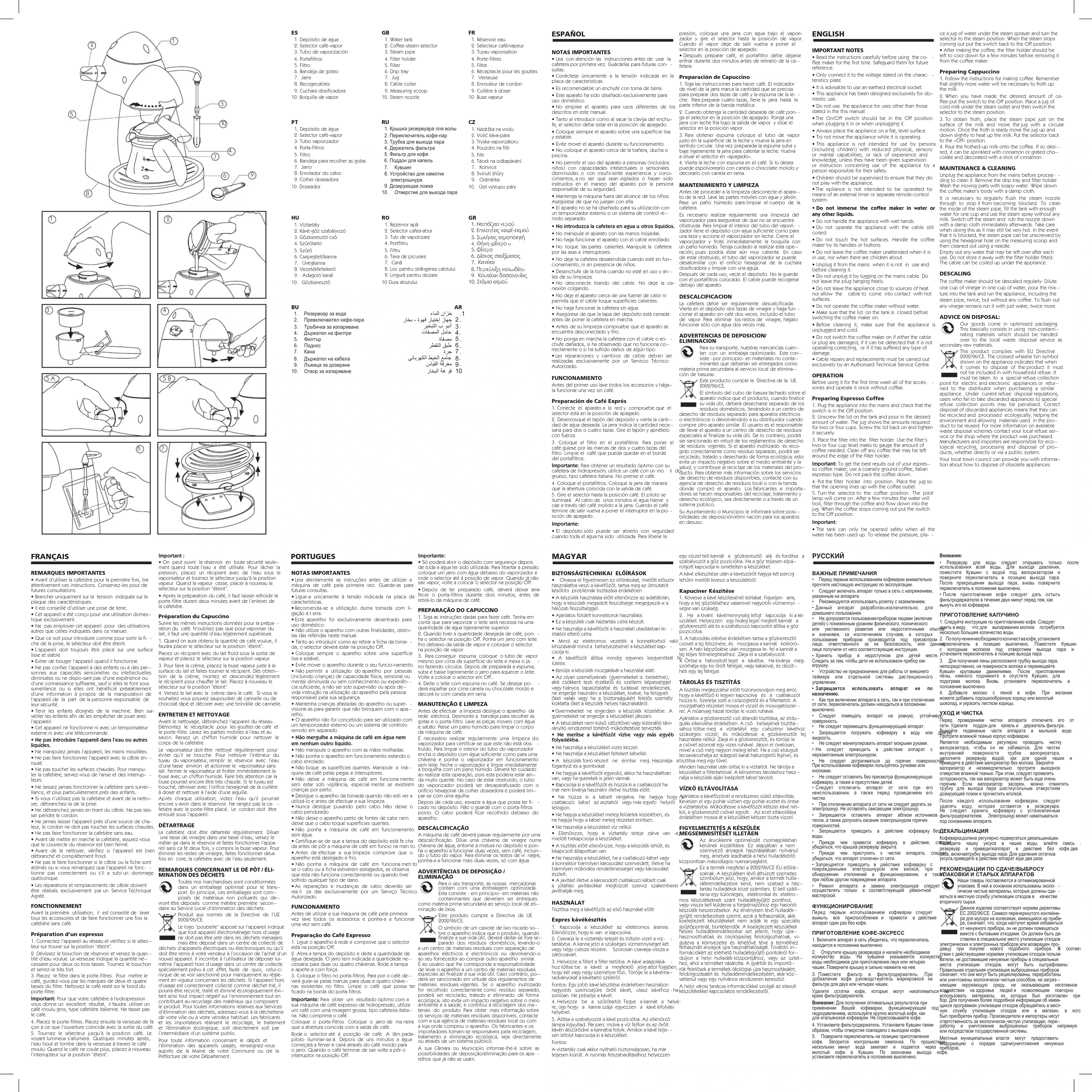 voyant lumineux s’allumera. Quelques minutes après, l’eau bout et tombe dans la verseuse à travers le café moulu. Quand le café ne coule plus, placez à nouveau l’interrupteur sur la position “éteint”.Important :• On peut ouvrir le réservoir en toute sécurité seule- ment quand toute l’eau a été utilisée. Pour lâcher la pression, placez un récipient avec de l’eau sous le vaporisateur et tournez le sélecteur jusqu’à la position vapeur. Quand la vapeur cesse, placer à nouveau le sélecteur sur la position “éteint”.• Après la préparation du café, il faut laisser refroidir le porte-filtre durant deux minutes avant de l’enlever de la cafetière.Préparation du CapuccinoSuivre les mêmes instructions données pour la prépa- ration du café. N’oubliez pas que pour vaporiser du lait, il faut une quantité d’eau légèrement supérieure.1. Quand on aura obtenu la quantité de café voulue, il faudra placer le sélecteur sur la position “éteint”.Placez un récipient avec du lait froid sous la sortie de vapeur et placez le sélecteur sur la position vapeur.3. Pour faire la crème, placez la buse vapeur juste à la surface du lait et faites tourner le récipient. Dès obten- tion de la crème, montez et descendez légèrement le récipient pour chauffer le lait. Placez à nouveau le sélecteur sur la position “éteint”.4. Versez le lait avec la crème dans le café. Si vous le souhaitez vous pouvez saupoudrer de cannelle ou de chocolat râpé et décorer avec une brindille de cannelle.ENTRETIEN ET NETTOYAGEAvant le nettoyage, débranchez l’appareil du réseau. Démontez le réceptacle pour les gouttes de café et le porte-filtre. Lavez les parties mobiles à l’eau et au savon. Passez un chiffon humide pour nettoyer le corps de la cafetière.Le vaporisateur doit être nettoyé régulièrement pour éviter qu’il se bouche. Pour nettoyer l’intérieur du tuyau du vaporisateur, remplir le réservoir avec l’eau d’une tasse environ et actionner le vaporisateur sans lait. Fermer le vaporisateur et frotter immédiatement la buse avec un chiffon humide. Faire très attention car la buse pourrait encore être très chaude. Si le tuyau est bouché, dévisser avec l’orifice hexagonal de la cuillère à doser et nettoyer à l’aide d’une aiguille. Après chaque utilisation, videz l’eau qu’il pourrait encore y avoir dans le réservoir. Ne rangez pas la ca- fetière avec le porte-filtre placé. Le cordon doit être enroulé sous l’appareil.DÉTARTRAGELa cafetière doit être détartrée régulièrement. Diluer une tasse de vinaigre dans une tasse d’eau, versez le mélan ge dans le réservoir et faites fonctionner l’appa-reil sans ca fé deux fois, y compris la buse vapeur. Pour éliminer les restes de vinaigre, faites fonctionner deux fois en core, la cafetière avec de l’eau seulement.REMARQUES CONCERNANT LE DÉ PÔT / ÉLI-MINATION DES DÉCHETSToutes nos marchandises sont conditionnées dans un emballage optimisé pour le trans--port. En principe, ces emballages sont com--posés de matériaux non polluants qui de--vront être déposés comme matière première secon--daire au Service Local d’élimination des déchets. Produit aux normes de la Directive de l’UE 2002/96/CE.Le logo “poubelle” apposé sur l’appareil indique que tout appareil électroménager hors d’usage ne doit pas être jeté dans les déchets ménagers mais être déposé dans un centre de collecte de déchets d’appareils électriques ou électroniques ou qu’il doit être remis à votre vendeur à l’occasion de l’achat d’un nouvel appareil. Il incombe à l’utilisateur de déposer lui-même l’appareil hors d’usage dans un centre de collecte spécialement prévu à cet effet, faute de quoi, celui-ci risque de se voir sanctionné pour manquement au règle- ment en vigueur concernant les déchets. Si l’appareil hors d’usage est correctement collecté comme déchet trié, il pourra être recyclé, traité et éliminé écologiquement évi--tant ainsi tout impact négatif sur l’environnement tout en contribuant au recyclage des matériaux qui composent le produit. Pour toutes informations relatives aux Services d’élimination des déchets, adressez-vous à la déchetterie de votre ville ou à votre vendeur habituel. Les fabricants et les importateurs réalisent le recyclage, le traitement et l’élimination écologique, soit directement soit par l’intermédiaire d’un système public. Pour toute information concernant le dépôt et l’élimination des appareils usagés, renseignez-vous auprès de la Mairie de votre Commune ou de la Préfecture de votre Département.NOTAS IMPORTANTES