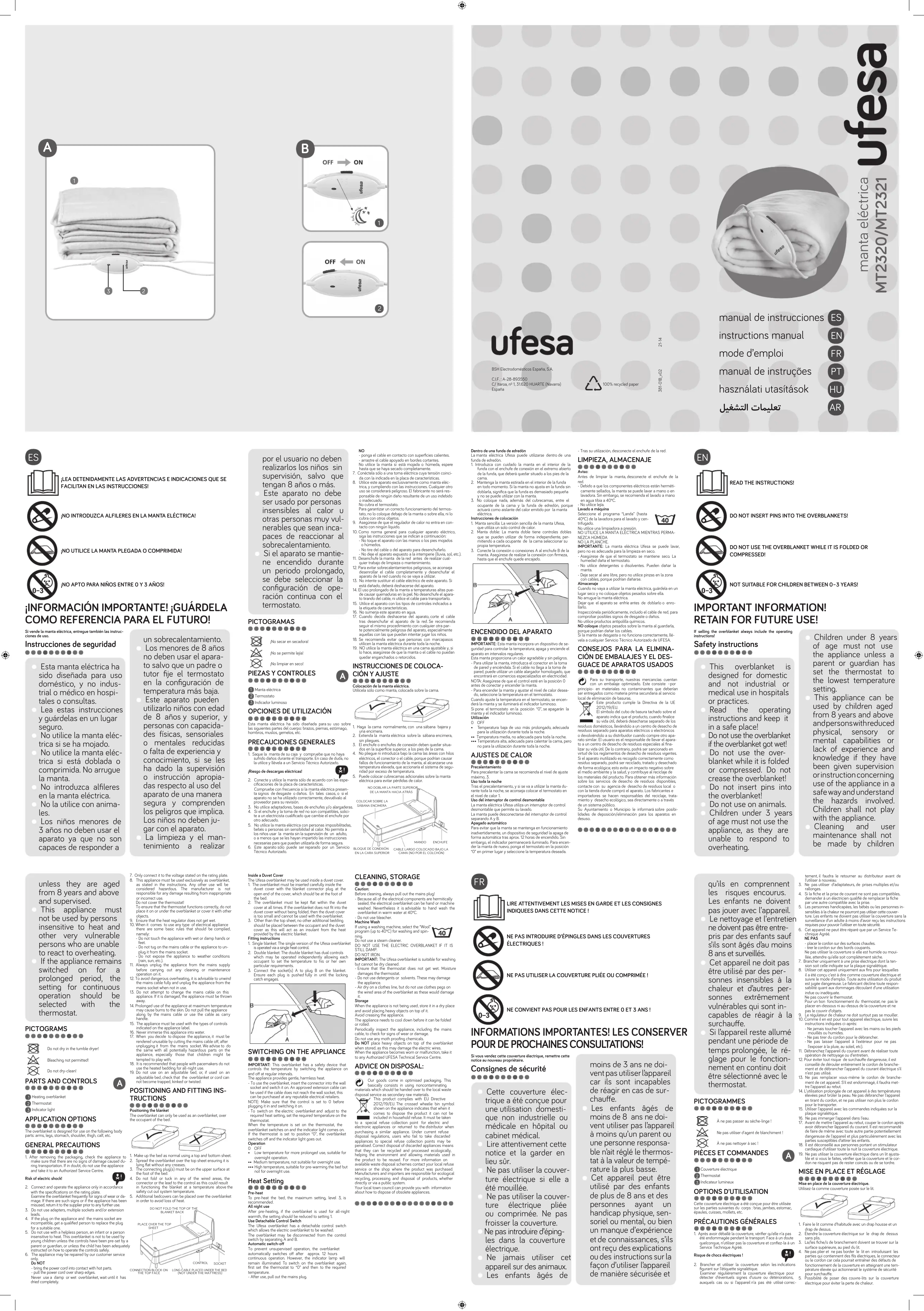 permanence doit étirée. Si la couverture ne s’ajuste pas dans la housse sans être pliée cela veut dire que la housse est trop petite et qu’il n’est donc pas possible de l’utiliser avec la couverture.3. Ne pas placer, d’autres éléments, hormis le couvre-lit entre l’occupant du lit et la housse de couette car ils risqueraient d’isoler la chaleur produite par la couverture électrique.Mise en place1. Couverture simple: Version simple de la couverture Ufesa qui fonctionne avec une seule commande de chaleur. Couverture double : Avec doubles commandes qui peuvent être utilisées séparément ce qui permet à chaque occupant du lit de sélectionner la température lui convenant le mieux.3. Brancher la fiche ou les fiches A à la prise B de la couverture. La fiche doit être parfaitement introduite pour que la connexion soit solide.ALLUMAGE DE L’APPAREILREMARQUE IMPORTANTE : Cette couverture est équipée d’un dispositif de sécurité pour contrôler la température, il éteint et allume l’appareil à intervalles réuliers. Cette couverture fournit une chaleur aréable et sans daner.- Pour utiliser la couverture, introduire la fiche dans la prise murale et allumez-la. Si le cordon n’arrive pas à la prise murale, vous pouvez utiliser une rallone homolouée disponibles dans tous les maasins d’électricité.NOTE: Vérifier que le bouton est bien sur la position 0 avant de brancher et d’allumer la couverture.- Pour allumer la couverture et réler le niveau de chaleur, sélectionner la température au thermostat.Lors du rélae de la température au thermostat, la couver-ture s’allumera ainsi que l’indicateur lumineux.Si vous placez le thermostat sur la position “0”, la couver-ture et l’indicateur lumineux s’éteindront.Utilisation0 OFF• Température minimum pour une utilisation prolonée, adéquate pour l’utilisation toute la nuit de la couverture.•• Température moyenne non adéquate pour utiliser la couverture toute la nuit.••• Température élevée, pour préchauer le lit. Ne pas la sélectionner pour l’utilisation de l’appareil toute la nuit.Réglages chaleurPréchauagePour préchauer le lit il est recommandé de sélectionner le niveau maximum 3.Utilisation de la couverture toute la nuit.Après le préchauae, si la couverture va être utilisée toute la nuit, il est conseillé de sélectionner un niveau de chaleur 1.Utilisation de l’interrupteur détachable de commandeLa couverture électrique Ufesa utilise un interrupteur déta-chable de commande qui permet de laver l’appareil.La couverture peut être détachée de l’interrupteur de com-mande, en retirant A et B.Extinction automatiquePour éviter que la couverture se maintienne en fonctionne-ment par inadvertance, celle-ci s’éteint automatiquement à l’issue d’environ 12 heures de fonctionnement. L’indicateur reste quant à lui allumé. Pour rallumer la couverture, placer d’abord le thermostat sur la position “0” et ensuite sélec-tionner la température.- Après utilisation, débrancher la fiche de la prise de courant.NETTOYAGE, RANGEMENTMise en garde:Avant de nettoyer la couverture, déconnecter la fiche de la prise de courant. Grâce à la protection étanche des composants électriques, la couverture peut être lavée à la main ou au lave-line. Cepen-dant, il est préférable de le laver à la main à l’eau tiède à 40C.- Ne pas utiliser d’eau de Javel.Lavage en machineSélectionner le proramme “Laine” (40C) du lave-line pour le lavae et l’essorae.Ne pas utiliser de nettoyeur à pression.NE PAS UTILISER LA COUVERTURE ÉLECTRIQUE TANT QU’ELLE EST HUMIDE.NE PAS LA REPASSER.REMARQUE IMPORTANTE : La couverture électrique Ufe-sa peut être lavé, mais pas nettoyée à sec.- Le thermostat ne doit pas se mouiller. L’humidité endom-mae le thermostat.- Ne pas utiliser de détersifs ni de solvants. Ces produits risquent d’endommaer la couverture.- Laisser sécher à l’air, ne pas poser de pinces à line dans les parties contenant les fils électriques car ils pourraient s’endommaer.RangementSi vous n’utilisez pas la couverture électrique, ranez-la en lieu sec et ne pas poser d’objets lourds dessus.Ne pas froisser la couverture électrique.Attendre le refroidissement complet de l’appareil avant de le plier ou de l’enrouler.Examiner réulièrement l’appareil ainsi que le cordon de branchement afin de détecter d’éventuels sines d’usure ou des détériorations.Ne pas utiliser de produits anti-mites chimiques.NE PAS poser d’objets lourds sur la couverture ranée qui risqueraient d’endommaer les fils électriques.Si la couverture est usée ou si elle ne fonctionne pas correc-tement confiez-la à un Service Technique Aréé de UFESA.REMARQUES CONCERNANT LE DÉPÔT/ ÉLIMINATION DES DÉCHETSToutes nos marchandises sont conditionnées dans un emballae optimisé pour le transport. En principe, ces emballaes sont composés de matériaux non po- lluants qui devront être déposés comme matière première secondaire au Service Local d’élimination des déchets. Produit aux normes de la Directive de l’UE 2012/19/EU. Le loo “poubelle” apposé sur l’appareil indique que tout appareil électroménaer hors d’usae ne doit pas être jeté dans les déchets ménaers mais être déposé dans un centre de collecte de déchets d’appareils électriques ou électroniques ou qu’il doit être remis à votre vendeur à l’occasion de l’achat d’un nouvel appareil. Il incombe à l’utilisateur de déposer luimême l’appareil hors d’usae dans un centre de collecte spécialement prévu à cet eet, faute de quoi, celui-ci risque de se voir sanctionné pour manquement au rèlement en viueur concernant les déchets. Si l’appareil hors d’usae est correctement collecté comme déchet trié, il pourra être recyclé, traité et éliminé écoloiquement évitant ainsi tout impact néatif sur l’envir onnement tout en contri-buant 