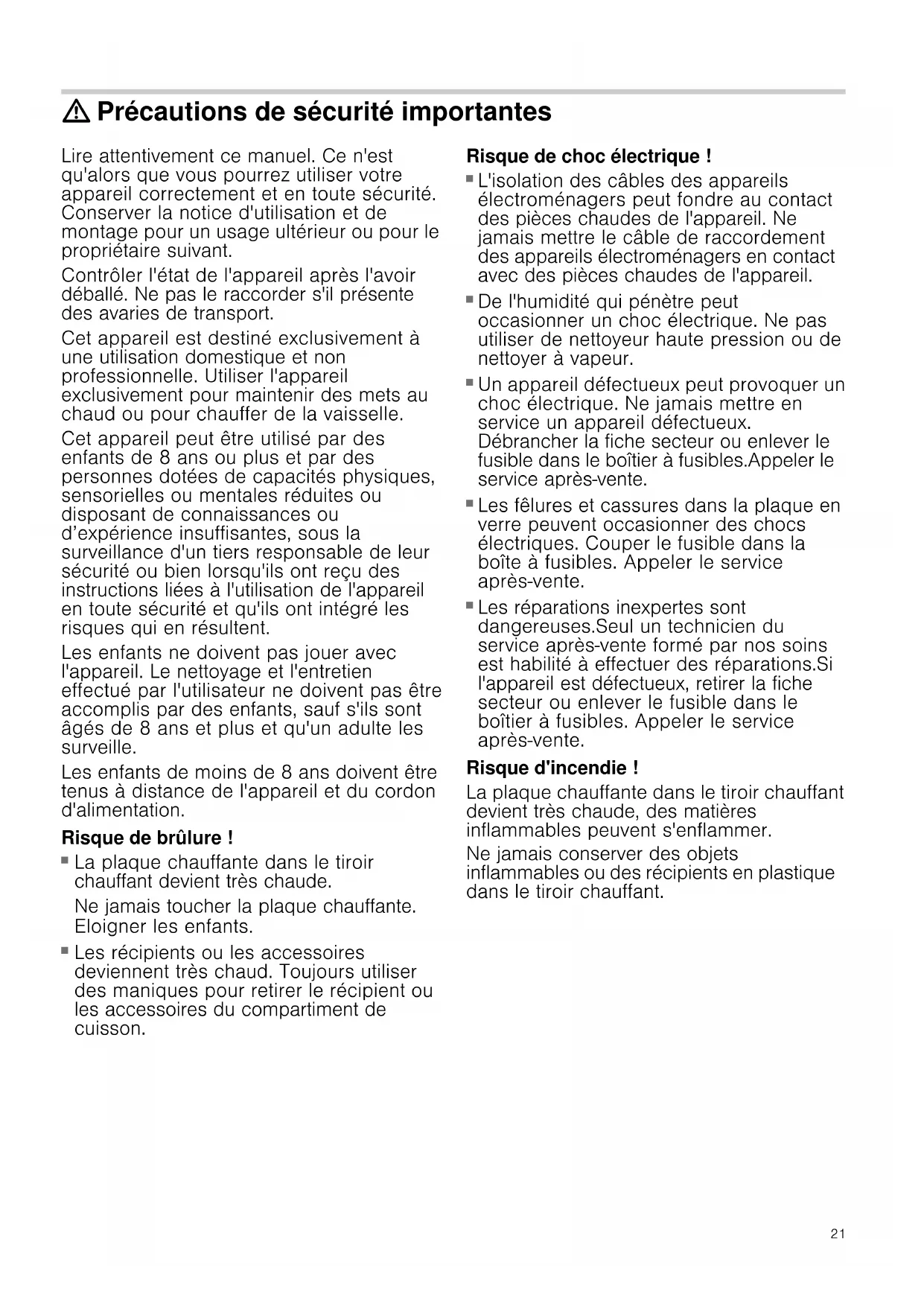 - Élimination sans nuisances pour l'environnement Produktinfo Vous trouverez des informations supplementaires concernant les produits, accessoires, pièces de rechange et services sur Internet sous : www.siemens-home.com et la boutique en ligne : www.siemens-eshop.com21 : Précautions de sécurité importantes Lire attentivement ce manuel. Ce n'est qu'alors que vous pourrez utiliser votre appareil correctement et en toute sécurité. Conserver la notice d'utilisation et de montage pour un usage ultérieur ou pour le propriétaire suivant. Contrôler l'état de l'appareil après l'avoir déballé. Ne pas le raccorder s'il présente des avaries de transport. Cet appareil est destiné exclusivement à une utilisation domestique et non professionnelle. Utiliser l'appareil exclusivement pour maintenir des mets au chaud ou pour chauffer de la vaisselle. Cet appareil peut être utilisé par des enfants de 8 ans ou plus et par des personnes dotées de capacités physiques, sensorielles ou mentales réduites ou disposant de connaissances ou d’expérience insuffisantes, sous la surveillance d'un tiers responsable de leur sécurité ou bien lorsqu'ils ont reçu des instructions liées à l'utilisation de l'appareil en toute sécurité et qu'ils ont intégré les risques qui en résultent. Les enfants ne doivent pas jouer avec l'appareil. Le nettoyage et l'entretien effectué par l'utilisateur ne doivent pas être accomplis par des enfants, sauf s'ils sont âgés de 8 ans et plus et qu'un adulte les surveille. Les enfants de moins de 8 ans doivent être tenus à distance de l'appareil et du cordon d'alimentation. Risque de brûlure ! p. 25