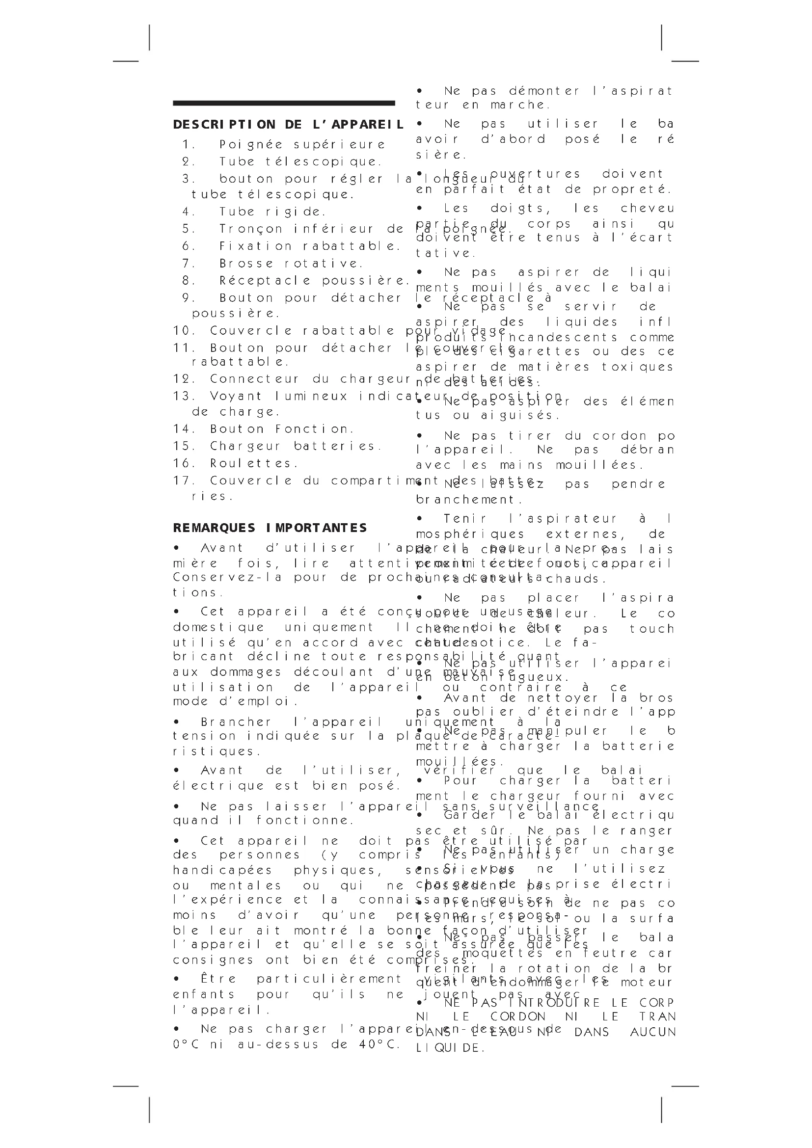 - Ne pas aspirer de liquides ou des élé- ments mouillés avec le balai électrique.