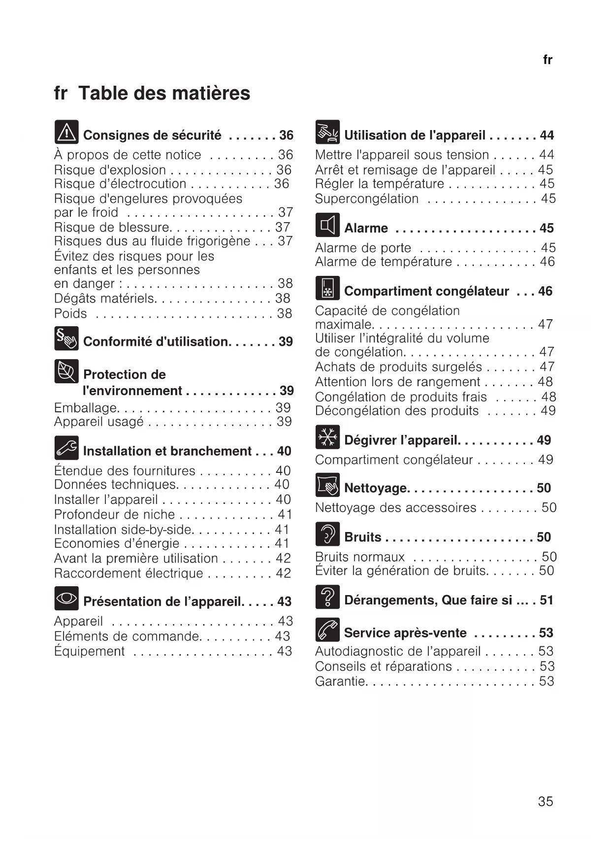 - Présentation de l’appareil. . . . . 43 Appareil . . . . . . . . . . . . . . . . . . . . . . 43 Eléments de commande. . . . . . . . . . 43 Équipement . . . . . . . . . . . . . . . . . . . 43 1 Utilisation de l'appareil . . . . . . . 44 Mettre l'appareil sous tension . . . . . . 44 Arrêt et remisage de l’appareil . . . . . 45 Régler la température . . . . . . . . . . . . 45 Supercongélation . . . . . . . . . . . . . . . 45 M Alarme . . . . . . . . . . . . . . . . . . . . 45 Alarme de porte . . . . . . . . . . . . . . . . 45 Alarme de température . . . . . . . . . . . 46 W Compartiment congélateur . . . 46 Capacité de congélation maximale. . . . . . . . . . . . . . . . . . . . . . 47 Utiliser l’intégralité du volume de congélation. . . . . . . . . . . . . . . . . . 47 Achats de produits surgelés . . . . . . . 47 Attention lors de rangement . . . . . . . 48 Congélation de produits frais . . . . . . 48 Décongélation des produits . . . . . . . 49 = Dégivrer l’appareil. . . . . . . . . . . 49 Compartiment congélateur . . . . . . . . 49 D Nettoyage. . . . . . . . . . . . . . . . . . 50 Nettoyage des accessoires . . . . . . . . 50 > Bruits . . . . . . . . . . . . . . . . . . . . . 50 Bruits normaux . . . . . . . . . . . . . . . . . 50 Éviter la génération de bruits. . . . . . . 50 3 Dérangements, Que faire si … . 51 4 Service après-vente . . . . . . . . . 53 Autodiagnostic de l’appareil . . . . . . . 53 Conseils et réparations . . . . . . . . . . . 53 Garantie. . . . . . . . . . . . . . . . . . . . . . . 53fr Consignes de sécurité