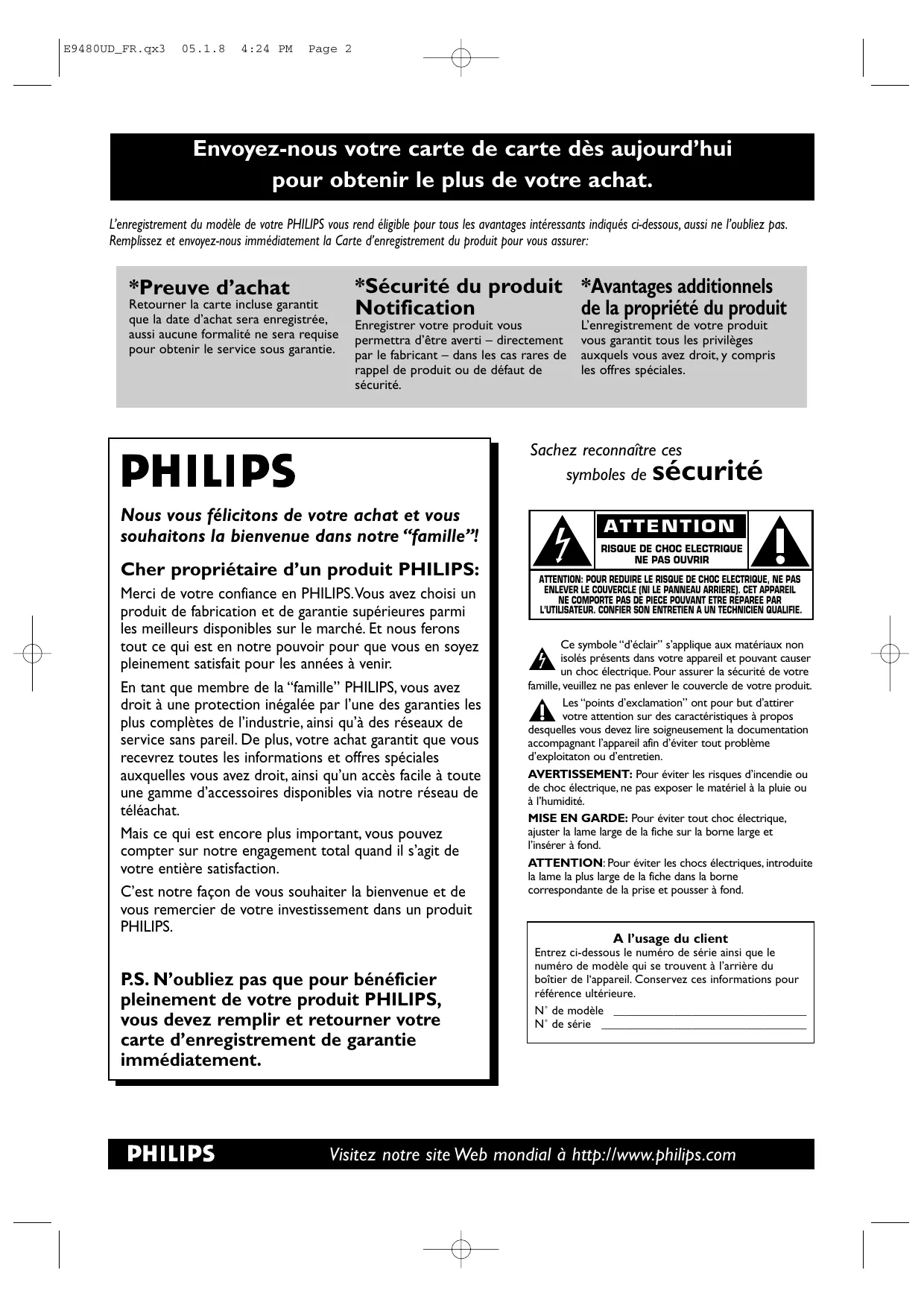 4:24 PM Page 2 Envoyez-nous votre carte de carte dès aujourd’hui pour obtenir le plus de votre achat. L’enregistrement du modèle de votre PHILIPS vous rend éligible pour tous les avantages intéressants indiqués ci-dessous, aussi ne l’oubliez pas. Remplissez et envoyez-nous immédiatement la Carte d’enregistrement du produit pour vous assurer: *Preuve d’achat Retourner la carte incluse garantit que la date d’achat sera enregistrée, aussi aucune formalité ne sera requise pour obtenir le service sous garantie. *Sécurité du produit *Avantages additionnels Notification de la propriété du produit Enregistrer votre produit vous permettra d’être averti – directement par le fabricant – dans les cas rares de rappel de produit ou de défaut de sécurité. L’enregistrement de votre produit vous garantit tous les privilèges auxquels vous avez droit, y compris les offres spéciales. Sachez reconnaître ces symboles de sécurité Nous vous félicitons de votre achat et vous souhaitons la bienvenue dans notre “famille”! Cher propriétaire d’un produit PHILIPS: Merci de votre confiance en PHILIPS.Vous avez choisi un produit de fabrication et de garantie supérieures parmi les meilleurs disponibles sur le marché. Et nous ferons tout ce qui est en notre pouvoir pour que vous en soyez pleinement satisfait pour les années à venir. En tant que membre de la “famille” PHILIPS, vous avez droit à une protection inégalée par l’une des garanties les plus complètes de l’industrie, ainsi qu’à des réseaux de service sans pareil. De plus, votre achat garantit que vous recevrez toutes les informations et offres spéciales auxquelles vous avez droit, ainsi qu’un accès facile à toute une gamme d’accessoires disponibles via notre réseau de téléachat. Mais ce qui est encore plus important, vous pouvez compter sur notre engagement total quand il s’agit de votre entière satisfaction. C’est notre façon de vous souhaiter la bienvenue et de vous remercier de votre investissement dans un produit PHILIPS. P.S. N’oubliez pas que pour bénéficier pleinement de votre produit PHILIPS, vous devez remplir et retourner votre carte d’enregistrement de garantie immédiatement. ATTENTION