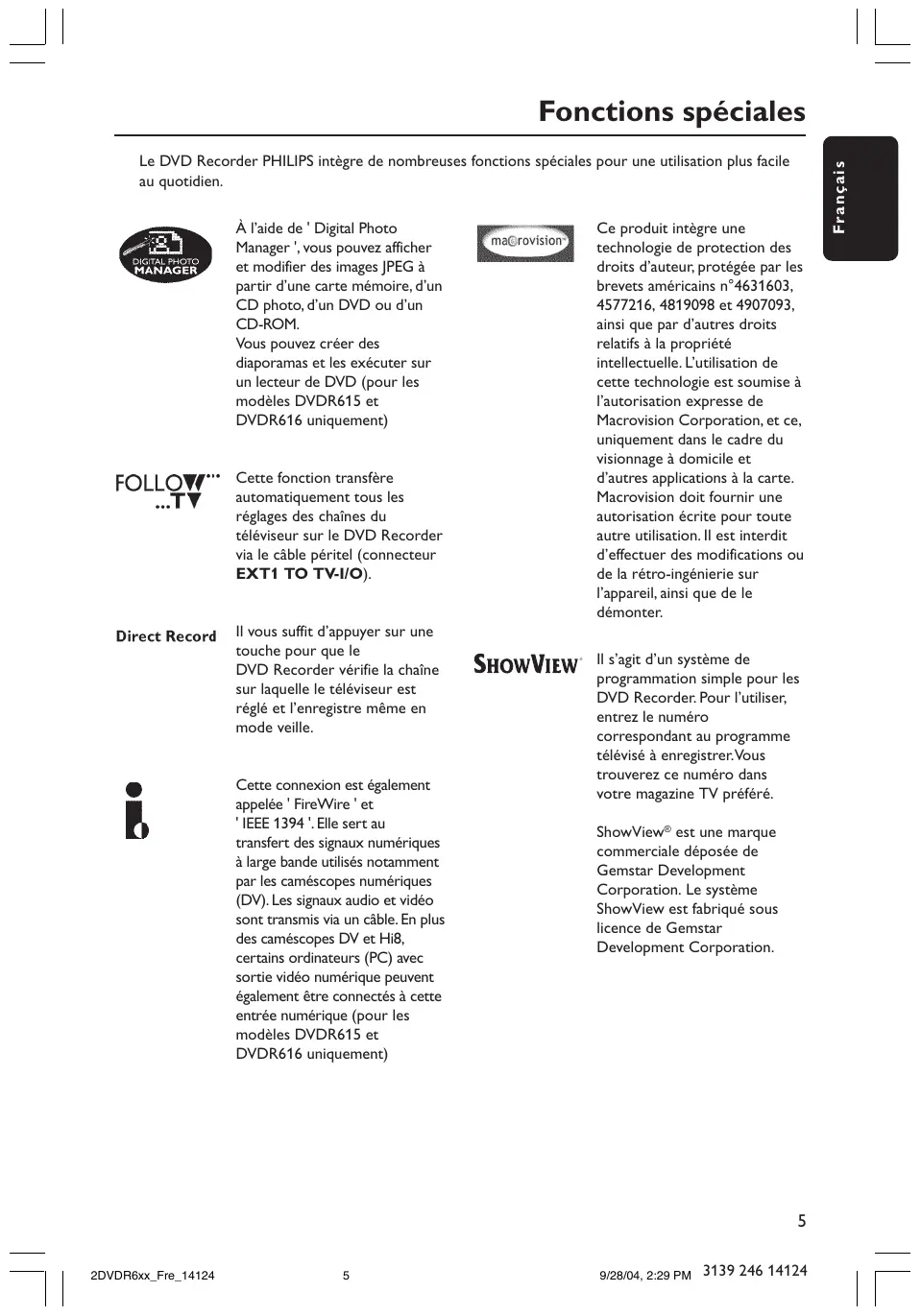Le DVD Recorder PHILIPS intègre de nombreuses fonctions spéciales pour une utilisation plus facile au quotidien. À l’aide de ' Digital Photo Manager ', vous pouvez afficher et modifier des images JPEG à partir d’une carte mémoire, d’un CD photo, d’un DVD ou d’un CD-ROM. Vous pouvez créer des diaporamas et les exécuter sur un lecteur de DVD (pour les modèles DVDR615 et DVDR616 uniquement) Cette fonction transfère automatiquement tous les réglages des chaînes du téléviseur sur le DVD Recorder via le câble péritel (connecteur EXT1 TO TV-I/O). Il vous suffit d’appuyer sur une touche pour que le DVD Recorder vérifie la chaîne sur laquelle le téléviseur est réglé et l’enregistre même en mode veille. Cette connexion est également appelée ' FireWire ' et ' IEEE 1394 '. Elle sert au transfert des signaux numériques à large bande utilisés notamment par les caméscopes numériques (DV). Les signaux audio et vidéo sont transmis via un câble. En plus des caméscopes DV et Hi8, certains ordinateurs (PC) avec sortie vidéo numérique peuvent également être connectés à cette entrée numérique (pour les modèles DVDR615 et DVDR616 uniquement) Ce produit intègre une technologie de protection des droits d’auteur, protégée par les brevets américains n°4631603, 4577216, 4819098 et 4907093, ainsi que par d’autres droits relatifs à la propriété intellectuelle. L’utilisation de cette technologie est soumise à l’autorisation expresse de Macrovision Corporation, et ce, uniquement dans le cadre du visionnage à domicile et d’autres applications à la carte. Macrovision doit fournir une autorisation écrite pour toute autre utilisation. Il est interdit d’effectuer des modifications ou de la rétro-ingénierie sur l’appareil, ainsi que de le démonter. Il s’agit d’un système de programmation simple pour les DVD Recorder. Pour l’utiliser, entrez le numéro correspondant au programme télévisé à enregistrer.Vous trouverez ce numéro dans votre magazine TV préféré. ShowView® est une marque commerciale déposée de Gemstar Development Corporation. Le système ShowView est fabriqué sous licence de Gemstar Development Corporation.