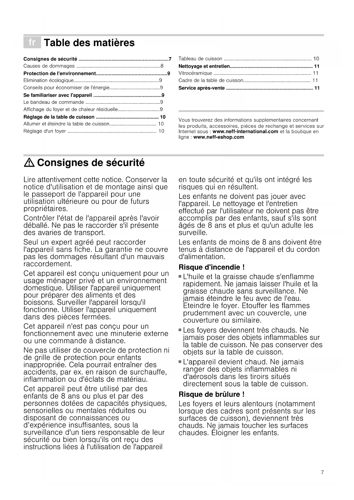 - Ongoing cooking without lid ** Without lid6 Cleaning and care The information in this section provides help on how best to care for your hob. Suitable maintenance and cleaning products can be purchased from the after-sales service or in our e-Shop. Ceramic Clean the hob after each use. This will prevent spills from burning onto the ceramic. Only clean the hob when it has cooled down sufficiently. Use only cleaning agents which are suitable for glass ceramic. Follow the cleaning instructions on the packaging. Never use: ■ Undiluted washing-up liquid ■ Detergent intended for dishwashers ■ Scouring agents ■ Harsh cleaning agents such as oven spray or stain remover ■ Abrasive sponges ■ High-pressure cleaners or steam jet cleaners Ground-in dirt can be best removed with a glass scraper, available from retailers. Please note the manufacturer's instructions. You can also obtain a suitable glass scraper from our after- sales service or from the e-Shop. Using special sponges to clean glass ceramic achieves great cleaning results. Hob surround To prevent damage to the hob surround, observe the following instructions: ■ Use only hot soapy water. ■ Wash new sponge cloths thoroughly before use. ■ Do not use any sharp or abrasive agents. ■ Do not use the glass scraper. After-sales service Our after-sales service is there for you if your appliance should need to be repaired. We are committed fo find the best solution also in order to avoid an unnecessary call-out. E number and FD number: Please quote the E number (product number) and the FD number (production number) of your appliance when contacting the after-sales service. The rating plate bearing these numbers can be found on the appliance certificate. Please note that a visit from an after-sales service engineer is not free of charge, even during the warranty period.7 Þ Table des matières [fr]Notice d’utilisation Consignes de sécurité ...............................................................7 Causes de dommages ......................................................................8 Protection de l'environnement..................................................9 Elimination écologique.......................................................................9 Conseils pour économiser de l'énergie..........................................9 Se familiariser avec l'appareil ...................................................9 Le bandeau de commande ..............................................................9 Affichage du foyer et de chaleur résiduelle...................................9 Réglage de la table de cuisson ............................................... 10 Allumer et éteindre la table de cuisson....................................... 10 Réglage d'un foyer .......................................................................... 10 Tableau de cuisson ......................................................................... 10 Nettoyage et entretien.............................................................. 11 Vitrocéramique ................................................................................. 11 Cadre de la table de cuisson........................................................ 11 Service après-vente ................................................................. 11 Produktinfo Vous trouverez des informations supplementaires concernant les produits, accessoires, pièces de rechange et services sur Internet sous : www.neff-international.com et la boutique en ligne : www.neff-eshop.com : Consignes de sécurité Lire attentivement cette notice. Conserver la notice d'utilisation et de montage ainsi que le passeport de l'appareil pour une utilisation ultérieure ou pour de futurs propriétaires. Contrôler l'état de l'appareil après l'avoir déballé. Ne pas le raccorder s'il présente des avaries de transport. Seul un expert agréé peut raccorder l'appareil sans fiche. La garantie ne couvre pas les dommages résultant d'un mauvais raccordement. Cet appareil est conçu uniquement pour un usage ménager privé et un environnement domestique. Utiliser l'appareil uniquement pour préparer des aliments et des boissons. Surveiller l'appareil lorsqu'il fonctionne. Utiliser l'appareil uniquement dans des pièces fermées. Cet appareil n'est pas conçu pour un fonctionnement avec une minuterie externe ou une commande à distance. Ne pas utiliser de couvercle de protection ni de grille de protection pour enfants inappropriée. Cela pourrait entraîner des accidents, par ex. en raison de surchauffe, inflammation ou d'éclats de matériau. Cet appareil peut être utilisé par des enfants de 8 ans ou plus et par des personnes dotées de capacités physiques, sensorielles ou mentales réduites ou disposant de connaissances ou d’expérience insuffisantes, sous la surveillance d'un tiers responsable de leur sécurité ou bien lorsqu'ils ont reçu des instructions liées à l'utilisation de l'appareil en toute sécurité et qu'ils ont intégré les risques qui en résultent. Les enfants ne doivent pas jouer avec l'appareil. Le nettoyage et l'entretien effectué par l'utilisateur ne doivent pas être accomplis par des enfants, sauf s'ils sont âgés de 8 ans et plus et qu'un adulte les surveille. Les enfants de moins de 8 ans doivent être tenus à distance de l'appareil et du cordon d'alimentation. Risque d'incendie !