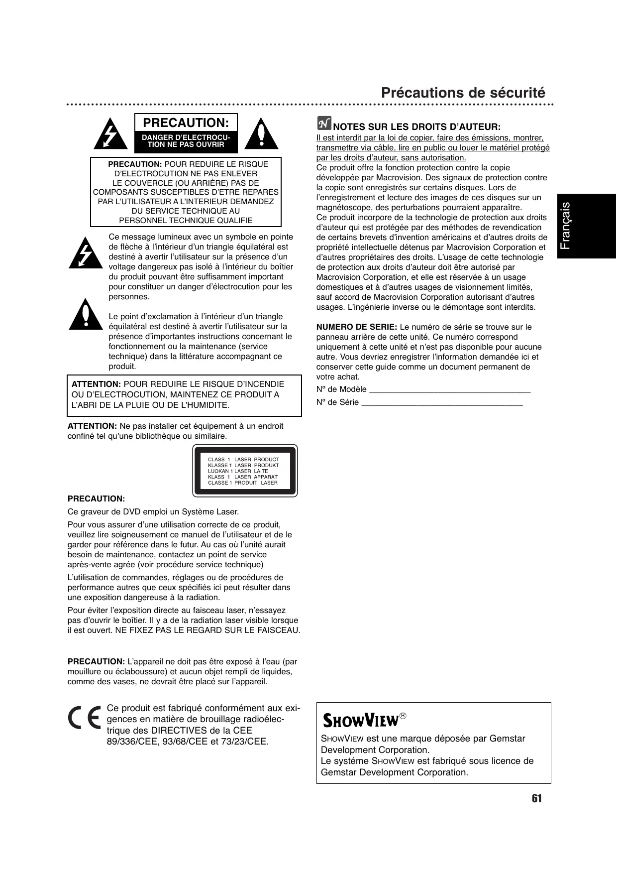 Ce message lumineux avec un symbole en pointe de flèche à l’intérieur d’un triangle équilatéral est destiné à avertir l’utilisateur sur la présence d’un voltage dangereux pas isolé à l’intérieur du boîtier du produit pouvant être suffisamment important pour constituer un danger d’électrocution pour les personnes. Le point d’exclamation à l’intérieur d’un triangle équilatéral est destiné à avertir l’utilisateur sur la présence d’importantes instructions concernant le fonctionnement ou la maintenance (service technique) dans la littérature accompagnant ce produit. ATTENTION: POUR REDUIRE LE RISQUE D’INCENDIE OU D’ELECTROCUTION, MAINTENEZ CE PRODUIT A L’ABRI DE LA PLUIE OU DE L’HUMIDITE. NOTES SUR LES DROITS D’AUTEUR: Il est interdit par la loi de copier, faire des émissions, montrer, transmettre via câble, lire en public ou louer le matériel protégé par les droits d’auteur, sans autorisation. Ce produit offre la fonction protection contre la copie développée par Macrovision. Des signaux de protection contre la copie sont enregistrés sur certains disques. Lors de l’enregistrement et lecture des images de ces disques sur un magnétoscope, des perturbations pourraient apparaître. Ce produit incorpore de la technologie de protection aux droits d’auteur qui est protégée par des méthodes de revendication de certains brevets d’invention américains et d’autres droits de propriété intellectuelle détenus par Macrovision Corporation et d’autres propriétaires des droits. L’usage de cette technologie de protection aux droits d’auteur doit être autorisé par Macrovision Corporation, et elle est réservée à un usage domestiques et à d’autres usages de visionnement limités, sauf accord de Macrovision Corporation autorisant d’autres usages. L’ingénierie inverse ou le démontage sont interdits. NUMERO DE SERIE: Le numéro de série se trouve sur le panneau arrière de cette unité. Ce numéro correspond uniquement à cette unité et n’est pas disponible pour aucune autre. Vous devriez enregistrer l’information demandée ici et conserver cette guide comme un document permanent de votre achat. Nº de Modèle ___________________________________ Nº de Série ___________________________________ ATTENTION: Ne pas installer cet équipement à un endroit confiné tel qu’une bibliothèque ou similaire. PRECAUTION: Ce graveur de DVD emploi un Système Laser. Pour vous assurer d’une utilisation correcte de ce produit, veuillez lire soigneusement ce manuel de l’utilisateur et de le garder pour référence dans le futur. Au cas où l’unité aurait besoin de maintenance, contactez un point de service après-vente agrée (voir procédure service technique) L’utilisation de commandes, réglages ou de procédures de performance autres que ceux spécifiés ici peut résulter dans une exposition dangereuse à la radiation. Pour éviter l’exposition directe au faisceau laser, n’essayez pas d’ouvrir le boîtier. Il y a de la radiation laser visible lorsque il est ouvert. NE FIXEZ PAS LE REGARD SUR LE FAISCEAU. PRECAUTION: L’appareil ne doit pas être exposé à l’eau (par mouillure ou éclaboussure) et aucun objet rempli de liquides, comme des vases, ne devrait être placé sur l’appareil. Ce produit est fabriqué conformément aux exigences en matière de brouillage radioélectrique des DIRECTIVES de la CEE 89/336/CEE, 93/68/CEE et 73/23/CEE.