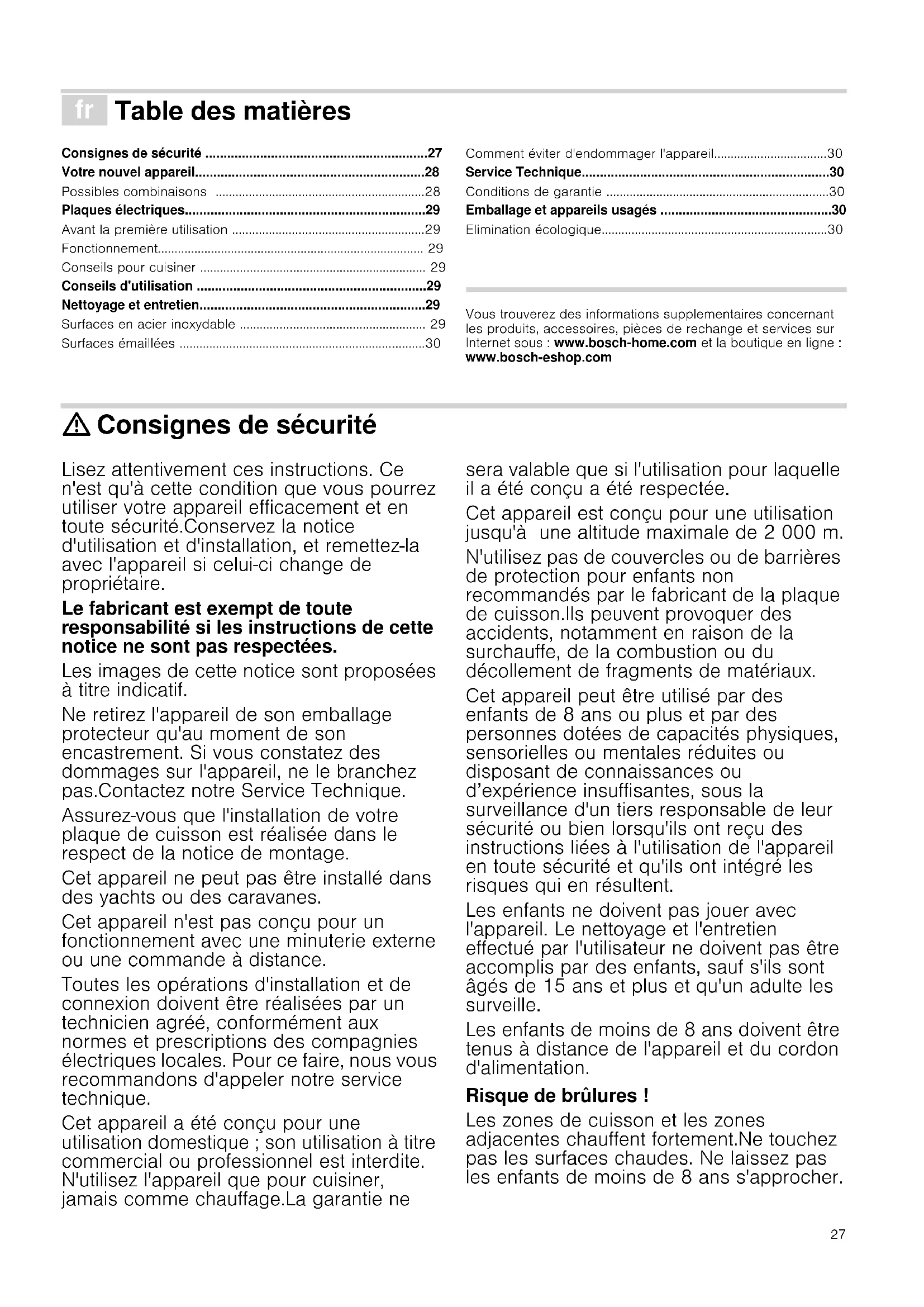 - Smaltimento ecocompatibile Produktinfo Per ulteriori informazioni su prodotti, accessori, pezzi di ricambio e servizi è possibile consultare il sito Internet www.bosch-home.com e l'eShop www.bosch-eshop.com : Indicazioni di sicurezza Leggere attentamente le presenti istruzioni. Un'attenta lettura garantirà una manipolazione sicura ed efficace dell'apparecchio. Conservare le istruzioni d'uso e installazione e lasciarle sempre a corredo dell'apparecchio in caso di nuovo proprietario. Il costruttore declina ogni responsabilità in caso di mancata osservanza delle disposizioni del presente manuale. Le immagini rappresentate in queste istruzioni hanno carattere orientativo. Non estrarre l'apparecchio dall'imballaggio di protezione fino al momento dell'installazione. Se l'apparecchio risulta danneggiato, non collegarlo all'alimentazione. Contattare il nostro servizio tecnico. Per l'installazione del nuovo piano di cottura, attenersi strettamente alle istruzioni di montaggio. Questo apparecchio non può essere installato in yacht o camper. Questo apparecchio non è da utilizzare con un timer esterno o un telecomando separato. Tutti i lavori d'installazione e collegamento dovranno essere realizzati da personale tecnico autorizzato, conformemente alla normativa e alle prescrizioni delle locali società di fornitura elettrica. Per eseguire uno qualsiasi dei suddetti interventi, si raccomanda di contattare il nostro servizio tecnico. Questo apparecchio è stato concepito esclusivamente per uso domestico, non è consentito l'uso a scopi commerciali o professionali. Utilizzare l'apparecchio solo per cucinare e non quale fonte di riscaldamento. La garanzia ha validità solo se viene rispettato l'utilizzo per il quale è stato concepito. Questo apparecchio è progettato solo per l'utilizzo fino ad un'altezza di massimo 2000 metri sul livello del mare. Non utilizzare coperchi o barriere di sicurezza per bambini non consigliate dal produttore del piano di cottura. Possono provocare degli incidenti, ad es. dovuti al surriscaldamento, all'accensione o al distacco di frammenti di materiale. Questo apparecchio può essere utilizzato da bambini di età pari o superiore a 8 anni e da persone con ridotte facoltà fisiche, sensoriali o mentali nonché da persone prive di sufficiente esperienza o conoscenza dello stesso se sorvegliate da una persona responsabile della loro sicurezza o se istruite in merito all'utilizzo sicuro dell'apparecchio e consapevoli degli eventuali rischi derivanti da un utilizzo improprio. I bambini non devono utilizzare l'apparecchio come un giocattolo. I bambini non devono né pulire né utilizzare l'apparecchio da soli a meno che non abbiano un'età superiore agli 15 anni e che siano assistiti da parte di un adulto. Tenere lontano dall'apparecchio e dal cavo di alimentazione i bambini di età inferiore agli 8 anni. Pericolo di ustioni! Le zone di cottura e le superfici vicine si surriscaldano molto. Non toccare mai le superfici ad alta temperatura. Tenere lontano i bambini al di sotto degli 8 anni.32 Pericolo di incendio! p. 34
