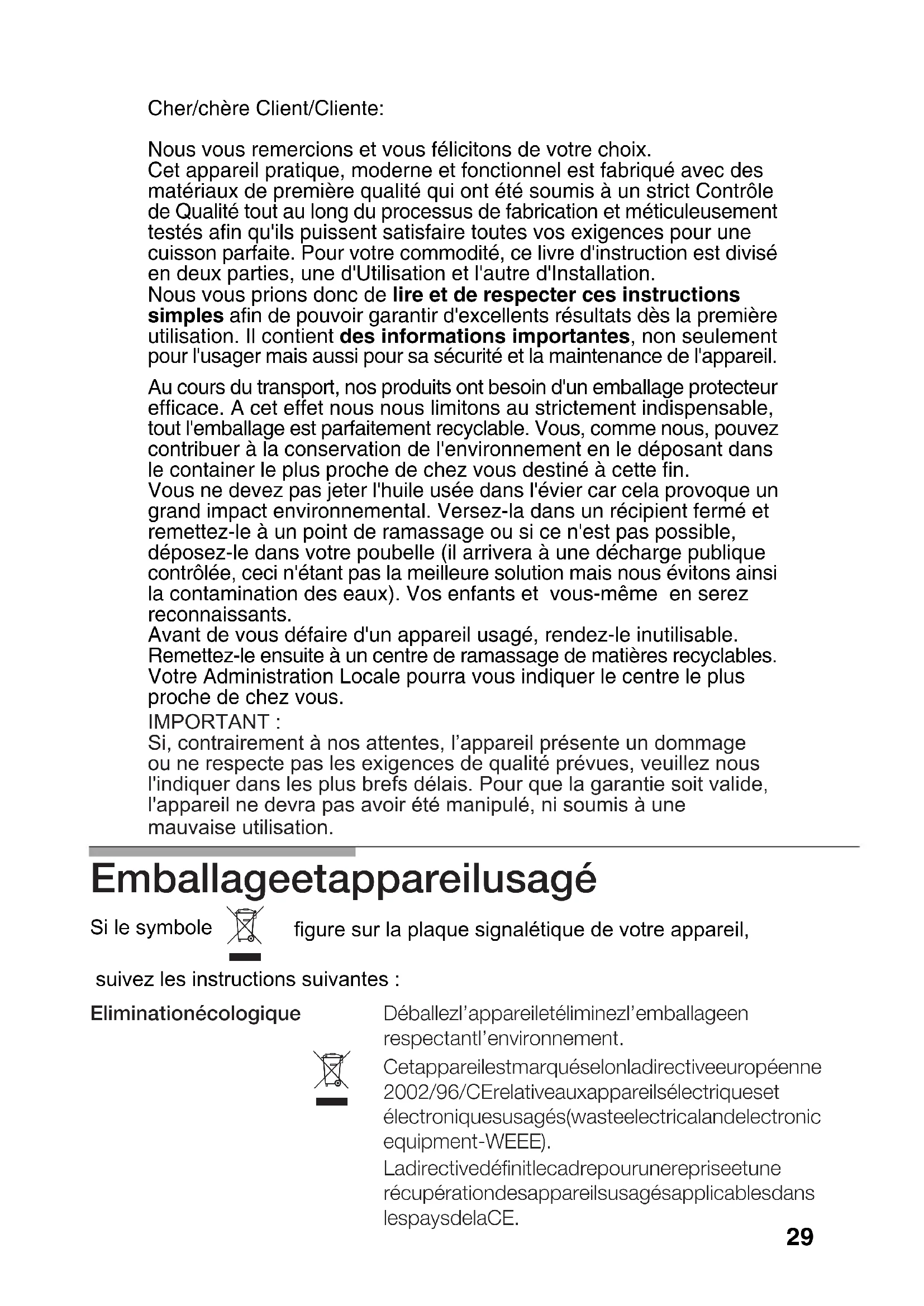 Cher/chère Client/Cliente: Nous vous remercions et vous félicitons de votre choix. Cet appareil pratique, moderne et fonctionnel est fabriqué avec des matériaux de première qualité qui ont été soumis à un strict Contrôle de Qualité tout au long du processus de fabrication et méticuleusement testés afin qu'ils puissent satisfaire toutes vos exigences pour une cuisson parfaite. Pour votre commodité, ce livre d'instruction est divisé en deux parties, une d'Utilisation et l'autre d'Installation. Nous vous prions donc de lire et de respecter ces instructions simples afin de pouvoir garantir d'excellents résultats dès la première utilisation. Il contient des informations importantes, non seulement pour l'usager mais aussi pour sa sécurité et la maintenance de l'appareil. Au cours du transport, nos produits ont besoin d'un emballage protecteur efficace. A cet effet nous nous limitons au strictement indispensable, tout l'emballage est parfaitement recyclable. Vous, comme nous, pouvez contribuer à la conservation de l'environnement en le déposant dans le container le plus proche de chez vous destiné à cette fin. Vous ne devez pas jeter l'huile usée dans l'évier car cela provoque un grand impact environnemental. Versez-la dans un récipient fermé et remettez-le à un point de ramassage ou si ce n'est pas possible, déposez-le dans votre poubelle (il arrivera à une décharge publique contrôlée, ceci n'étant pas la meilleure solution mais nous évitons ainsi la contamination des eaux). Vos enfants et vous-même en serez reconnaissants. Avant de vous défaire d'un appareil usagé, rendez-le inutilisable. Remettez-le ensuite à un centre de ramassage de matières recyclables. Votre Administration Locale pourra vous indiquer le centre le plus proche de chez vous.
