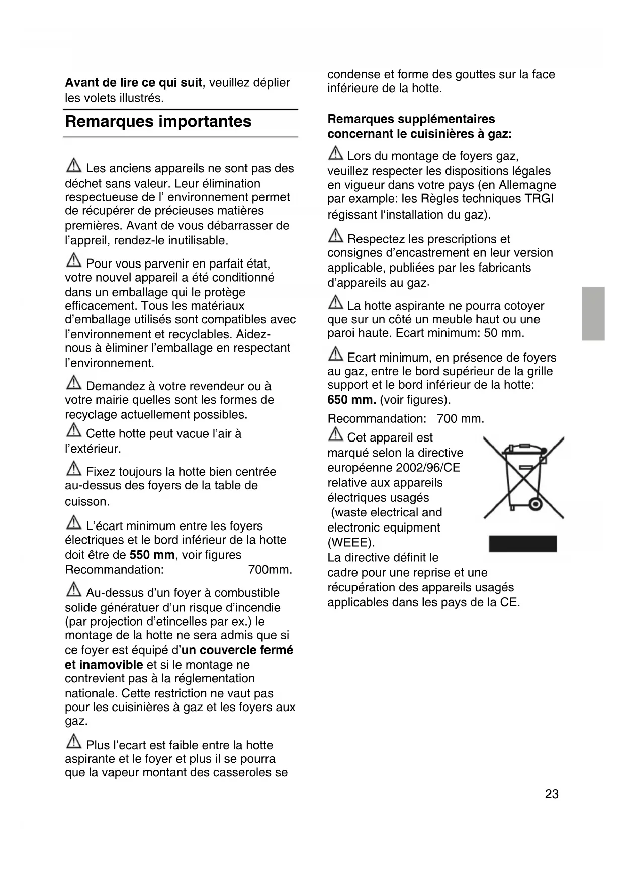 La hotte aspirante ne pourra cotoyer que sur un côté un meuble haut ou une paroi haute. Ecart minimum: 50 mm. Ecart minimum, en présence de foyers au gaz, entre le bord supérieur de la grille support et le bord inférieur de la hotte: 650 mm. (voir figures). Recommandation: 700 mm. Cet appareil est marqué selon la directive européenne 2002/96/CE relative aux appareils électriques usagés (waste electrical and electronic equipment (WEEE). La directive définit le cadre pour une reprise et une récupération des appareils usagés applicables dans les pays de la CE.24