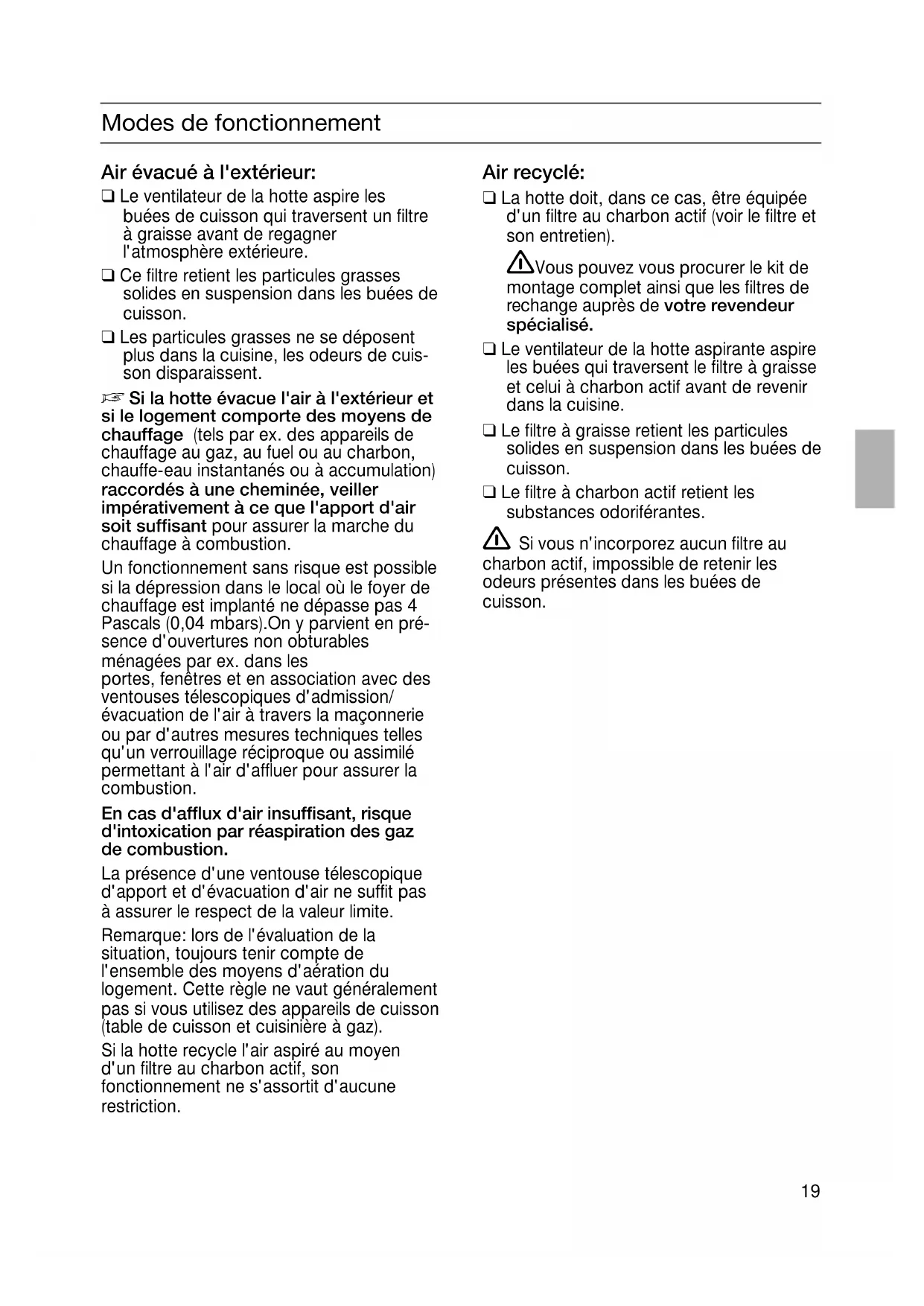 switch it on at the fuse box. Note: If the light does not function, check that the bulbs have been inserted correctly.19 Air évacué à l'extérieur: ❑ Le ventilateur de la hotte aspire les buées de cuisson qui traversent un filtre à graisse avant de regagner l'atmosphère extérieure. ❑ Ce filtre retient les particules grasses solides en suspension dans les buées de cuisson. ❑ Les particules grasses ne se déposent plus dans la cuisine, les odeurs de cuis- son disparaissent.