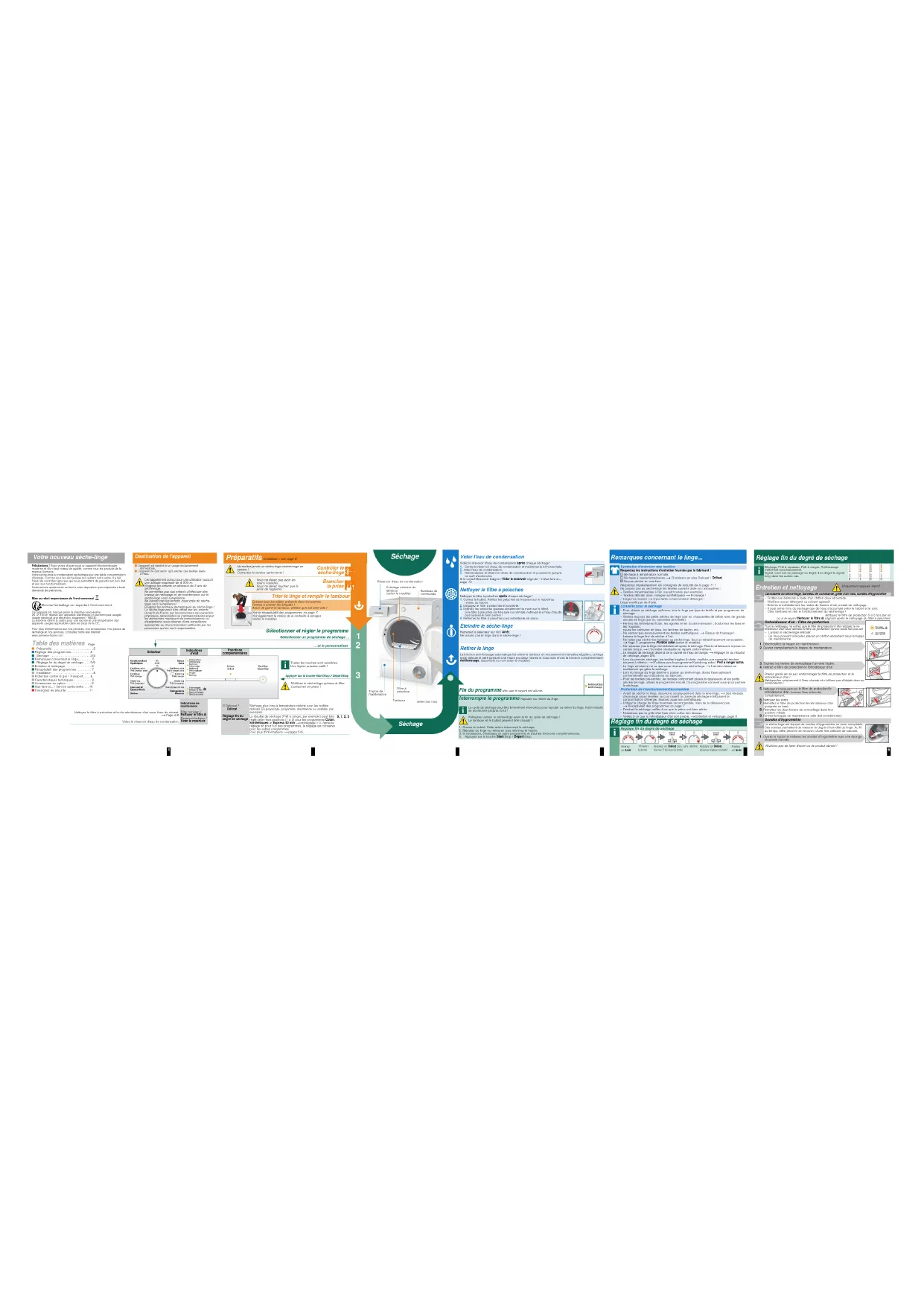 Trappe de maintenanceIndications d'étatʋ Delicaat / Délicat Séchage plus long à température réduite pour les textiles délicats ' (polyacryle, polyamide, élasthanne ou acétate, par exemple). Réglage fin du degré de séchageLe résultat de séchage (Prêt à ranger, par exemple) peut être réglé selon trois positions (1 à 3) pour les programmes Coton, Synthétiques et Express 40 min apréréglage = 0. Après le réglage fin pour l'un des programmes, le réglage est conservé pour les autres programmes. Pour plus d'informations apages 5/6.0, 1, 2, 3Nettoyez le filtre à peluches et/ou le refroidisseur d'air sous l'eau du robinet.aPage 4/6Videz le réservoir d'eau de condensation.Indications de maintenance Filter reinigen / Nettoyer le filtre ¡ Reservoir ledigen /Vider le reservoir Remarques concernant le linge... Symboles d'entretien des textilesRespectez les instructions d'entretien fournies par le fabricant !(cSéchage à température normale. 'cSéchage à basse température a Choisissez en plus Delicaat / Délicat. )cNe pas sécher en machine.Respectez impérativement les consignes de sécurité de la page 11 !Ne passez pas au sèche-linge les textiles suivants (liste non exhaustive) :– Textiles imperméables à l'air (caoutchoutés, par exemple). – Textiles délicats (soie, voilages synthétiques) a Froissage ! – Linge non essoré a importante consommation d'énergie ! Linge souillé par de l'huile.Conseils pour le séchage– Pour obtenir un séchage uniforme, triez le linge par type de textile et par programme de séchage. – Séchez toujours les petits articles de linge (par ex. chaussettes de bébé) avec de grands articles de linge (par ex. serviettes de toilette).– Fermez les fermetures Éclair, les agrafes et les boutons-pression ; boutonnez les taies et les housses ;nouez les ceintures en tissu, les lanières de tablier, etc. – Ne séchez pas excessivement les textiles synthétiques. a Risque de froissage ! Laissez le linge finir de sécher à l'air.– Ne faites pas sécher les lainages au sèche-linge. Seul un rafraîchissement est possible. aPage 7, programme Finition laine (selon le modèle). – Ne repassez pas le linge immédiatement après le séchage. Pliez-le et laissez-le reposer un certain temps. a L'humidité résiduelle se répartit uniformément.