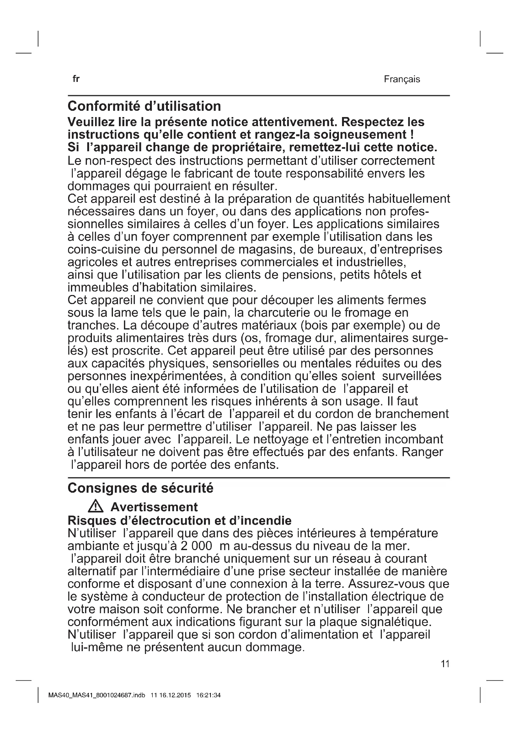 - Garantie And’écartertoutdanger,seulnotreserviceaprès-venteesthabilité àréparerl’appareil,commeparexempleprocéderauremplace- mentd’uncordond’alimentationendommagé.Toujourssurveiller l’appareilpendantsonfonctionnement!Nepasmettrelecordon d’alimentationencontactavecdesélémentsbrûlantsetnepasle faireglissersurdesarêtesvives.Nejamaisplongerl’appareildans l’eauetnepaslemettreaulave-vaisselle.Nepasutiliserl’appareil prèsd’unévierremplid’eau!Nepasutiliserl’appareilavecdes mainshumides,nepaslefairetourneràvide.l’appareildoittoujours êtredébranchédusecteur,aprèschaqueutilisation,lorsqu’iln’est passoussurveillance,lorsqu’ildoitêtremontéoudémonté,avant delenettoyeretencasdepanne.l’appareildoitêtreéteintet débranchédusecteuravantdeprocéderauchangementd’acces- soiresoudepiècescomplémentairesmobilesenfonctionnement. W Avertissement Risque de blessures Lalameesttrèsaiguisée.Nejamaisapprocherlesmainsde lalame.Aprèsavoiréteintl’appareil,sonmoteurcontinuede tournerbrièvement.Attendrel’immobilisationdelalame!Aprèsle travail,placerlalargeurdecoupesurlaposition0.Cetappareil doitêtreutiliséaveclechariotetlerécipientàrésidusenposition d’utilisation,saufsilatailleetlaformeduproduitàtranchernele permettentpas. Avantdeprocéderaunettoyage,débrancherl’appareilpuisretirer lalame.Saisirlalameuniquementparsonsupport,jamaisparla surfacecoupante.S’ilseproduitunecoupuredecourant,l’appareil resteenpositionenclenchéeetseremettoutseulenmarcheune foislecourantrevenu. W Attention Lemoteurpeutsurchauffer!Auboutde5minutesmax.de fonctionnementcontinu,laisserrefroidirl’appareil. W Avertissement Risque d’étouffement Nejamaislaisserlesenfantsdejoueraveclesemballages. MAS40_MAS41_8001024687.indb 12 16.12.2015 16:21:34 13 p. 14