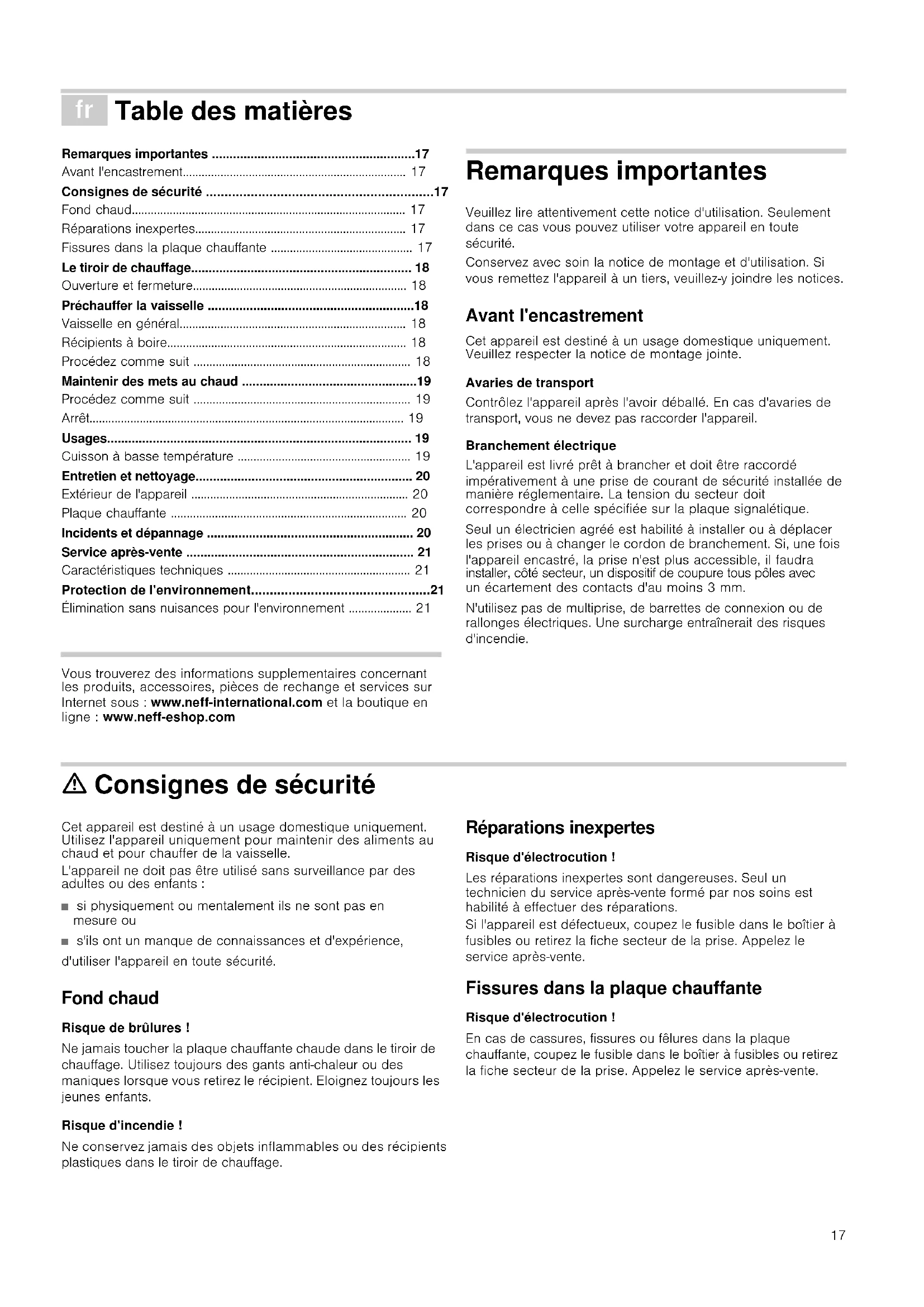 - Élimination sans nuisances pour l'environnement Produktinfo Vous trouverez des informations supplementaires concernant les produits, accessoires, pièces de rechange et services sur Internet sous : www.neff-international.com et la boutique en ligne : www.neff-eshop.com Remarques importantes Veuillez lire attentivement cette notice d'utilisation. Seulement dans ce cas vous pouvez utiliser votre appareil en toute sécurité. Conservez avec soin la notice de montage et d'utilisation. Si vous remettez l'appareil à un tiers, veuillez-y joindre les notices. Avant l'encastrement Cet appareil est destiné à un usage domestique uniquement. Veuillez respecter la notice de montage jointe. Avaries de transport Contrôlez l'appareil après l'avoir déballé. En cas d'avaries de transport, vous ne devez pas raccorder l'appareil. Branchement électrique L'appareil est livré prêt à brancher et doit être raccordé impérativement à une prise de courant de sécurité installée de manière réglementaire. La tension du secteur doit correspondre à celle spécifiée sur la plaque signalétique. Seul un électricien agréé est habilité à installer ou à déplacer les prises ou à changer le cordon de branchement. Si, une fois l'appareil encastré, la prise n'est plus accessible, il faudra installer, côté secteur, un dispositif de coupure tous pôles avec un écartement des contacts d'au moins 3 mm. N'utilisez pas de multiprise, de barrettes de connexion ou de rallonges électriques. Une surcharge entraînerait des risques d'incendie. ã=Consignes de sécurité Cet appareil est destiné à un usage domestique uniquement. Utilisez l'appareil uniquement pour maintenir des aliments au chaud et pour chauffer de la vaisselle. L'appareil ne doit pas être utilisé sans surveillance par des adultes ou des enfants : ■ si physiquement ou mentalement ils ne sont pas en mesure ou ■ s'ils ont un manque de connaissances et d'expérience, d'utiliser l'appareil en toute sécurité. Fond chaud Risque de brûlures ! Ne jamais toucher la plaque chauffante chaude dans le tiroir de chauffage. Utilisez toujours des gants anti-chaleur ou des maniques lorsque vous retirez le récipient. Eloignez toujours les jeunes enfants. Risque d'incendie ! Ne conservez jamais des objets inflammables ou des récipients plastiques dans le tiroir de chauffage. Réparations inexpertes Risque d'électrocution ! Les réparations inexpertes sont dangereuses. Seul un technicien du service après-vente formé par nos soins est habilité à effectuer des réparations. Si l'appareil est défectueux, coupez le fusible dans le boîtier à fusibles ou retirez la fiche secteur de la prise. Appelez le service après-vente. Fissures dans la plaque chauffante Risque d'électrocution ! En cas de cassures, fissures ou fêlures dans la plaque chauffante, coupez le fusible dans le boîtier à fusibles ou retirez la fiche secteur de la prise. Appelez le service après-vente.18 Le tiroir de chauffage Dans le tiroir de chauffage vous pouvez préchauffer de la vaisselle ou maintenir des aliments au chaud. L'appareil chauffe uniquement si le tiroir est correctement fermé. Ouverture et fermeture En cas d'appareils sans poignée : Appuyez au milieu du tiroir pour l'ouvrir ou le fermer. Lors de l'ouverture, le tiroir ressort légèrement. Il peut ensuite être facilement retiré. Préchauffer la vaisselle Les mets refroidissent moins vite dans une vaisselle préchauffée. Les boissons restent plus longtemps chaudes. Vaisselle en général Vous pouvez charger le tiroir de chauffage d'un poids maximal de 25 kg. Vous pouvez p.ex. préchauffer de la vaisselle de table pour 6 à 12 personnes. Ranger la vaisselle Si possible, répartissez la vaisselle sur toute la surface. Des assiettes empilées sont chauffées moins rapidement que des pièces de vaisselle individuelles, comme p.ex. 2 terrines. Récipients à boire Chauffer les récipients à boire, tels que tasses à espresso, toujours avec la position 2. ã=Risque de brûlures ! A la puissance 3 ou 4 les récipients à boire deviennent très chauds. Procédez comme suit 1.Ranger la vaisselle dans le tiroir.2.Régler le sélecteur sur la position 4.Pour les récipients à boire, sélectionnez toujours la position 2. Le témoin de service clignote. 3.Fermer le tiroir de chauffage. Le témoin de service est allumé en continu. L'appareil chauffe. Combien de temps dure le préchauffage La durée du préchauffage dépend du matériau et de l'épaisseur de la vaisselle, de la quantité de vaisselle, de la hauteur et de la disposition de la vaisselle. Si possible, répartissez la vaisselle sur toute la surface. En cas de service de table pour 6 personnes, le préchauffage dure environ 15-25 minutes. Arrêt Ouvrez le tiroir. Mettez le sélecteur sur Arrêt. Enlever la vaisselle Enlevez la vaisselle du tiroir en utilisant des maniques ou des gants de cuisine. ã=Risque de brûlures ! La surface de la plaque chauffante est chaude. Les pièces de vaisselle inférieures deviennent plus chaudes que les pièces supérieures. 7pPRLQGHVHUYLFH /RUVTXHYRXVDOOXPH]ODSSDUHLO p. 21