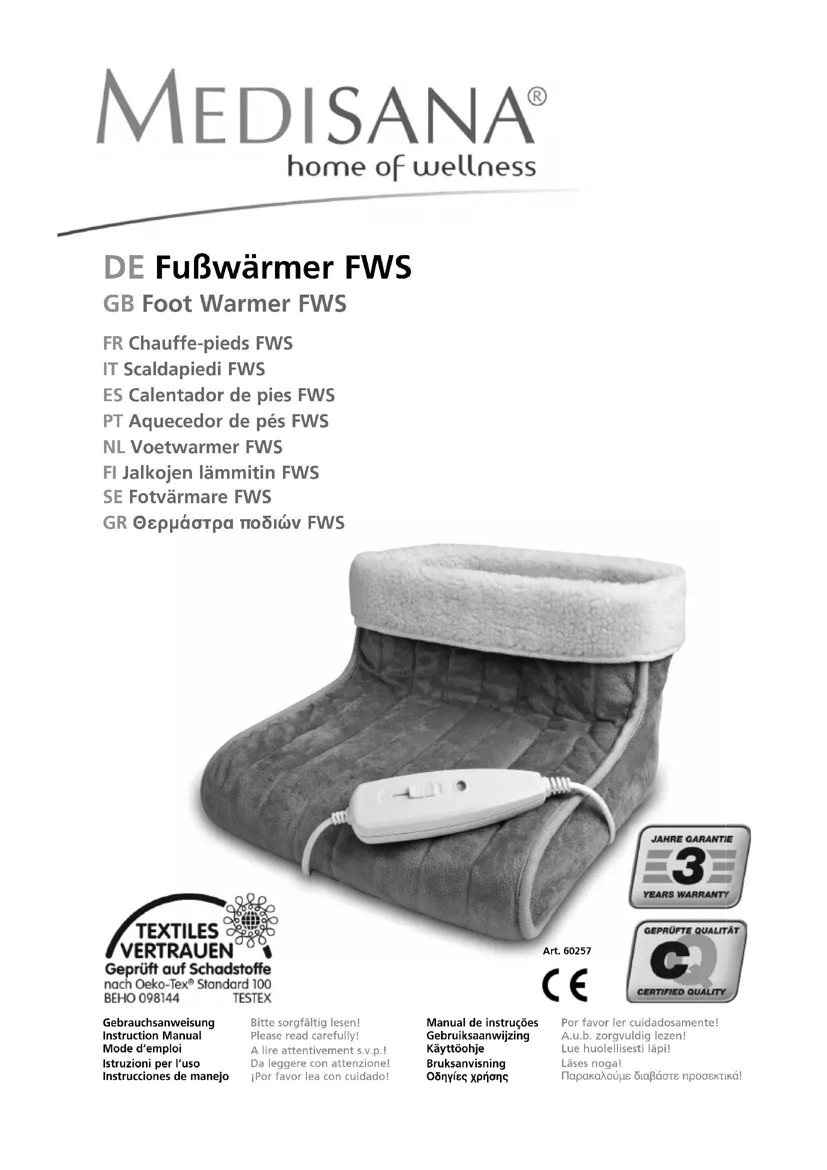 - Si l'application est ressentie comme étant désagréable, voire douloureuse, interrompez immédiatement le traitement. Félicitations et merci de votre confiance! Vous venez d’acquérir un chauffe-pieds FWS, produit de qualité MEDISANA. Afin d’obtenir les résultats souhaités et de pouvoir profiter longtemps des avantages de votre chauffe-pieds MEDISANA FWS, nous vous recommandons de lire attentivement les conseils d’utilisation et d’entretien suivants.Veuillez vérifier si l'appareil est au complet et ne présente aucun dommage. En cas de doute, ne faites pas fonctionner l’appareil et adressez-vous à votrerevendeur ou à un point de service après-vente.La fourniture comprend: