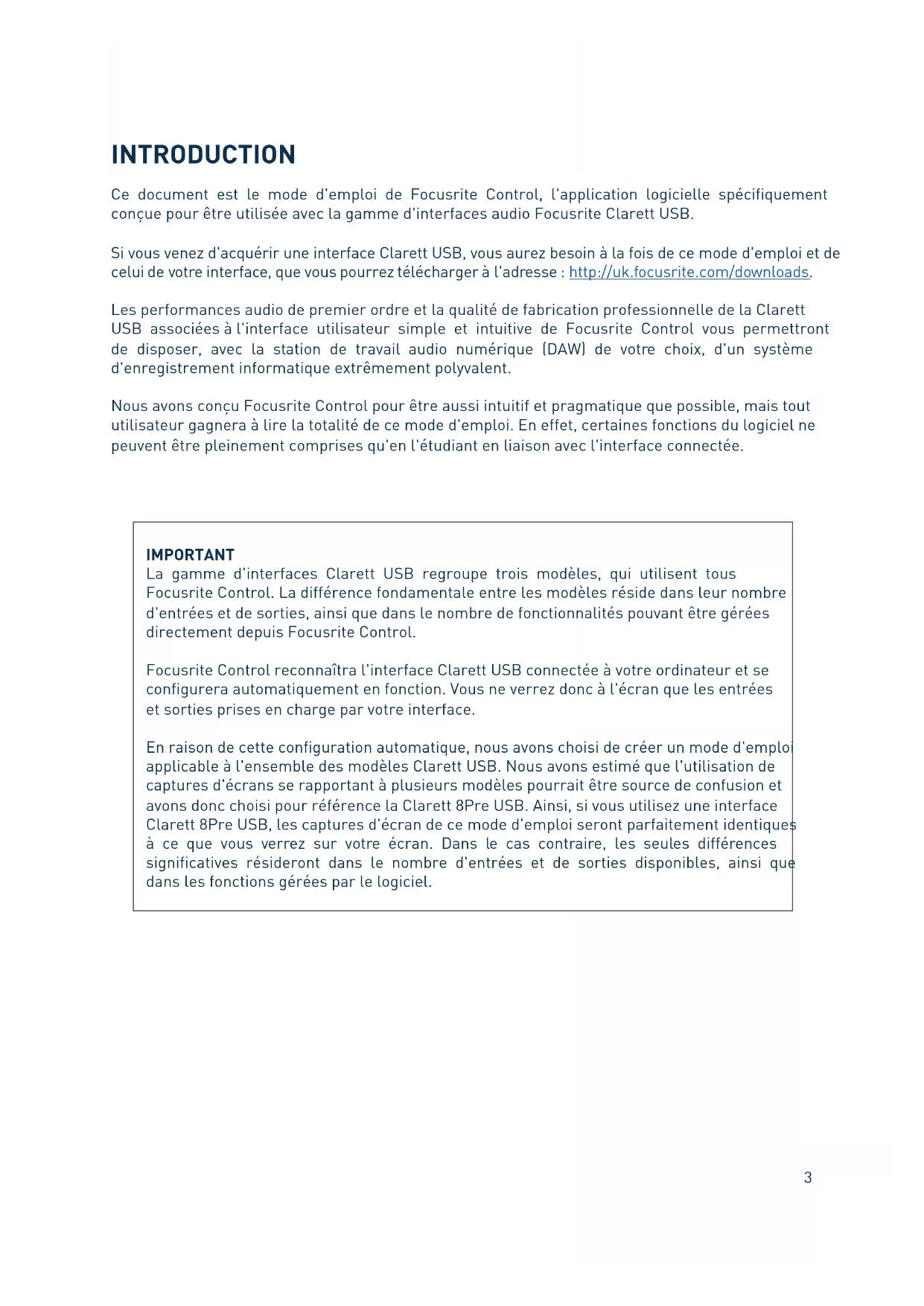 INTRODUCTION Ce document est le mode d'emploi de Focusrite Control, l'application logicielle spécifiquement conçue pour être utilisée avec la gamme d'interfaces audio Focusrite Clarett USB. Si vous venez d'acquérir une interface Clarett USB, vous aurez besoin à la fois de ce mode d'emploi et de celui de votre interface, que vous pourrez télécharger à l'adresse : http://uk.focusrite.com/downloads. Les performances audio de premier ordre et la qualité de fabrication professionnelle de la Clarett USB associées à l'interface utilisateur simple et intuitive de Focusrite Control vous permettront de disposer, avec la station de travail audio numérique (DAW) de votre choix, d'un système d'enregistrement informatique extrêmement polyvalent. Nous avons conçu Focusrite Control pour être aussi intuitif et pragmatique que possible, mais tout utilisateur gagnera à lire la totalité de ce mode d'emploi. En effet, certaines fonctions du logiciel ne peuvent être pleinement comprises qu'en l'étudiant en liaison avec l'interface connectée. IMPORTANT La gamme d'interfaces Clarett USB regroupe trois modèles, qui utilisent tous Focusrite Control. La différence fondamentale entre les modèles réside dans leur nombre d'entrées et de sorties, ainsi que dans le nombre de fonctionnalités pouvant être gérées directement depuis Focusrite Control. Focusrite Control reconnaîtra l'interface Clarett USB connectée à votre ordinateur et se configurera automatiquement en fonction. Vous ne verrez donc à l'écran que les entrées et sorties prises en charge par votre interface. En raison de cette configuration automatique, nous avons choisi de créer un mode d'emploi applicable à l'ensemble des modèles Clarett USB. Nous avons estimé que l'utilisation de captures d'écrans se rapportant à plusieurs modèles pourrait être source de confusion et avons donc choisi pour référence la Clarett 8Pre USB. Ainsi, si vous utilisez une interface Clarett 8Pre USB, les captures d'écran de ce mode d'emploi seront parfaitement identiques à ce que vous verrez sur votre écran. Dans le cas contraire, les seules différences significatives résideront dans le nombre d'entrées et de sorties disponibles, ainsi que dans les fonctions gérées par le logiciel.4 Configuration requise IMPORTANT Veuillez utiliser le lien suivant pour obtenir les dernières informations disponibles sur les ordinateurs et systèmes d'exploitation compatibles avec Focusrite Control et tous les produits Clarett USB : www.focusrite.com/downloads/os Installation du logiciel Tous les logiciels requis par les interfaces Clarett USB, notamment Focusrite Control et plusieurs programmes additionnels performants et utiles, peuvent être téléchargés sur le site Web de Focusrite (www.focusrite.com/register). Le guide de prise en main fourni avec votre interface Clarett USB contient des codes de validation qu'il vous faudra saisir dans la page Web ci-dessus. Cette procédure vous garantit de disposer des versions les plus récentes des logiciels.