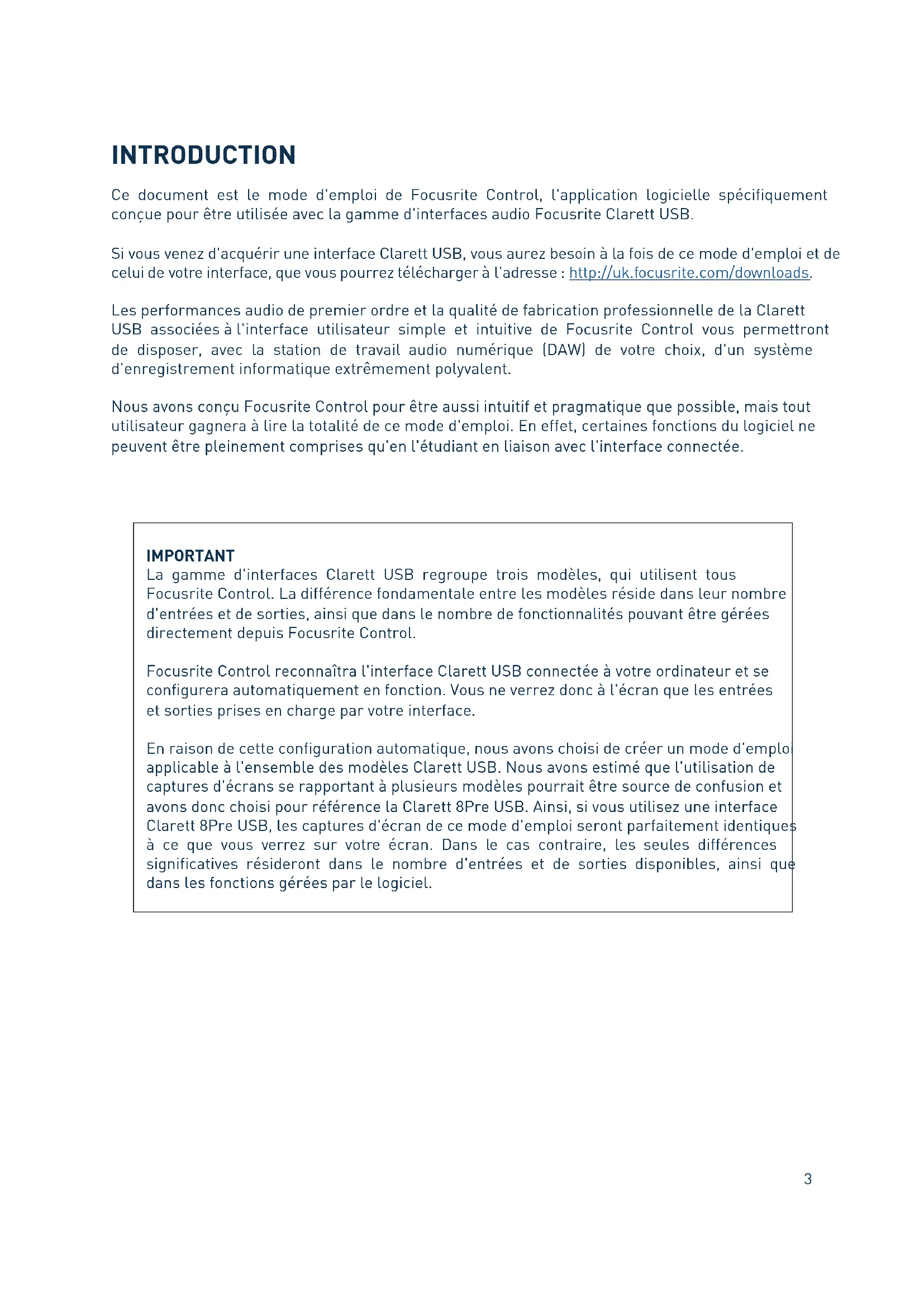 INTRODUCTION Ce document est le mode d'emploi de Focusrite Control, l'application logicielle spécifiquement conçue pour être utilisée avec la gamme d'interfaces audio Focusrite Clarett USB. Si vous venez d'acquérir une interface Clarett USB, vous aurez besoin à la fois de ce mode d'emploi et de celui de votre interface, que vous pourrez télécharger à l'adresse : http://uk.focusrite.com/downloads. Les performances audio de premier ordre et la qualité de fabrication professionnelle de la Clarett USB associées à l'interface utilisateur simple et intuitive de Focusrite Control vous permettront de disposer, avec la station de travail audio numérique (DAW) de votre choix, d'un système d'enregistrement informatique extrêmement polyvalent. Nous avons conçu Focusrite Control pour être aussi intuitif et pragmatique que possible, mais tout utilisateur gagnera à lire la totalité de ce mode d'emploi. En effet, certaines fonctions du logiciel ne peuvent être pleinement comprises qu'en l'étudiant en liaison avec l'interface connectée. IMPORTANT La gamme d'interfaces Clarett USB regroupe trois modèles, qui utilisent tous Focusrite Control. La différence fondamentale entre les modèles réside dans leur nombre d'entrées et de sorties, ainsi que dans le nombre de fonctionnalités pouvant être gérées directement depuis Focusrite Control. Focusrite Control reconnaîtra l'interface Clarett USB connectée à votre ordinateur et se configurera automatiquement en fonction. Vous ne verrez donc à l'écran que les entrées et sorties prises en charge par votre interface. En raison de cette configuration automatique, nous avons choisi de créer un mode d'emploi applicable à l'ensemble des modèles Clarett USB. Nous avons estimé que l'utilisation de captures d'écrans se rapportant à plusieurs modèles pourrait être source de confusion et avons donc choisi pour référence la Clarett 8Pre USB. Ainsi, si vous utilisez une interface Clarett 8Pre USB, les captures d'écran de ce mode d'emploi seront parfaitement identiques à ce que vous verrez sur votre écran. Dans le cas contraire, les seules différences significatives résideront dans le nombre d'entrées et de sorties disponibles, ainsi que dans les fonctions gérées par le logiciel.4 Configuration requise IMPORTANT Veuillez utiliser le lien suivant pour obtenir les dernières informations disponibles sur les ordinateurs et systèmes d'exploitation compatibles avec Focusrite Control et tous les produits Clarett USB : www.focusrite.com/downloads/os Installation du logiciel Tous les logiciels requis par les interfaces Clarett USB, notamment Focusrite Control et plusieurs programmes additionnels performants et utiles, peuvent être téléchargés sur le site Web de Focusrite (www.focusrite.com/register). Le guide de prise en main fourni avec votre interface Clarett USB contient des codes de validation qu'il vous faudra saisir dans la page Web ci-dessus. Cette procédure vous garantit de disposer des versions les plus récentes des logiciels.