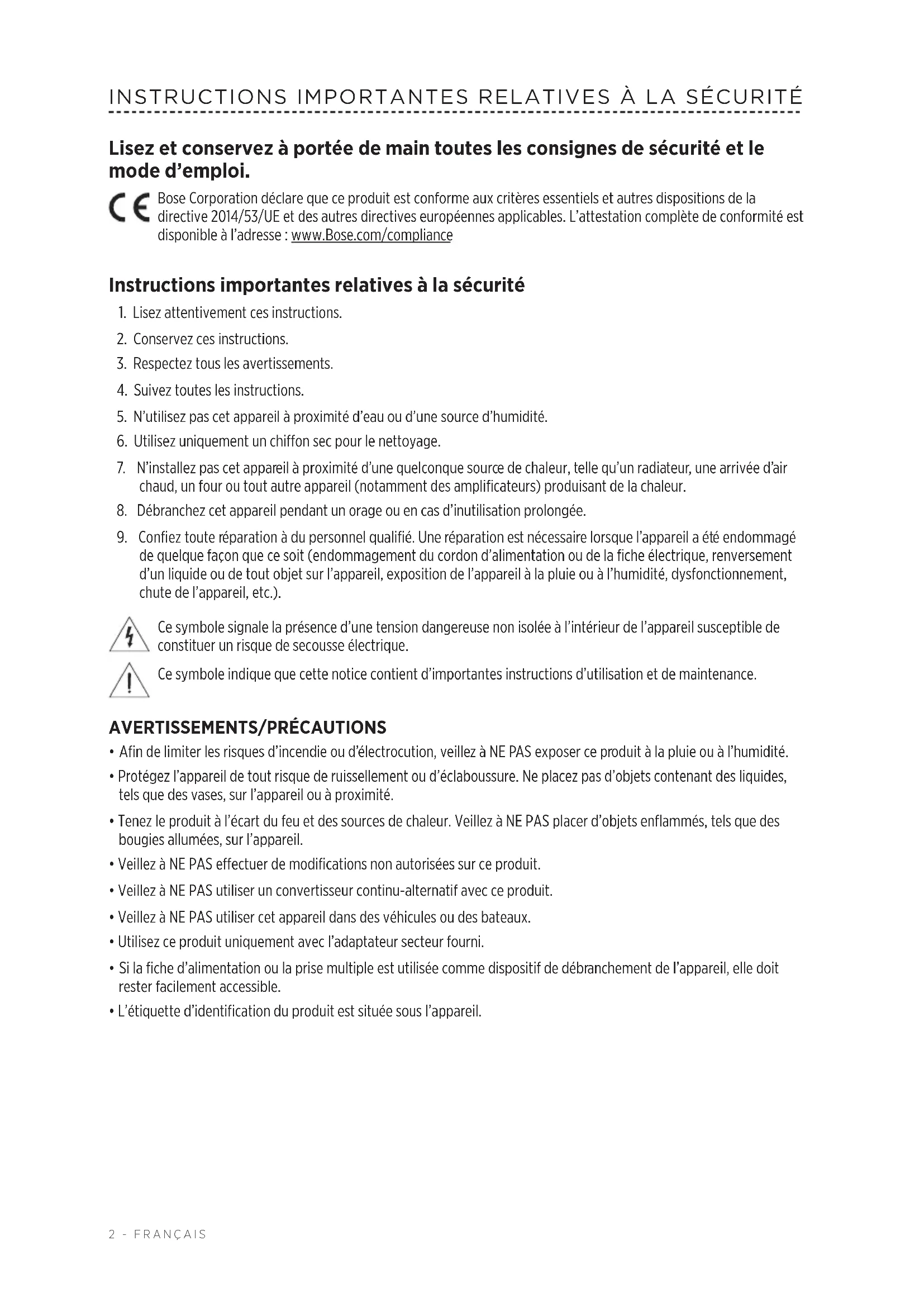 Lisez et conservez à portée de main toutes les consignes de sécurité et le mode d’emploi. Bose Corporation déclare que ce produit est conforme aux critères essentiels et autres dispositions de la directive 2014/53/UE et des autres directives européennes applicables. L’attestation complète de conformité est disponible à l’adresse : www.Bose.com/compliance Instructions importantes relatives à la sécurité