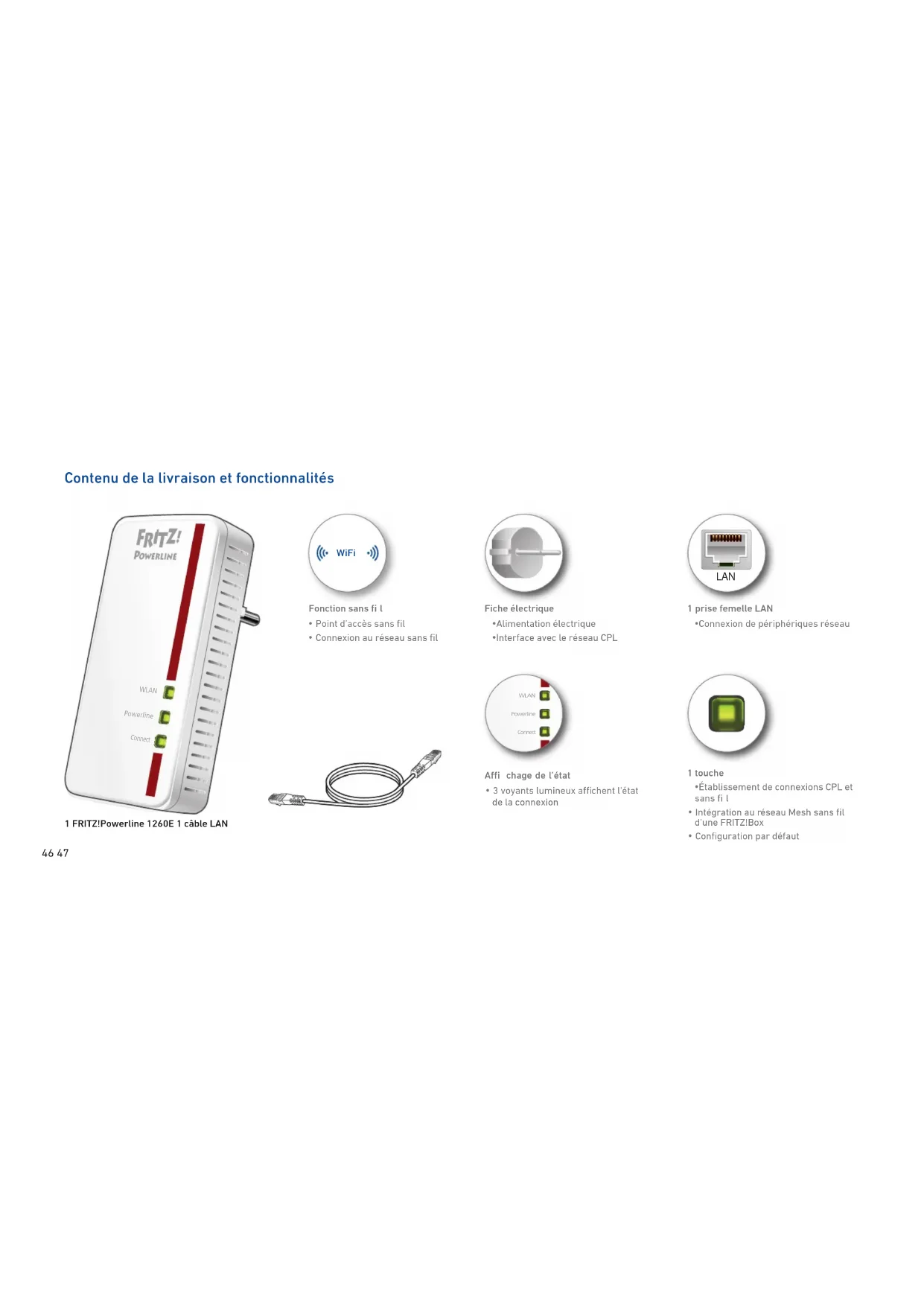 - Connexion au réseau sans fi l 1 FRITZ!Powerline 1260E 1 câbleLAN WLAN PowerlineConnect WLAN Powerline Connect LAN WiFi 46 47Conditions requises pour des débits de l‘ordre du Gigabit Pour atteindre des débits élevés de l‘ordre du Gigabit (débits bruts jusqu‘à 1200 Mbit/s), le FRITZ!Powerline1260E recourt à la technologie MIMO. Le MIMO requiert un circuit électrique moder- ne à prises électriques de sécurité et conducteurs de phase (L), neutre (N) et de protection (PE). Dans ces circuits électriques à trois conducteurs, le FRITZ!Powerline1260E peut créer, sur la phase et le conducteur de protection, une paire de conducteurs supplémen- taire pour la transmission des données et augmenter ainsi le débit de données. Vous pouvez également utiliser le FRITZ!Powerline1260E sur des circuits électriques plus anciens à deux con- ducteurs. Dans ce cas, le neutre assume le rôle de conducteur de protection. Sur ces circuits, les débits de données possi- bles sont de 600 Mbit/s (bruts). Interface utilisateur Le FRITZ!Powerline 1260E a une interface utilisateur que vous pouvez ouvrir sur votre ordinateur à l’aide d’un navigateur Internet. Saisissez l’adresse suivante dans votre navigateur Internet: Au sein du réseau domestique d‘une FRITZ!Box : http://fritz.powerline Avec plusieurs appareils FRITZ!Powerline ayant une interface utilisateur: <Adresse IP> (l’adresse IP est indiquée sur http://fritz.box sous «Réseau domestique») Au sein du réseau domestique d’un autre routeur Internet : < Adresse IP> (l’adresse IP est indiquée dans l’interface utilisateur du routeur) Sans connexion au réseau domesti- que ou au routeur :