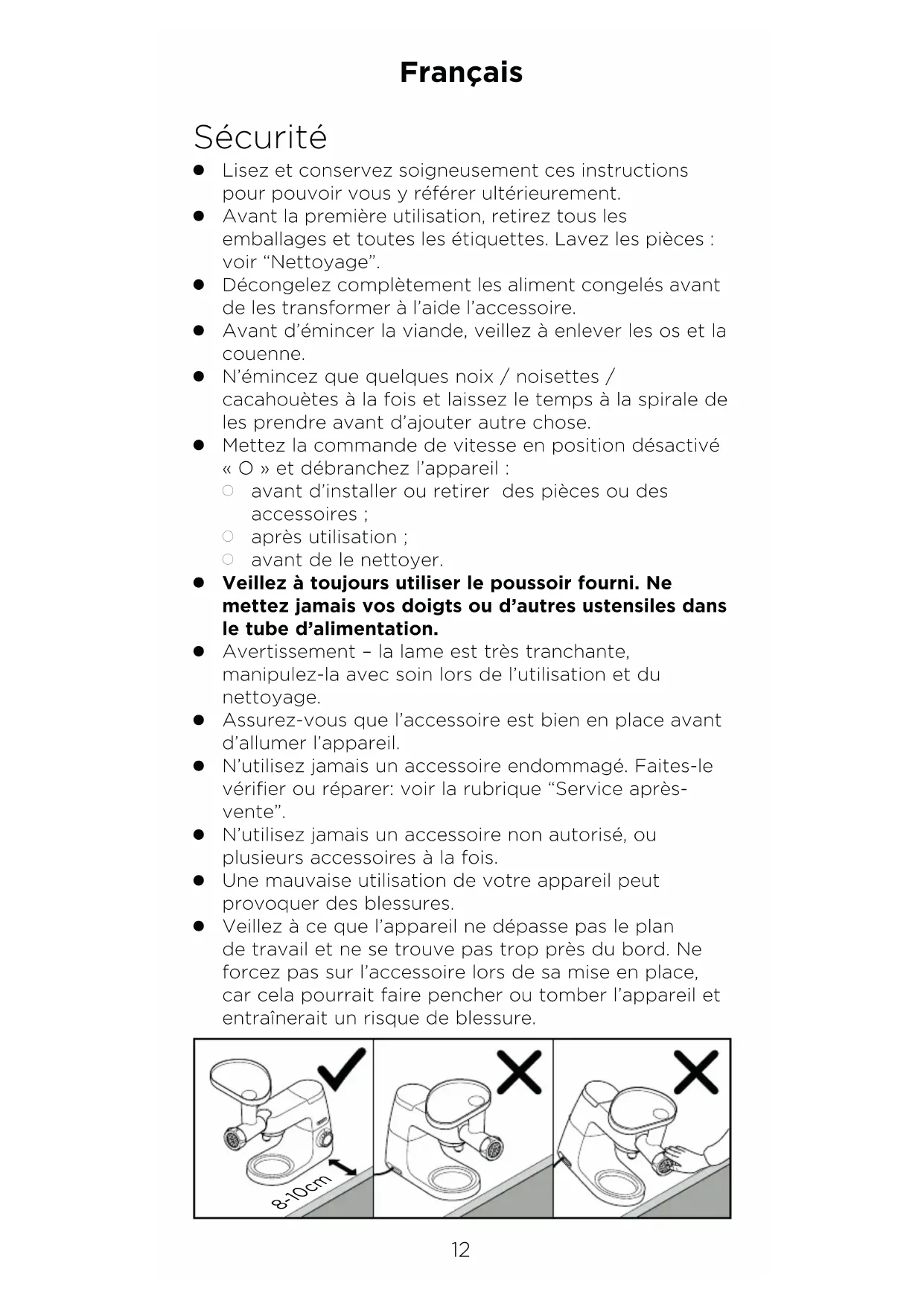 Vervaardigd in China.12 Sécurité OLisez et conservez soigneusement ces instructions pour pouvoir vous y référer ultérieurement.OAvant la première utilisation, retirez tous les emballages et toutes les étiquettes. Lavez les pièces : voir “Nettoyage”.ODécongelez complètement les aliment congelés avant de les transformer à l’aide l’accessoire.OAvant d’émincer la viande, veillez à enlever les os et la couenne.ON’émincez que quelques noix / noisettes / cacahouètes à la fois et laissez le temps à la spirale de les prendre avant d’ajouter autre chose.OMettez la commande de vitesse en position désactivé « O » et débranchez l’appareil :