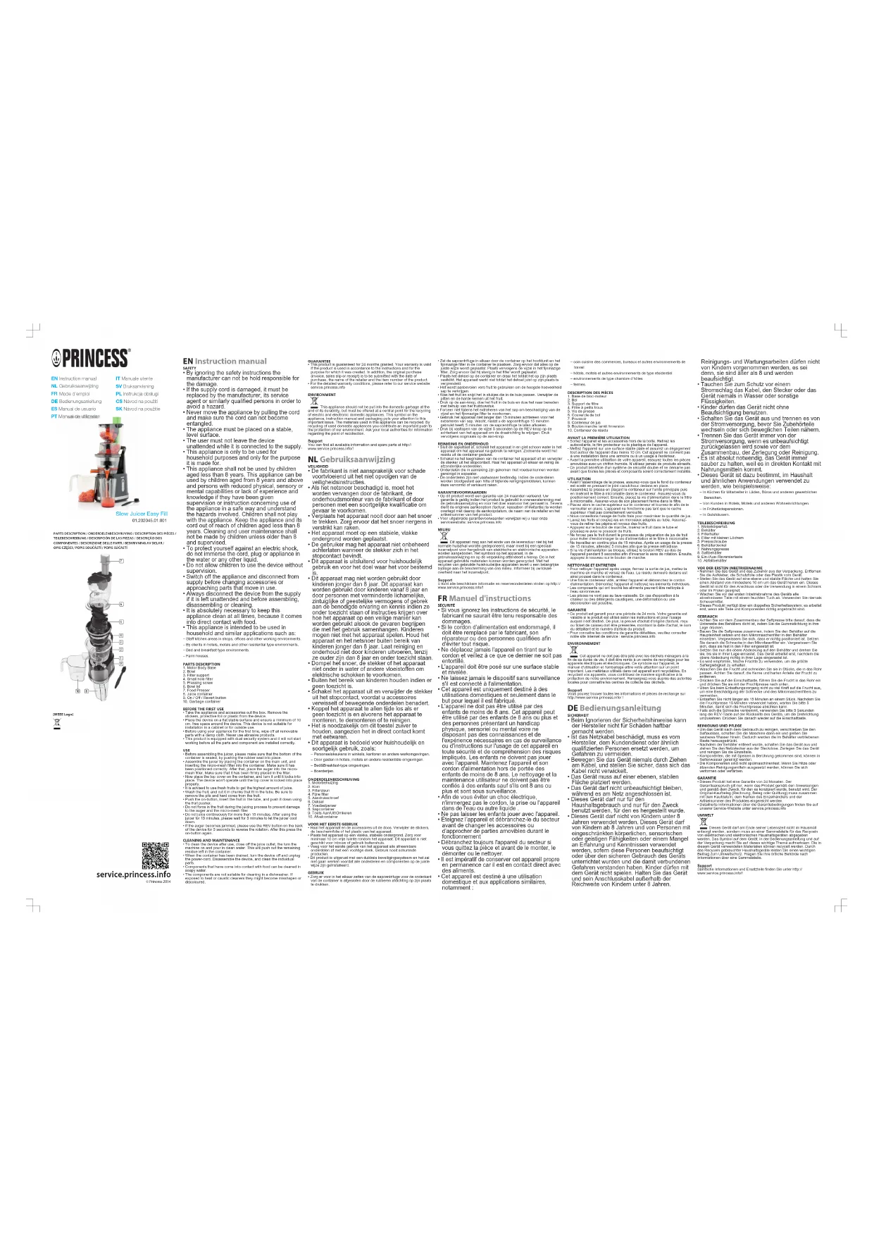 - Cet appareil est destiné à une utilisation domestique et aux applications similaires, notamment: – coin cuisine des commerces, bureaux et autres environnements detravail– hôtels, motels et autres environnements de type résidentiel– environnements de type chambre d’hôtes– fermes.DESCRIPTION DES PIÈCES1. Base de bloc-moteur2. Bol3. Support de filtre4. Filtre à petits trous5. Vis de presse6. Couvercle de bol7. Poussoir8. Conteneur de jus9. Bouton marche /arrêt /inversion10. Conteneur de résiduAVANT LA PREMIÈRE UTILISATION• Sortez l'appareil et les accessoires hors de la boîte.Retirez lesautocollants, le film protecteur ou le plastique de l'appareil.• Mettez l'appareil sur une surface stable plate et assurez un dégagementtout autour de l'appareil d'au moins 10 cm. Cet appareil ne convient pasà une installation dans une armoire ou à un usage à l'extérieur.• Avant la première utilisation de votre appareil, essuyez toutes les piècesamovibles avec un chiffon humide. N’utilisez jamais de produits abrasifs.• Ce produit bénéficie d'un système de sécurité double et ne démarre pasavant que toutes les pièces et composants soient correctement installés.UTILISATION• Avant l'assemblage de la presse, assurez-vous que le fond du conteneurest scellé en pressant le joint caoutchouc dedans en place.• Assemblez la presse en plaçant le conteneur sur l'unité principale puisen insérant le filtre à micromaille dans le conteneur. Assurez-vous dupositionnement correct. Ensuite, placez la vis d'alimentation dans le filtreà micromaille. Assurez-vous de son placement ferme dans le filtre.• Placez alors le cache supérieur sur le conteneur et tournez-le afin de leverrouiller en place. L'appareil ne fonctionne pas tant que le cachesupérieur n'est pas correctement verrouillé.• Nous conseillons l'usage de fruits frais pour maximiser la quantité de jus.• Lavez les fruits et coupez-les en morceaux adaptés au tube. Assurez-vous de retirer les pépins et noyaux des fruits.• Appuyez sur le bouton de marche, insérez le fruit dans le tube etpoussez-le avec le poussoir de fruits.• Ne forcez pas le fruit durant le processus de préparation de jus de fruitpour éviter d'endommager la vis d'alimentation et le filtre à micromaille.• Ne travaillez en continu plus de 15 minutes. Après un usage de la pressede 15 minutes, attendez 5 minutes afin que la presse refroidisse.• Si la vis d'alimentation se bloque, utilisez le bouton REV au dos del'appareil pendant 5 secondes afin d'inverser le sens de rotation. Ensuite,appuyez à nouveau sur le bouton de marche.NETTOYAGE ET ENTRETIEN• Pour nettoyer l'appareil après usage, fermez la sortie de jus, mettez lamachine en marche et versez de l'eau. Le résidu demeuré dedans estainsi poussé dans le conteneur.• Une fois le conteneur vidé, arrêtez l'appareil et débranchez le cordond'alimentation. Démontez l'appareil et nettoyez les éléments individuels.• Les composants qui ont touché les aliments peuvent être nettoyés àl’eau savonneuse.• Les pièces ne vont pas au lave-vaisselle. En cas d'exposition à lachaleur ou des détergents caustiques, une déformation ou unedécoloration est possible.GARANTIE• Ce produit est garanti pour une période de 24 mois. Votre garantie estvalable si le produit est utilisé selon les instructions et pour l'usageauquel il est destiné. De plus, la preuve d'achat d'origine (facture, reçuou ticket de caisse) doit être présentée, montrant la date d'achat, le nomdu détaillant et le numéro d'article du produit.• Pour connaître les conditions de garantie détaillées, veuillez consulternotre site Internet de service: service.princess.infoENVIRONNEMENTCet appareil ne doit pas être jeté avec les déchets ménagers à lafin de sa durée de vie, il doit être remis à un centre de recyclage pour lesappareils électriques et électroniques. Ce symbole sur l'appareil, lemanuel d'utilisation et l'emballage attire votre attention sur un pointimportant. Les matériaux utilisés dans cet appareil sont recyclables. Enrecyclant vos appareils, vous contribuez de manière significative à laprotection de notre environnement. Renseignez-vous auprès des autoritéslocales pour connaître les centres de collecte des déchets.SupportVous pouvez trouver toutes les informations et pièces de rechange surhttp://www.service.princess.info/! DEBedienungsanleitung SICHERHEIT