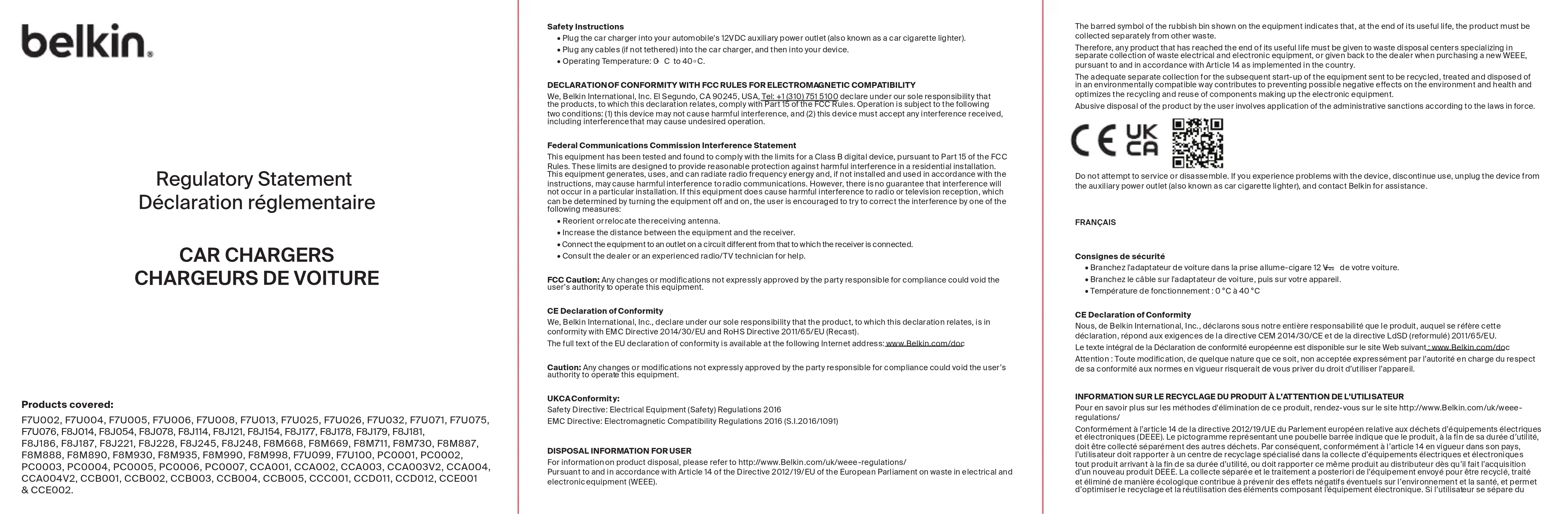 - Température de fonctionnement : 0 °C à 40 °C CE Declaration of Conformity Nous, de Belkin International, Inc., déclarons sous notre entière responsabilité que le produit, auquel se réfère cette déclaration, répond aux exigences de la directive CEM 2014/30/CE et de la directive LdSD (reformulé) 2011/65/EU. Le texte intégral de la Déclaration de conformité européenne est disponible sur le site Web suivant : www.Belkin. com/doc Attention : Toute modification, de quelque nature que ce soit, non acceptée expressément par l’autorité en charge du respect de sa conformité aux normes en vigueur risquerait de vous priver du droit d’utiliser l’appareil. INFORMATION SUR LE RECYCLAGE DU PRODUIT À L’ATTENTION DE L’UTILISATEUR Pour en savoir plus sur les méthodes d'élimination de ce produit, rendez-vous sur le site http://www.Belkin.com/uk/weee-regulations/ Conformément à l’article 14 de la directive 2012/19/UE du Parlement européen relative aux déchets d’équipements électriques et électroniques (DEEE). Le pictogramme représentant une poubelle barrée indique que le produit, à la fin de sa durée d’utilité, doit être collecté séparément des autres déchets. Par conséquent, conformément à l’article 14 en vigueur dans son pays, l’utilisateur doit rapporter à un centre de recyclage spécialisé dans la collecte d’équipements électriques et électroniques tout produit arrivant à la fin de sa durée d’utilité, ou doit rapporter ce même produit au distributeur dès qu’il fait l’acquisition d’un nouveau produit DEEE. La collecte séparée et le traitement a posteriori de l’équipement envoyé pour être recyclé, traité et éliminé de manière écologique contribue à prévenir des effets négatifs éventuels sur l’environnement et la santé, et permet d’optimiser le recyclage et la réutilisation des éléments composant l’équipement électronique. Si l’utilisateur se sépare du produit de manière incorrecte, il fera l’objet de sanctions administratives comme stipulé par la législation en vigueur. N'essayez pas de désassembler le produit ou de le réparer vous-même. En cas de problème avec l'appareil, arrêtez de l'utiliser, débranchez l'adaptateur allume-cigare et contactez Belkin pour obtenir de l'aide. ESPAÑOL Instrucciones de seguridad