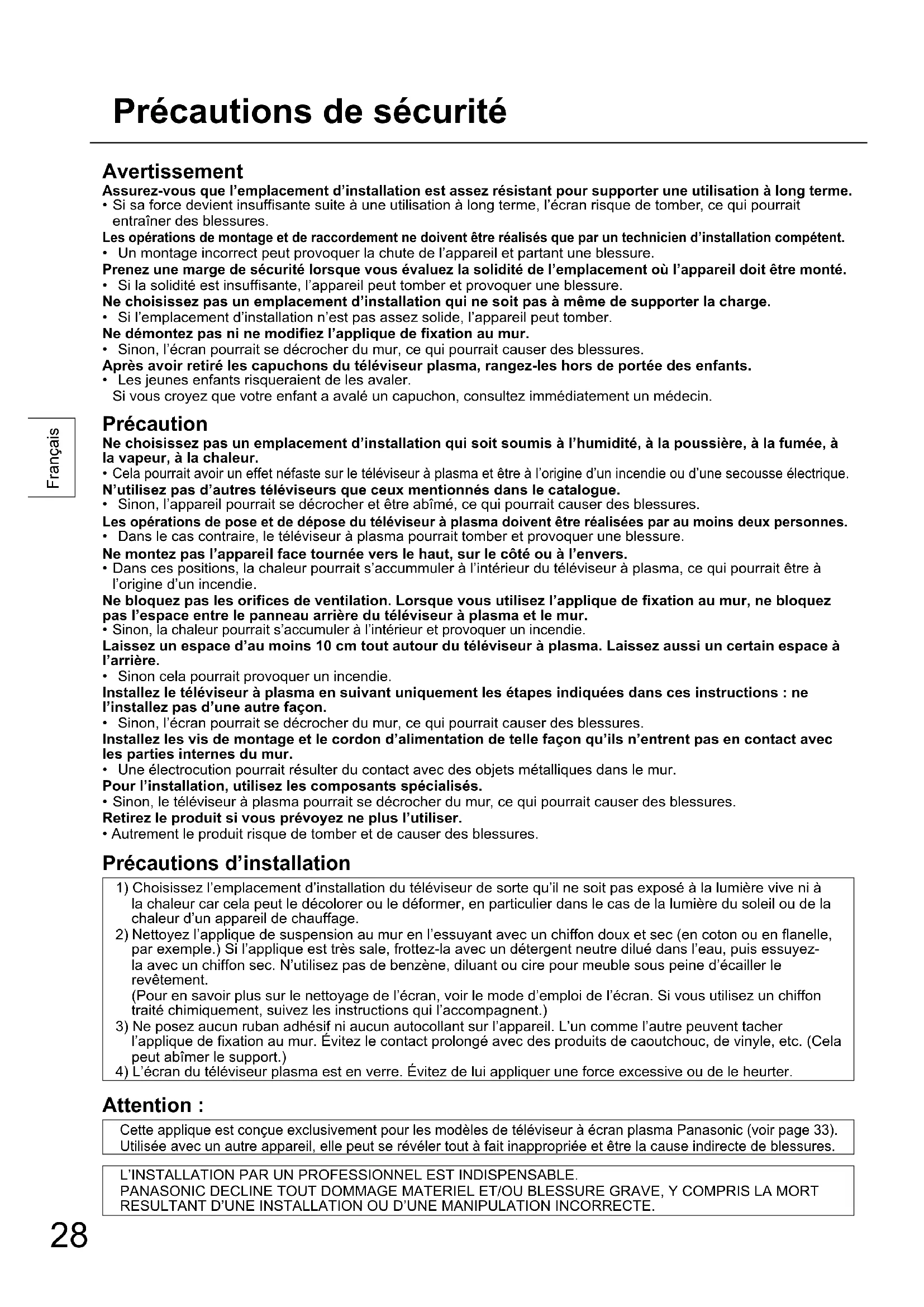 - La rimozione dello schermo al plasma dalla staffa di montaggio su parete deve essere eseguita soltanto da un professionista.28 Français Précautions de sécurité Avertissement Assurez-vous que l’emplacement d’installation est assez résistant pour supporter une utilisation à long terme.