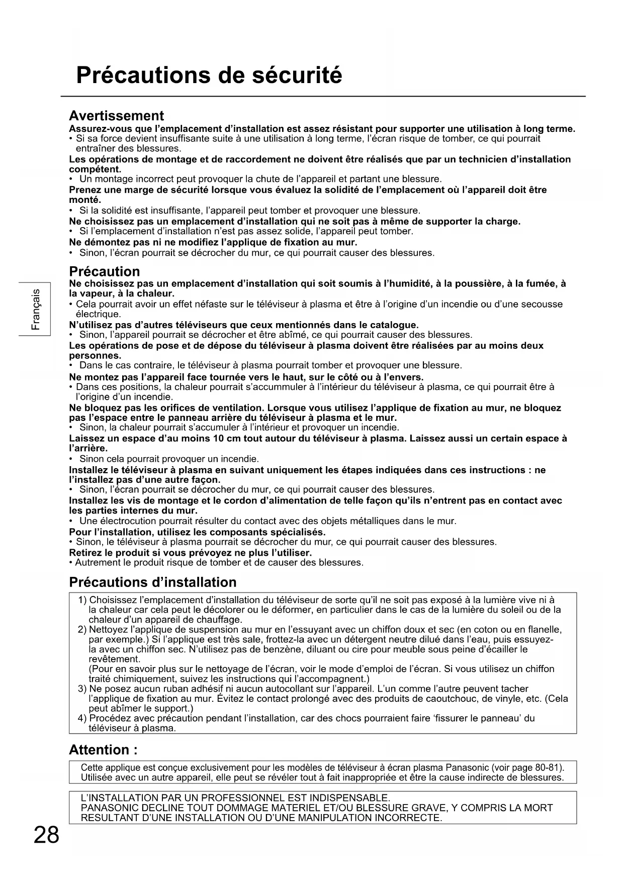 Superficie della parete Superficie della parete28 Français Précautions de sécurité Avertissement Assurez-vous que l’emplacement d’installation est assez résistant pour supporter une utilisation à long terme.