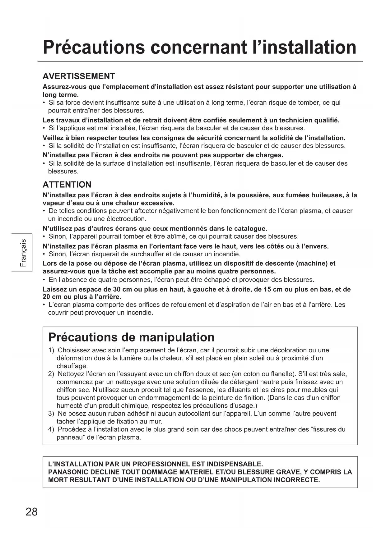 Montaggio verticaleMontaggio orizzontale Vite di fissaggio gancio di sicurezzaGancio di sicurezzaGancio di sicurezzaVite di fissaggio gancio di sicurezzaIncavi (per il montaggio orizzontale)Incavi (per il montaggio verticale) ● Accertarsi di serrare le ganci di sicurezza a sinistra e a destra per impedire il distacco dello schermo al plasma dalla staffa per montaggio alla parete. Attenzione Gancio di sicurezza ● Per rimuovere lo schermo, sollevarlo di circa 60 mm. Nota Rimuovere i ganci di sicurezza (x2) che erano attaccati alle staffe per montaggio alla parete. Sollevare lo schermo diritto.28 AVERTISSEMENT Assurez-vous que l’emplacement d’installation est assez résistant pour supporter une utilisation à long terme.• Si sa force devient insuffisante suite à une utilisation à long terme, l’écran risque de tomber, ce qui pourrait entraîner des blessures.Les travaux d’installation et de retrait doivent être confiés seulement à un technicien qualifié.• Si I’applique est mal installée, l’écran risquera de basculer et de causer des blessures.Veillez à bien respecter toutes les consignes de sécurité concernant la solidité de l’installation.• Si la solidité de I’nstallation est insuffisante, l’écran risquera de basculer et de causer des blessures.N’installez pas I’écran à des endroits ne pouvant pas supporter de charges.• Si la solidité de la surface d’installation est insuffisante, l’écran risquera de basculer et de causer des blessures. ATTENTION N’installez pas I’écran à des endroits sujets à l’humidité, à la poussière, aux fumées huileuses, à la vapeur d’eau ou à une chaleur excessive.• De telles conditions peuvent aftecter négativement le bon fonctionnement de l’écran plasma, et causer un incendie ou une électrocution.N’utilisez pas d’autres écrans que ceux mentionnés dans le catalogue.• Sinon, I’appareil pourrait tomber et être abîmé, ce qui pourrait causer des blessures.N’installez pas I’écran plasma en l’orientant face vers le haut, vers les côtés ou à l’envers.• Sinon, I’écran risquerait de surchauffer et de causer un incendie.Lors de la pose ou dépose de l’écran plasma, utilisez un dispositif de descente (machine) et assurez-vous que la tâche est accomplie par au moins quatre personnes.• En l’absence de quatre personnes, l’écran peut être échappé et provoquer des blessures.Laissez un espace de 30 cm ou plus en haut, à gauche et à droite, de 15 cm ou plus en bas, et de 20 cm ou plus à I’arrière.• L’écran plasma comporte des orifices de refoulement et d’aspiration de l’air en bas et à l’arrière. Les couvrir peut provoquer un incendie. Précautions de manipulation 1) Choisissez avec soin l’emplacement de l’écran, car il pourrait subir une décoloration ou une déformation due à la lumière ou la chaleur, s’il est placé en plein soleil ou à proximité d’un chauffage.2) Nettoyez l’écran en l’essuyant avec un chiffon doux et sec (en coton ou flanelle). S’il est très sale, commencez par un nettoyage avec une solution diluée de détergent neutre puis finissez avec un chiffon sec. N’utilisez aucun produit tel que l’essence, les diluants et les cires pour meubles qui tous peuvent provoquer un endommagement de la peinture de finition. (Dans le cas d’un chiffon humecté d’un produit chimique, respectez les précautions d’usage.)3) Ne posez aucun ruban adhésif ni aucun autocollant sur l’appareil. L’un comme l’autre peuvent tacher l’applique de fixation au mur.4) Procédez à l’installation avec le plus grand soin car des chocs peuvent entraîner des “fissures du panneau” de l’écran plasma. Précautions concernant l’installation L’INSTALLATION PAR UN PROFESSIONNEL EST INDISPENSABLE. PANASONIC DECLINE TOUT DOMMAGE MATERIEL ET/OU BLESSURE GRAVE, Y COMPRIS LA MORT RESULTANT D’UNE INSTALLATION OU D’UNE MANIPULATION INCORRECTE. FrançaisL