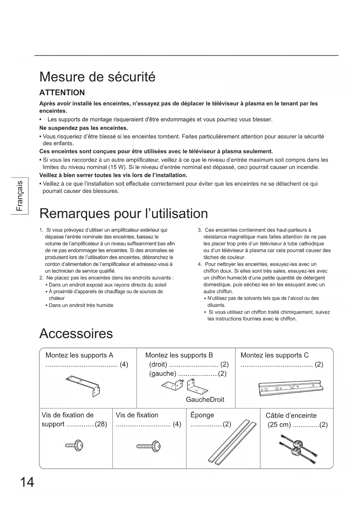 - Vous risqueriez d’être blessé si les enceintes tombent. Faites particulièrement attention pour assurer la sécurité des enfants. Ces enceintes sont conçues pour être utilisées avec le téléviseur à plasma seulement.