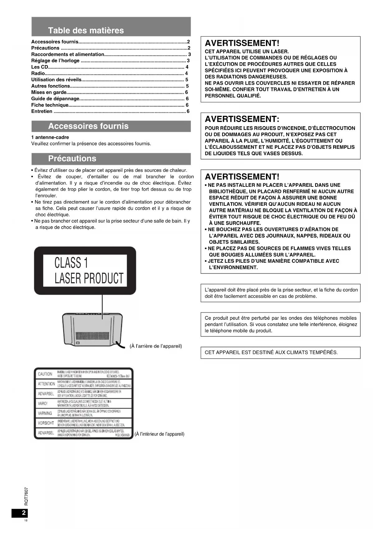 - Ne pas brancher cet appareil sur la prise secteur d’une salle de bain. Il y a risque de choc électrique. Table des matières Accessoires fournis Précautions CLASS 1 LASER PRODUCT (À l’arrière de l’appareil) (À l’intèrieur de l’appareil) AVERTISSEMENT! CET APPAREIL UTILISE UN LASER. L’UTILISATION DE COMMANDES OU DE RÉGLAGES OU L’EXÉCUTION DE PROCÉDURES AUTRES QUE CELLES SPÉCIFIÉES ICI PEUVENT PROVOQUER UNE EXPOSITION À DES RADIATIONS DANGEREUSES. NE PAS OUVRIR LES COUVERCLES NI ESSAYER DE RÉPARER SOI-MÊME. CONFIER TOUT TRAVAIL D’ENTRETIEN À UN PERSONNEL QUALIFIÉ.