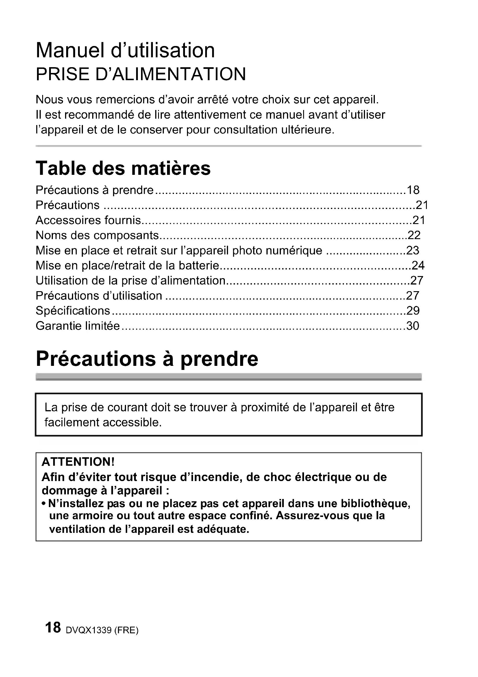 - Garantie limitée Précautions à prendre La prise de courant doit se trouver à proximité de l’appareil et être facilement accessible. ATTENTION! Afin d’éviter tout risque d’incendie, de choc électrique ou de dommage à l’appareil : p. 30