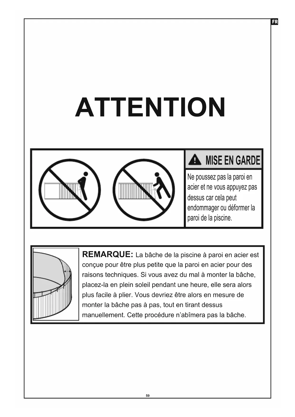 10 cm #04 #0859 Ne poussez pas la paroi en acier et ne vous appuyez pas dessus car cela peut endommager ou déformer la paroi de la piscine. REMARQUE: La bâche de la piscine à paroi en acier est conçue pour être plus petite que la paroi en acier pour des raisons techniques. Si vous avez du mal à monter la bâche, placez-la en plein soleil pendant une heure, elle sera alors plus facile à plier. Vous devriez être alors en mesure de monter la bâche pas à pas, tout en tirant dessus manuellement. Cette procédure n’abîmera pas la bâche. ATTENTION