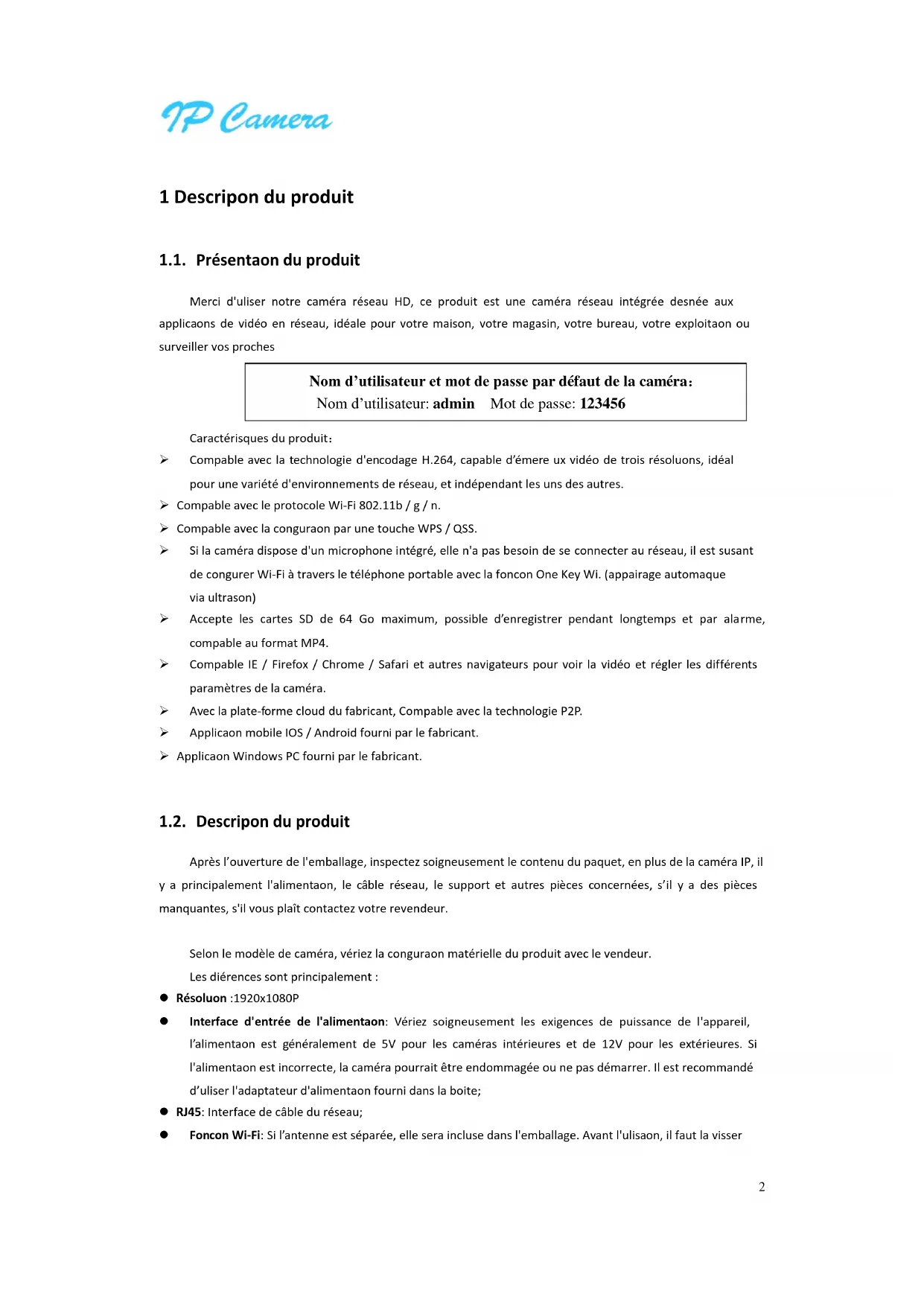 Caractéristiques du produit: Compatible avec la technologie d'encodage H.264, capable d’émettre flux vidéo de trois résolutions, idéal pour une variété d'environnements de réseau, et indépendant les uns des autres. Compatible avec le protocole Wi-Fi 802.11b / g / n. Compatible avec la configuration par une touche WPS / QSS. Si la caméra dispose d'un microphone intégré, elle n'a pas besoin de se connecter au réseau, il est suffisant de configurer Wi-Fi à travers le téléphone portable avec la fonction One Key Wifi. (appairage automatique via ultrason) Accepte les cartes SD de 64 Go maximum, possible d’enregistrer pendant longtemps et par alarme, compatible au format MP4. Compatible IE / Firefox / Chrome / Safari et autres navigateurs pour voir la vidéo et régler les différents paramètres de la caméra. Avec la plate-forme cloud du fabricant, Compatible avec la technologie P2P. Application mobile IOS / Android fourni par le fabricant. Application Windows PC fourni par le fabricant. 1.2. Description du produit Après l’ouverture de l'emballage, inspectez soigneusement le contenu du paquet, en plus de la caméra IP, il y a principalement l'alimentation, le câble réseau, le support et autres pièces concernées, s’il y a des pièces manquantes, s'il vous plaît contactez votre revendeur. Selon le modèle de caméra, vérifiez la configuration matérielle du produit avec le vendeur. Les différences sont principalement : Résolution :1920x1080P Interface d'entrée de l'alimentation: Vérifiez soigneusement les exigences de puissance de l'appareil, l’alimentation est généralement de 5V pour les caméras intérieures et de 12V pour les extérieures. Si l'alimentation est incorrecte, la caméra pourrait être endommagée ou ne pas démarrer. Il est recommandé d’utiliser l'adaptateur d'alimentation fourni dans la boite; RJ45: Interface de câble du réseau; Fonction Wi-Fi: Si l’antenne est séparée, elle sera incluse dans l'emballage. Avant l'utilisation, il faut la visser Nom d’utilisateur et mot de passe par défaut de la caméra: Nom d’utilisateur: admin Mot de passe: 1234563 sur la prise correspondante. Lumière infrarouge: La lumière infrarouge est utilisée pour l’éclairage de nuit de la caméra IP, l'œil humain ne peut pas la détecter. La luminosité et le nombre de diodes infrarouge détermine la distance d'éclairage. IR CUT:C’est un moyen de commutation de filtre, qui permet de basculer à un filtre différent pour le jour et la nuit. Cette fonction permet d’avoir un bon rendu de couleurs en toutes conditions de lumière Objectif: L’objectif permet la focalisation de l’image. La distance focale influence le champ de l’objectif. Plus la focale est courte, plus l’angle de vue est large Si l'image est floue, vous pouvez tourner doucement la lentille pour régler la mise au point et obtenir une bonne netteté ; SD : Certains modèles ont un slot de carte SD ou Micro SD, la capacité maximum est de 64GB ; MICRO : La caméra peut capturer le son sur place par le microphone intégré ; Haut-parleurs : Les haut-parleurs (à brancher sur la prise jack si le modèle en est pourvu) peuvent diffuser le son de démarrage de l’appareil, votre voix via votre smartphone à distance, le son d’alarme, etc. ; Entrée audio : S’il n'y a pas de microphone intégré, vous pouvez ajouter un microphone externe; Sortie audio : S’il n'y a pas de haut-parleurs intégrés, vous pouvez ajouter un haut-parleur externe ; Entrée alarme : Prise ou est connecté le capteur d’alarme. Vérifiez le niveau du signal du capteur, afin de déterminer si le capteur a détecté une anomalie; Sortie alarme : Prise ou est connecté l’appareil d’alarme externe (par exemple une sirène ou un gyrophare d’alarme). La mise en route se fera après détection d’anomalie (mouvement par exemple); Remise à zéro : En cas de besoin après le démarrage normal du système, appuyez sur le bouton de réinitialisation pendant 10 secondes ou plus, l’appareil se restaure aux paramètres d’usine et redémarre ; appuyez sur le bouton de réinitialisation pendant environ 3 secondes pour configurer Wi-Fi par WPS/QSS ; appuyez brièvement sur le bouton de réinitialisation, si l’appareil est connecté au Wi-Fi, alors l’indicateur de lumière de Wi-Fi clignote pendant quelques secondes. Il est possible de déterminer la force du signal Wi-Fi par la fréquence de clignotement, plus l’indicateur clignote rapidement, plus fort est le signal. ; Indicateur Wi-Fi: Le voyant bleu situé à l’arrière permet de voir l’état du signal Wi-Fi. tel que éteint, clignotement lent, clignotement rapide, brillant constant, etc.; LED « en fonction » : Le voyant rouge indique l’état de fonctionnement de l’appareil. Il peut être éteint, en clignotement lent, en clignotement rapide, etc. Lors de l’accès à la vidéo, l’indicateur clignote rapidement, sinon, il clignote lentement ;