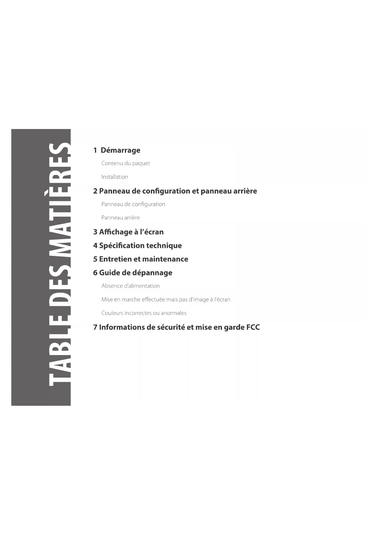 L238DPH Ecran LED 23.8” Full HDTABLE DES MATIÈRES 1 Démarrage Contenu du paquet Installation 2 Panneau de conguration et panneau arrière Panneau de conguration Panneau arrière 3 Achage à l’écran 4 Spécication technique 5 Entretien et maintenance 6 Guide de dépannage Absence d’alimentation Mise en marche eectuée mais pas d’image à l’écran Couleurs incorrectes ou anormales 7 Informations de sécurité et mise en garde FCC1 DÉMARRAGE Contenu du paquet