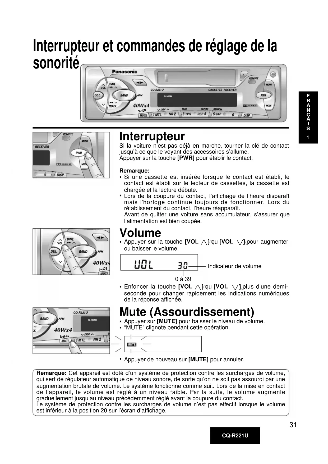 Remarque: Cet appareil est doté d’un système de protection contre les surcharges de volume, qui sert de régulateur automatique de niveau sonore, de sorte qu’on ne soit pas assourdi par une augmentation brutale de volume. Le système fonctionne comme suit. Lors de la mise en contact de l’appareil, le volume est réglé à un niveau faible. Par la suite, le volume augmente graduellement jusqu’au niveau précédemment réglé avant la coupure du contact. Le système de protection contre les surcharges de volume n’est pas effectif lorsque le volume est inférieur à la position 20 sur l’écran d’affichage.CQ-R221U