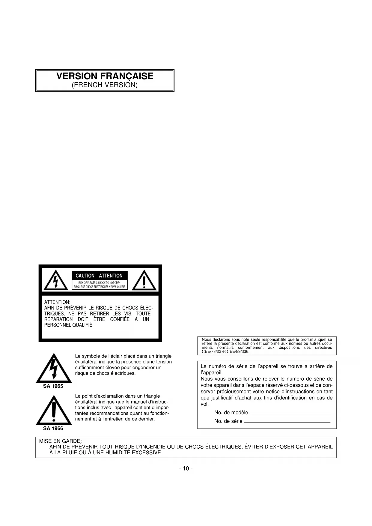 (FRENCH VERSION) CAUTION ATTENTION RISK OF ELECTRIC SHOCK DO NOT OPENRISQUE DE CHOCS ELECTRIQUES NE PAS OUVRIR ATTENTION: AFIN DE PRÉVENIR LE RISQUE DE CHOCS ÉLEC- TRIQUES, NE PAS RETIRER LES VIS. TOUTE RÉPARATION DOIT ÊTRE CONFIÉE À UN PERSONNEL QUALIFIÉ. SA 1965 SA 1966 Le symbole de l’éclair placé dans un triangle équilatéral indique la présence d’une tension suffisamment élevée pour engendrer un risque de chocs électriques. Le point d’exclamation dans un triangle équilatéral indique que le manuel d’instruc- tions inclus avec l’appareil contient d’impor- tantes recommandations quant au fonction- nement et à l’entretien de ce dernier. Le numéro de série de l’appareil se trouve à arrière de l’appareil. Nous vous conseillons de relever le numéro de série de votre appareil dans l’espace réservé ci-dessous et de con- server précieusement votre notice d’instruactions en tant que justificatif d’achat aux fins d’identification en cas de vol. No. de modèle No. de série MISE EN GARDE: AFIN DE PRÉVENIR TOUT RISQUE D’INCENDIE OU DE CHOCS ÉLECTRIQUES, ÉVITER D’EXPOSER CET APPAREIL À LA PLUIE OU À UNE HUMIDITÉ EXCESSIVE. Nous déclarons sous note seule responsabilité que le produit auquel seréfère la présente déclaration est conforme aux normes ou autres docu-ments normatifs conformément aux dispositions des directivesCEE/73/23 et CEE/89/336.- 11 -