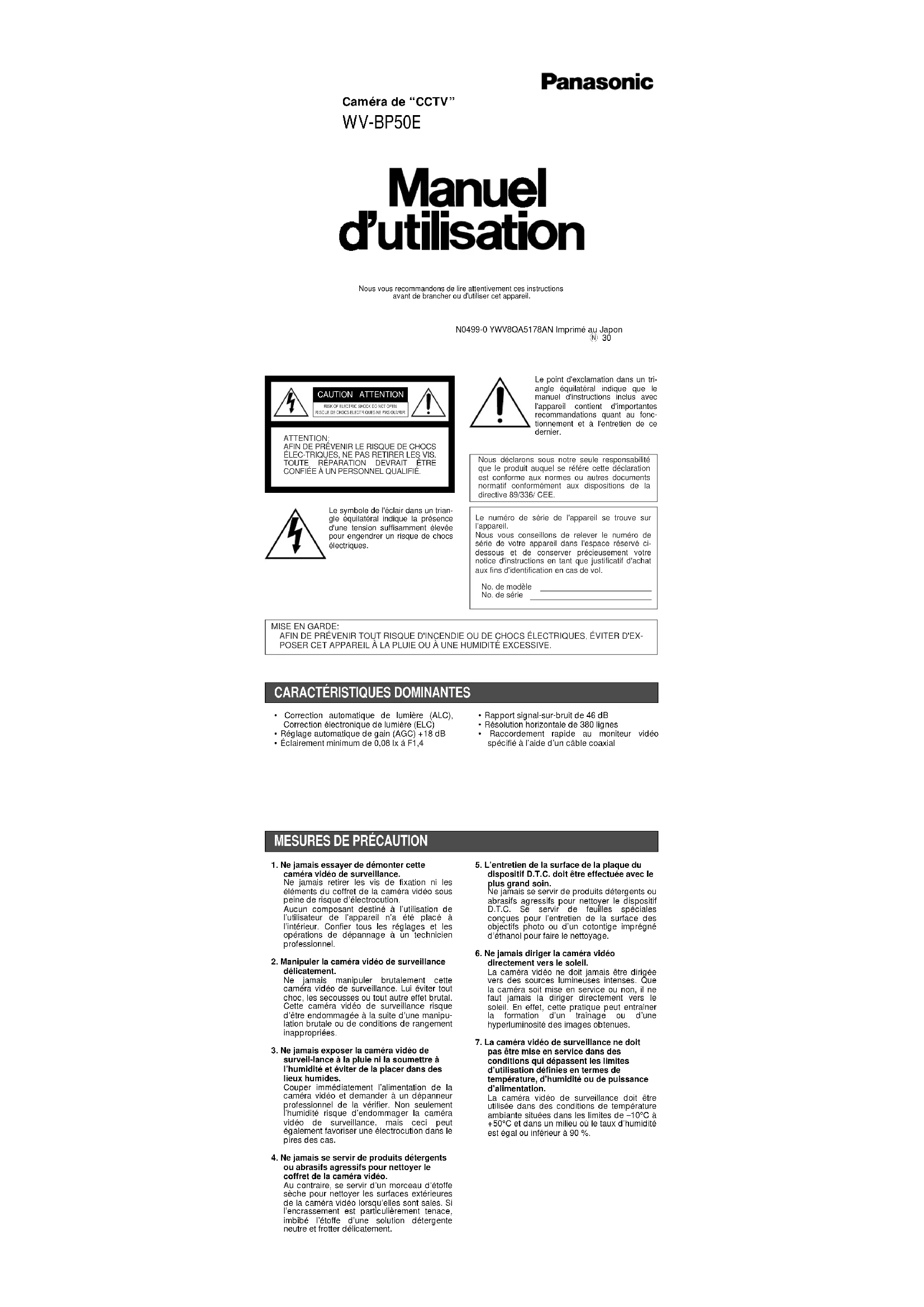 pas être mise en service dans des conditions qui dépassent les limites d’utilisation définies en termes de température, d’humidité ou de puissance d’alimentation. La caméra vidéo de surveillance doit être utilisée dans des conditions de température ambiante situées dans les limites de –10°C à +50°C et dans un milieu où le taux d’humidité est égal ou inférieur à 90 %. Caméra de “CCTV” WV-BP50E N0499-0 YWV8QA5178AN Imprimé au Japon N 30 Nous vous recommandons de lire attentivement ces instructionsavant de brancher ou d'utiliser cet appareil. Le symbole de l'éclair dans un trian- gle équilatéral indique la présence d'une tension suffisamment élevée pour engendrer un risque de chocs électriques. Le point d'exclamation dans un tri- angle équilatéral indique que le manuel d'instructions inclus avec l'appareil contient d'importantes recommandations quant au fonc- tionnement et à l'entretien de ce dernier. CAUTION ATTENTION RISK OF ELECTRIC SHOCK DO NOT OPENRISQUE DE CHOCS ELECTRIQUES NE PAS OUVRIR ATTENTION: AFIN DE PRÉVENIR LE RISQUE DE CHOCS ÉLEC-TRIQUES, NE PAS RETIRER LES VIS.