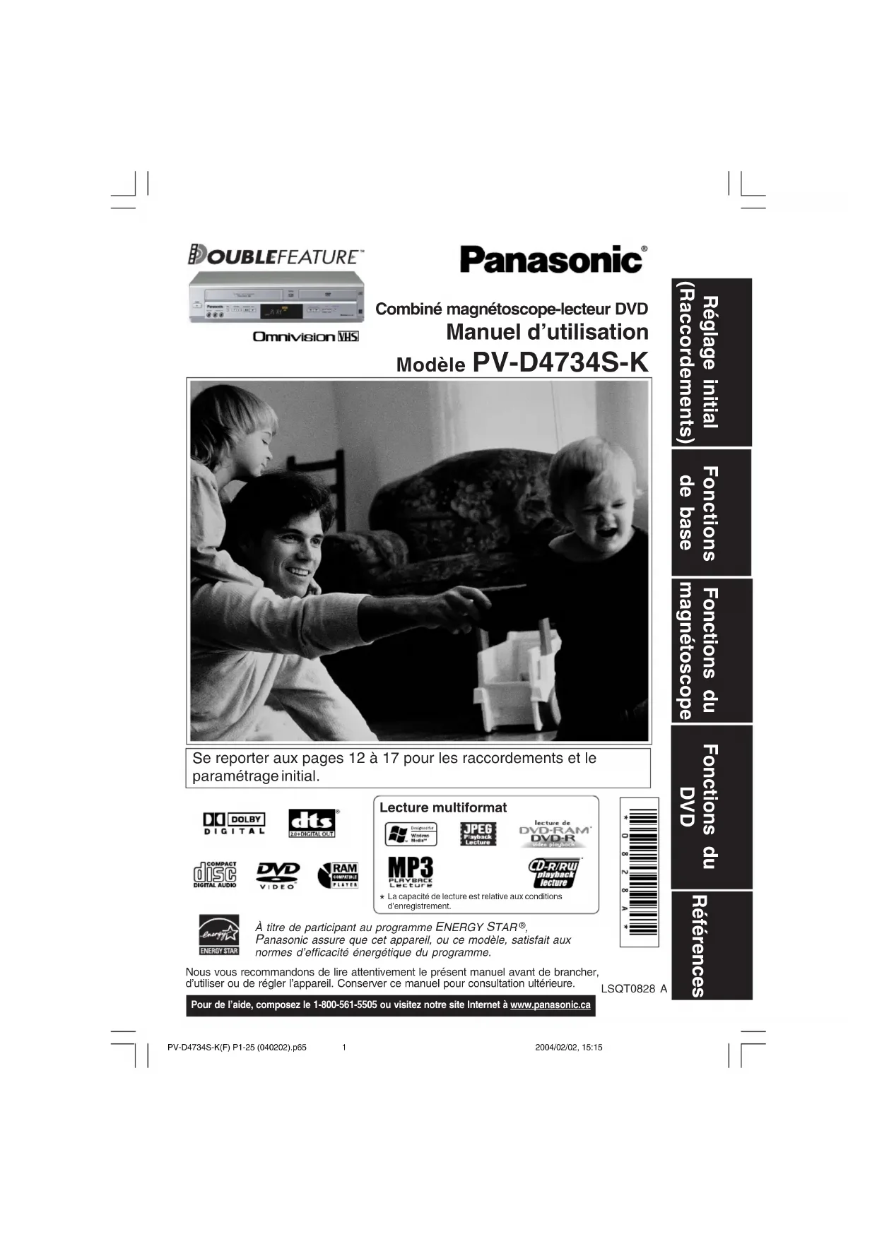 Printed in Indonesia LSQT0828 A S0104-1024 D4734S-K P36-64 (040202).p65 2004/02/02, 15:1364Combiné magnétoscope-lecteur DVD Manuel d’utilisation Modèle PV-D4734S-K Se reporter aux pages 12 à 17 pour les raccordements et leparamétrage initial.Nous vous recommandons de lire attentivement le présent manuel avant de brancher, d’utiliser ou de régler l’appareil. Conserver ce manuel pour consultation ultérieure. Pour de l’aide, composez le 1-800-561-5505 ou visitez notre site Internet à www.panasonic.ca Réglage initial (Raccordements) Fonctions de base Fonctions du magnétoscope Fonctions du DVD Références LSQT0828 AÀ titre de participant au programme NERGY