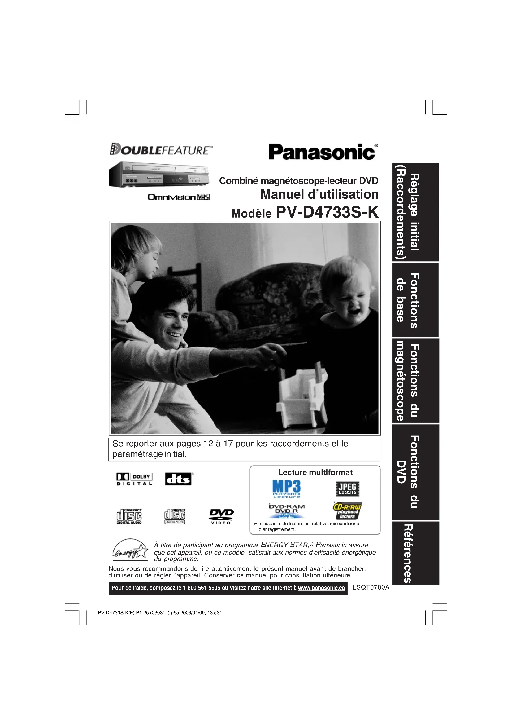 anasonic assure que cet appareil, ou ce modèle, satisfait aux normes d’efficacité énergétique du programme.Nous vous recommandons de lire attentivement le présent manuel avant de brancher, d’utiliser ou de régler l’appareil. Conserver ce manuel pour consultation ultérieure. Pour de l’aide, composez le 1-800-561-5505 ou visitez notre site Internet à www.panasonic.ca Réglage initial (Raccordements) Fonctions de base Fonctions du magnétoscope Fonctions du DVD Références Lecture multiformat