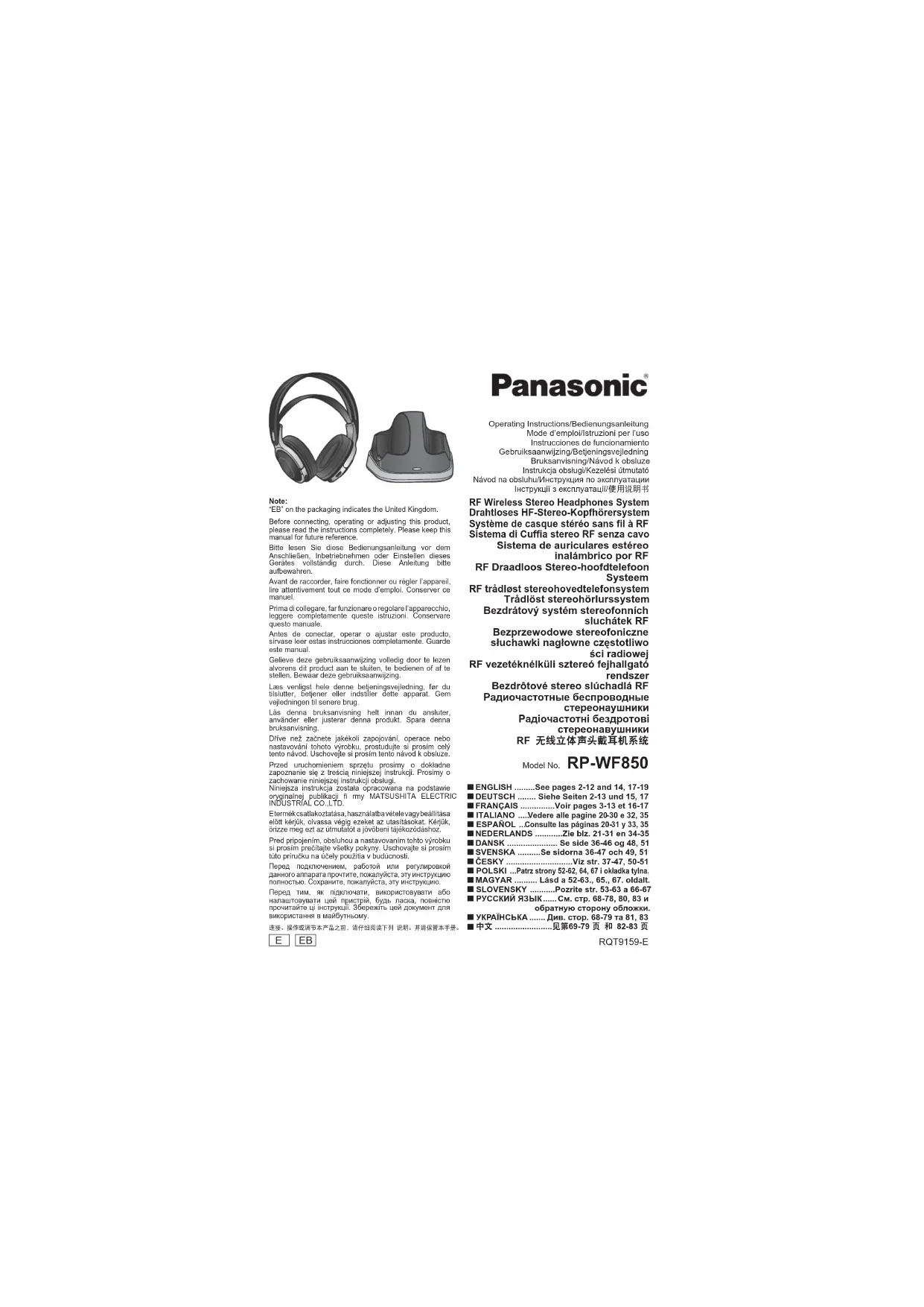 - Also available through our Internet is direct shop- ping for a wide range of fi nished products, take a browse on our website for further details. Interested in purchasing an extended guarantee? Please call 0870 240 6284 or visit our website www.panasonic.co.uk/guarantee. Information on Disposal for Users of Waste Electrical & Electronic Equipment (private households) This symbol on the products and/or accompanying documents means that used electrical and electronic products should not be mixed with general household waste.For proper treatment, recovery and recycling, please take these products to designated collection points, where they will be accepted on a free of charge basis. Alternatively, in some countries you may be able to return your products to your local retailer upon the purchase of an equivalent new product. Disposing of this product correctly will help to save valuable resources and prevent any potential negative effects on human health and the environment which could otherwise arise from inappropriate waste handling. Please contact your local authority for further details of your nearest designated collection point.Penalties may be applicable for incorrect disposal of this waste, in accordance with national legislation. For business users in the European Union If you wish to discard electrical and electronic equipment, please contact your dealer or supplier for further information. Information on Disposal in other Countries outside the European Union This symbol is only valid in the European Union.If you wish to discard this product, please contact your local authorities or dealer and ask for the correct method of disposal. Informations relatives à l’évacuation des déchets, destinées aux utilisateurs d’appareils électriques et électroniques (appareils ménagers domestiques) Lorsque ce symbole fi gure sur les produits et/ou les documents qui les accompagnent, cela signifi e que les appareils électriques et électroniques ne doivent pas être jetés avec les ordures ménagères.Pour que ces produits subissent un traitement, une récupération et un recyclage appropriés, envoyez-les dans les points de collecte désignés, où ils peuvent être déposés gratuitement. Dans certains pays, il est possible de renvoyer les produits au revendeur local en cas d’achat d’un produit équivalent.En éliminant correctement ce produit, vous contribuerez à la conservation des ressources vitales et à la prévention des éventuels effets négatifs sur l’environnement et la santé humaine qui pourraient survenir dans le cas contraire.Afi n de connaître le point de collecte le plus proche, veuillez contacter vos autorités locales.Des sanctions peuvent être appliquées en cas d’élimination incorrecte de ces déchets, conformément à la législation nationale. Utilisateurs professionnels de l’Union européenne Pour en savoir plus sur l’élimination des appareils électriques et électroniques, contactez votre revendeur ou fournisseur. Informations sur l’évacuation des déchets dans les pays ne faisant pas partie de l’Union européenne Ce symbole n’est reconnu que dans l’Union européenne.Pour vous débarrasser de ce produit, veuillez contacter les autorités locales ou votre revendeur afi n de connaître la procédure d’élimination à suivre. ENGLISH DEUTSCHFRANÇAISRQT9159 RQT9159