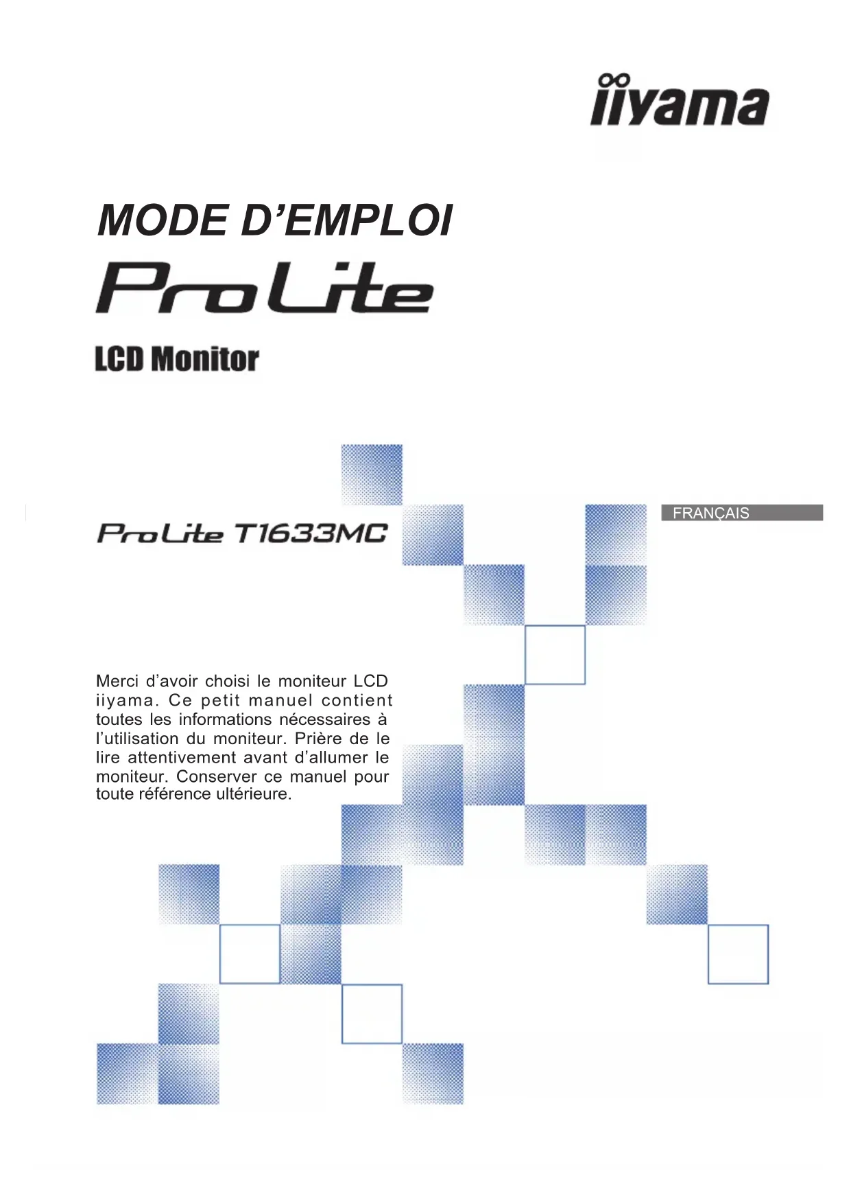 Merci d’avoir choisi le moniteur LCD iiyama. Ce petit manuel contient toutes les informations nécessaires à l’utilisation du moniteur. Prière de le lire attentivement avant d’allumer le moniteur. Conserver ce manuel pour toute référence ultérieure.FRANÇAIS