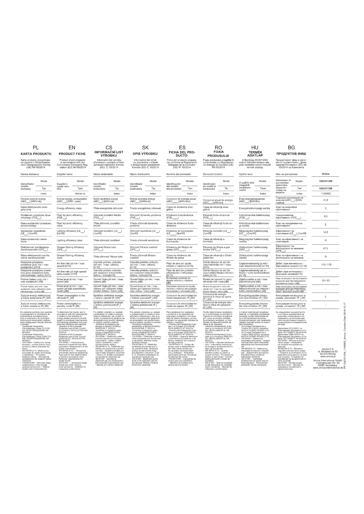 ) [W] Carte du produit préparée conformément au Règlement Délégué (UE) Nº 65/2014 de la Commission Conformément aux exigences quand à l’étiquetage énergétique et par rapport aux exigences concernant les éco-projets les méthodes de calcul et de mesure suivantes ont été appliquées pour établir les résultats : - Directive du Parlement Européen et de la Commission 2010/30/UE ; REGLEMENT Nº 65/2014, - Directive du Parlement Européen et de la Commission 2009/125/ CE ; REGLEMENT Nº 66/2014, - EN 50564 – Equipement élec- trique domestique – mesure de la consommation en énergie en état de disposition au travail. - EN 60704-2-13 – Appareils électriques à utilité domestique et similaires -- Procédure de mesure de la puissance acoustique – Exigences particulières pour les hottes. - EN 61591 – Hottes domestiques et autres extracteurs de vapeurs de cuisine – Méthodes de tests des traits fonctionnels. FR NL DA SV PRODUCTKAART Naam van de leverancier Typeaan- duiding van het model van de leve- rancier Model Type Index Het jaarlijkse energieverbru- ik (AEC afzuigkap ) [kWh/rok] Energie-eciëntieklasse De hydrodynamische eciëntie (FDE afzuigkap